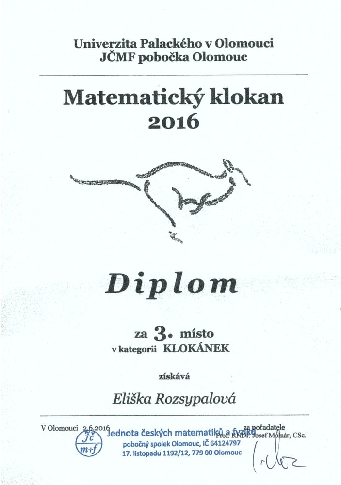 Výsledky Matematického Klokana v okresním kole Gratulujeme Barboře Dostálové za dělené 1. místo v kategorii Cvrček a Aničce Lajšnerové za 2. místo v kategorii Kadet.