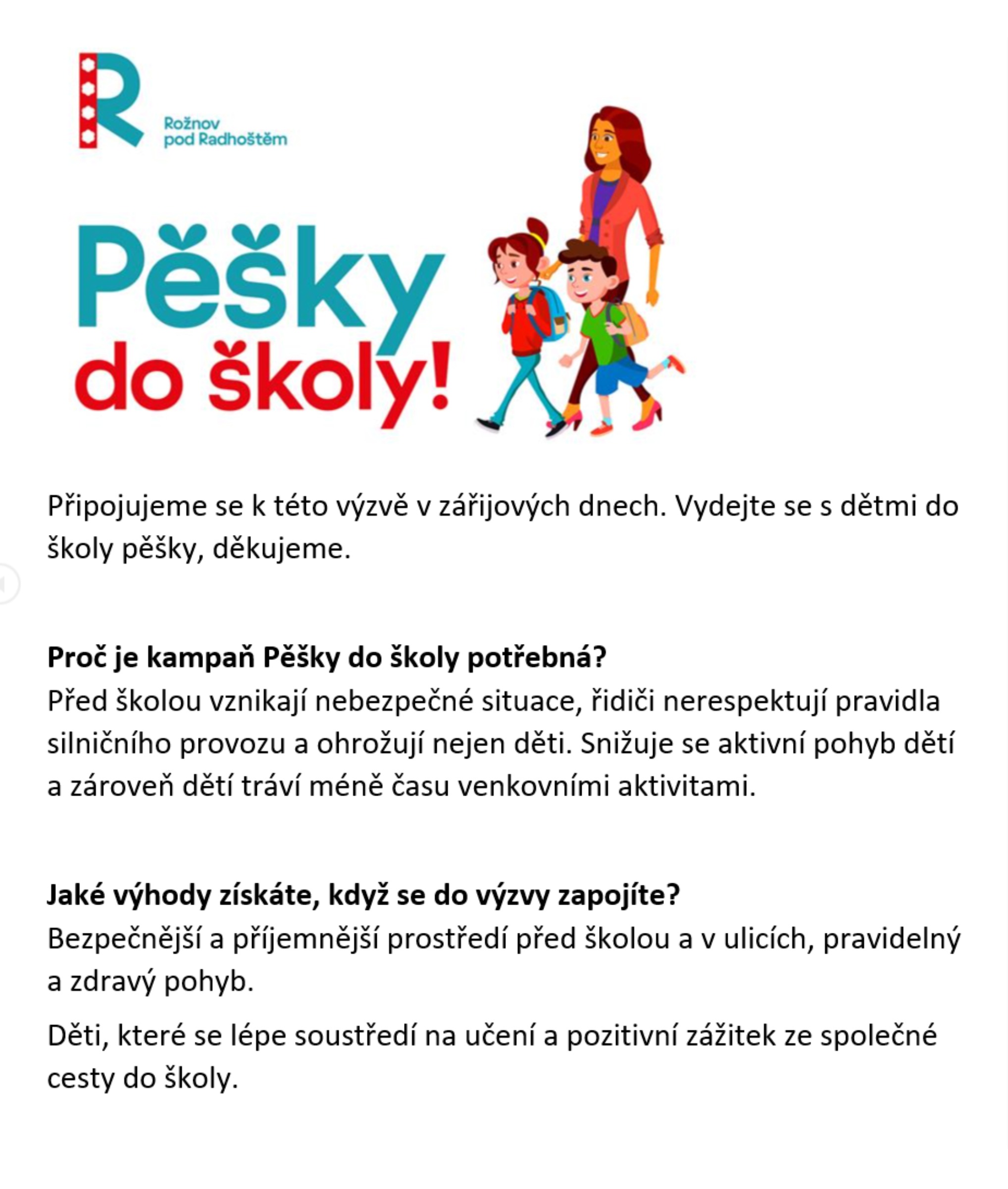 Připojujeme se k výzvě "Pěšky do školy" v zářijových dnech. Vydejte se s dětmi do školy pěšky, děkujeme.