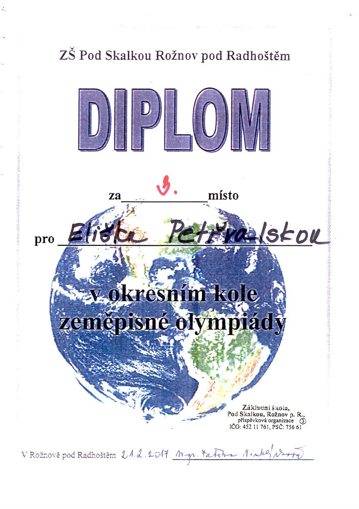 Okresní kolo zeměpisné olympiády Gratulujeme Elišce Petřvalské za 3. místo v zeměpisné olympiádě!