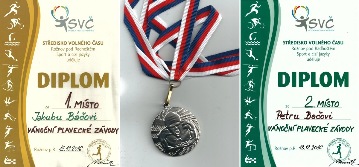 Vánoční plavecké závodyRádi bychom pochválili všechny mladé plavce Matyáše Baroše, Sáru Posadovou, Evu Danielovou a Štěpána Veselku, kteří v bazéně dosáhli krásných úspěchů. Vánoční plavecké závody pořádalo Středisko volného času v Rožnově p. R.