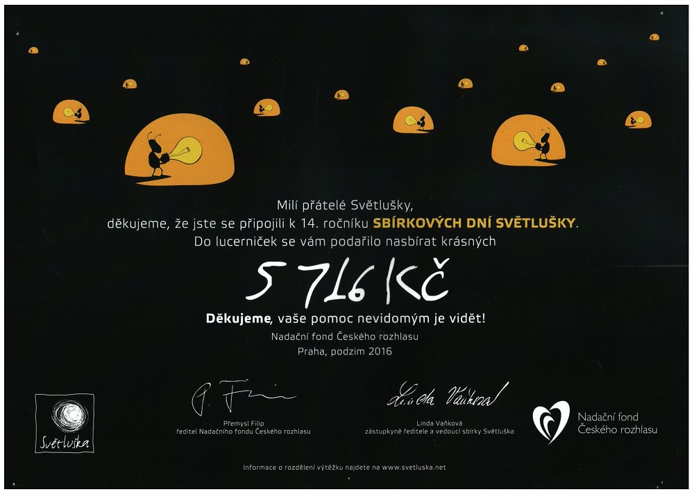 I letos jsme se rozhodli podpořit sbírkové dny pro Světlušku. Ve dvou dnech naši žáci nabídli možnost přispět - veřejnosti, rodičům i žákům. Na podporu nevidomým jsme odeslali 5 716 Kč. Děkujeme, vaše pomoc je vidět.