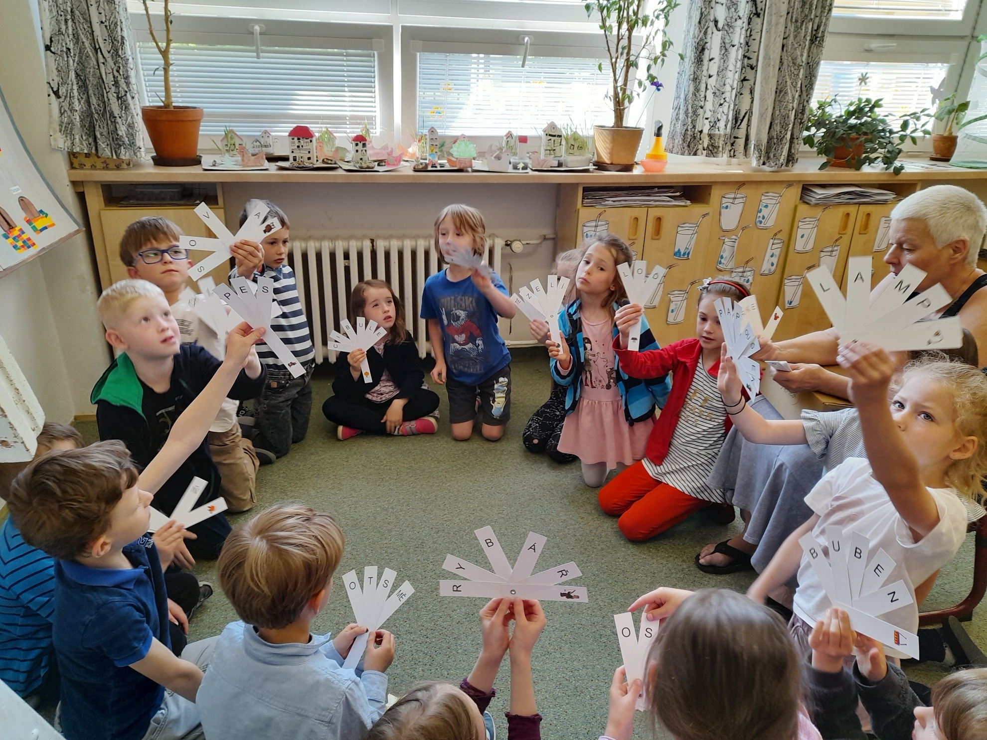 První školní den je za námi! Počasí nám příliš nepřálo, proto jsme se venku pouze přivítali, zazpívali si tradiční úvodní píseň Školní rok držíme, představili se, rozdali třídám barevné stuhy (z těch nakonec vznikl pestrý květ zavěšený v proutěném domku na zahradě) - a pak už alou do tříd! Tam to byl zážitek pochopitelně především pro prvňáčky a jejich rodiče. Tak ať se nám to všem letos spolu vydaří!
