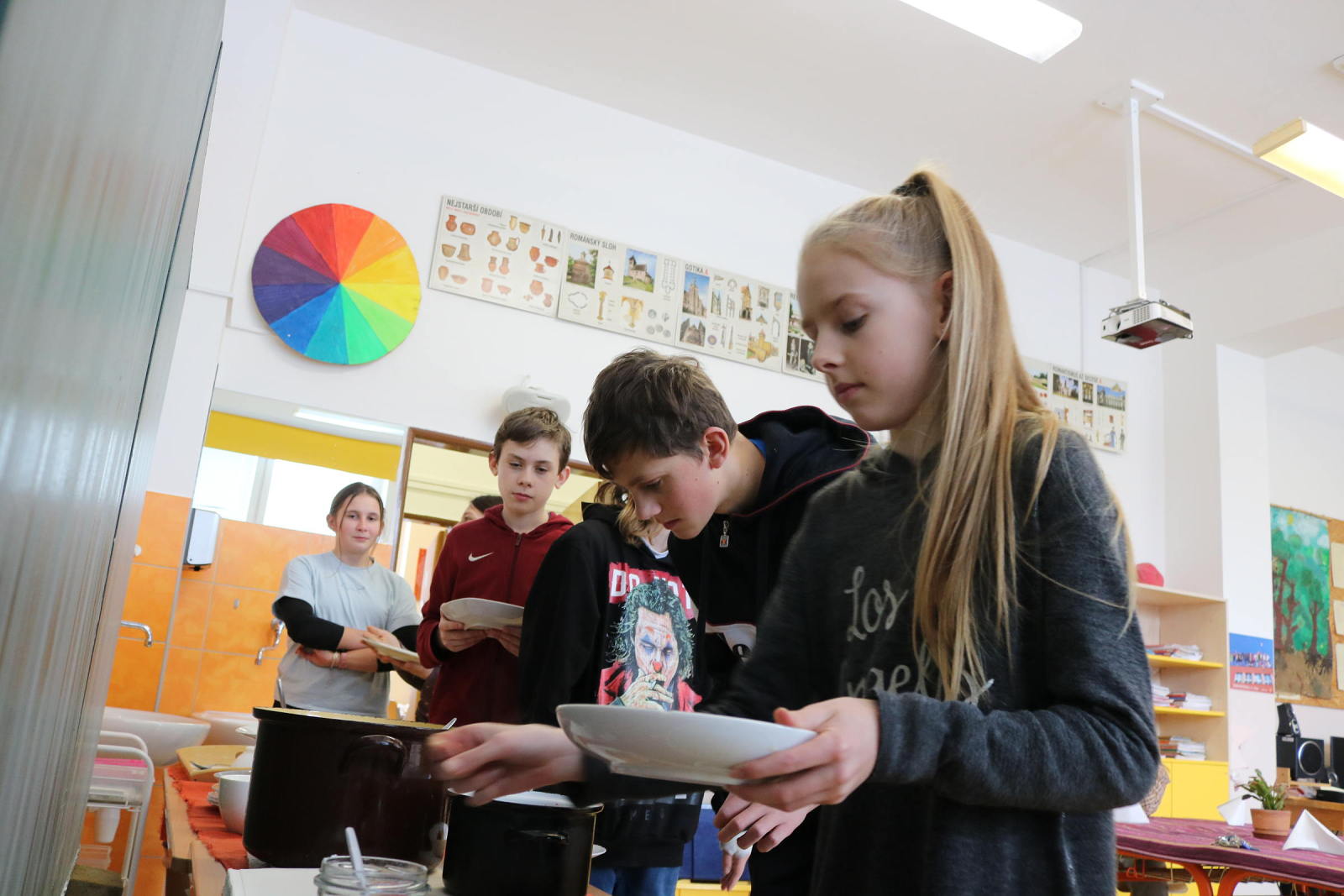 Nejenom láska, ale i poznávání valašských tradic prochází žaludkem. Sedmačky a sedmáci se chopili vařečky a vytvořili třichodové menu z místních surovin podle starých receptů. Školou zavoněla kyselica, kontrabáš (tak tohle jídlo jsme neznali!) a lívance s lesním ovocem, které vznikly v režii chlapců. O tom, že se nám jídlo podařilo, svědčil i fakt, že si všichni došli pro nášup. Kateřina a kluci a holky ze sedmé třídy