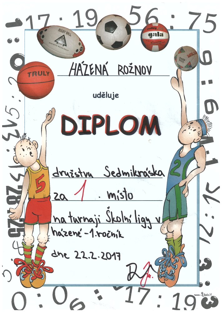 Gratulujeme družstvu prvňáků, kteří zvítězili ve Školní lize 1. ročníků v házené.
