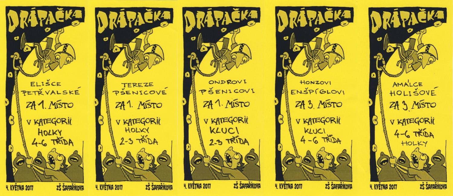 Dne 29.11.2018 se na ZŠ Šafaříkova ve Valašském Meziříčí uskutečnil další ročník boulderových závodů v lezení na obtížnost - Drápačka. Letos Sedmikráska vyslala mix zkušenějších lezců a "prvozávodníků". Všichni se letos s obzlášť těžkými cestami vypořádali skvěle ...