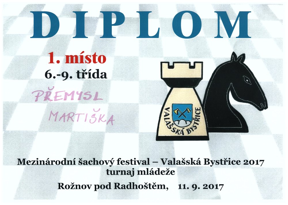 Soutěže v šachuGratulujeme Přemkovi Martiškovi za první místo v Mikulášském turnaji v šachu a především za vítězství v Okresní Mládežnické lize 2019/2020 v rapid šachu.