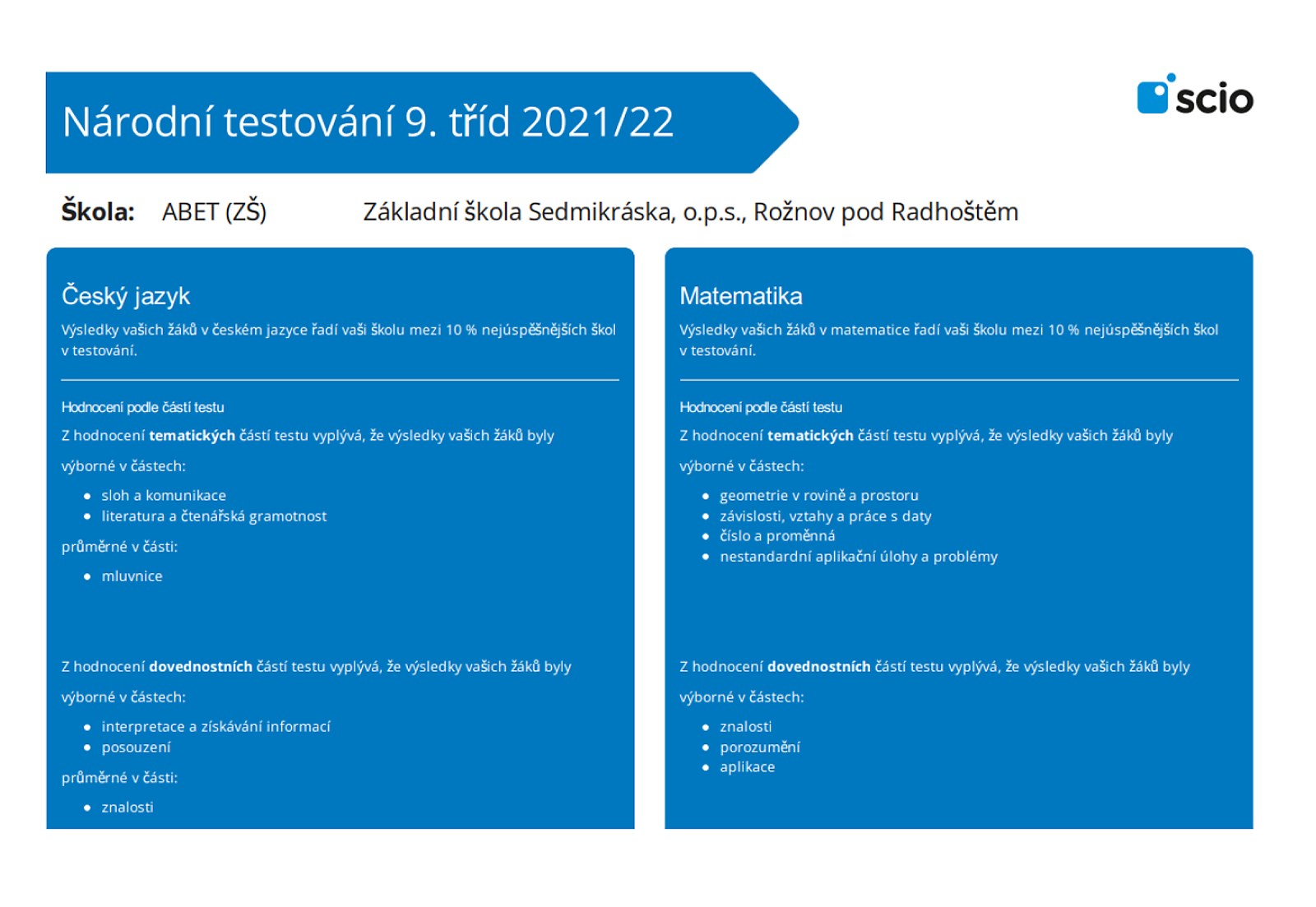 Žáci 9. ročníku se na podzim jako každoročně zúčastnili SCIO testování s cílem zjistit stav vědomostí a dovedností budoucích absolventů a připravit se na přijímací zkoušky. Celkově se testování zúčastnilo okolo 16 058 žáků devátých tříd.Výsledky našich žáků i po výuce distančním způsobem jsou excelentní.