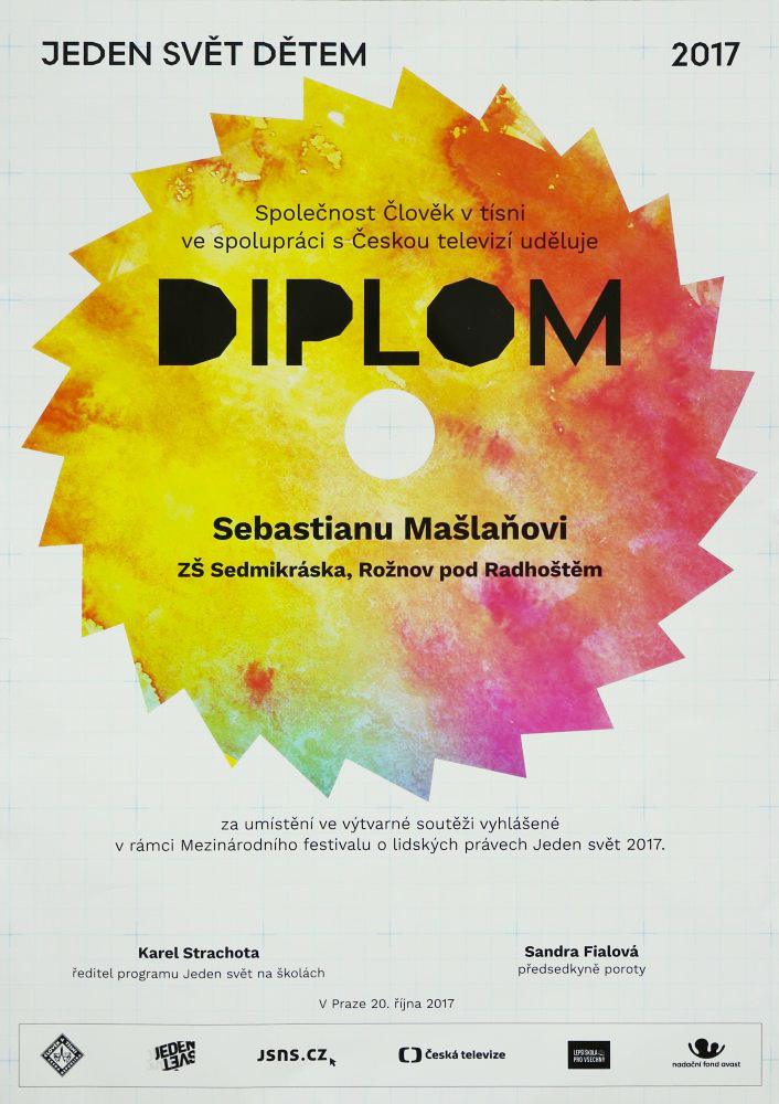Ocenění výtvarné práce Žák naší školy Sebastian získal ocenění ve výtvarné soutěži JEDEN SVĚT DĚTEM určenou žákům do 13 let. Zadání soutěže bylo jednoduché - nakreslit obrázek k filmu z kategorie Jeden svět dětem, který žáci viděli v rožnovském kině na školních projekcích.