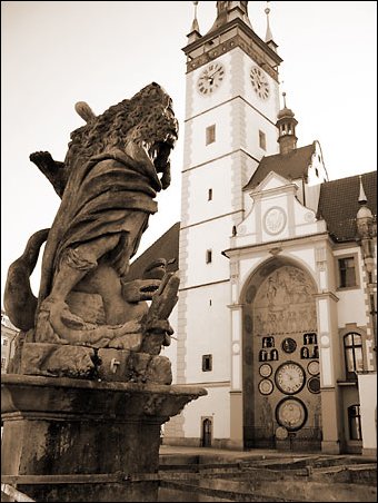 Zleva: barokní kašna, renesanční věž a socialistický orloj