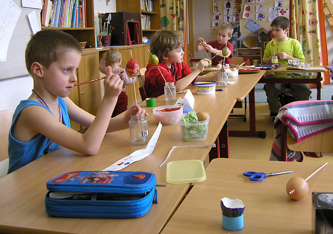 Velikonoční přípravy bereme již léta vážně. Na snímcích můžete shlédnout chlapecké společné pletení tatarů na břehu Bečvy (děvčata prvního stupně v té době zdobila různými způsoby kraslice a tvořila jarní zeleninové mandaly) a sváteční výzdobu první třídy.