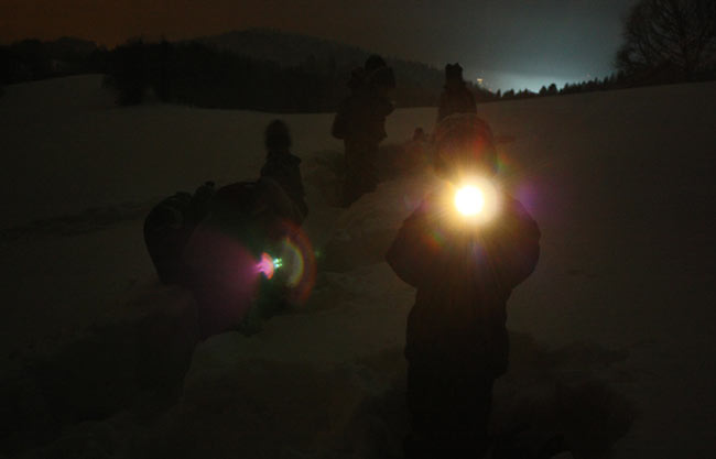 Již podruhé jsme se vydali do školy ve večerních hodinách, abychom v ní přespali. Vzali jsme to oklikou z Vigantic po cestách a loukách, nebylo by na tom nic zvláštního, nebýt tmy a třičtvrti metru sněhu. To dodalo výpravě na dobrodružnosti, všichni šlapali jako stroje, především Dáda a Luky by se mohli pyšnit přezdívkou "Buldozer". Do školy jsme dorazili v devět hodin s vidinou pořádného jídla, pití a vyhřátého spacáku.