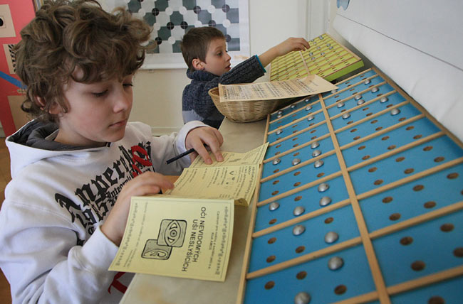 Čtvrťáci navštívili (také na doporučení prvňáků) výstavu ve Valašském Meziříčí. Výstava byla sice připravena ke 100. výročí založení místního Ústavu pro neslyšící, avšak na své si během této interaktivní výstavy přišly smysly všechny – fotografie to dosvědčují.