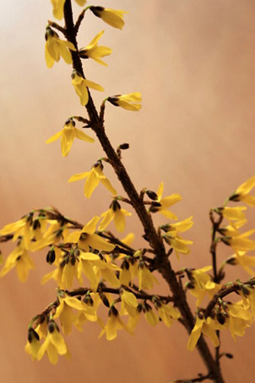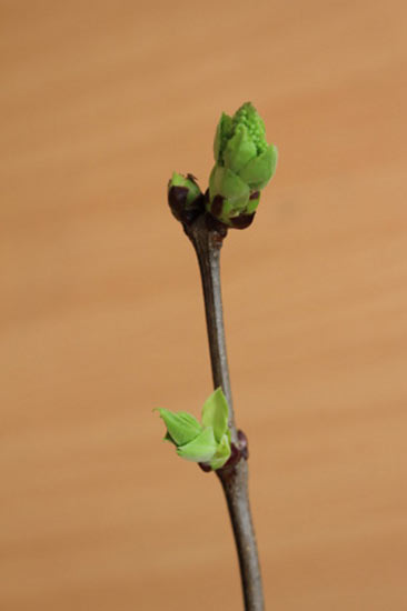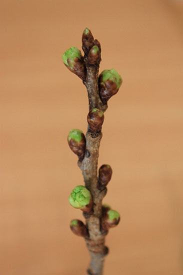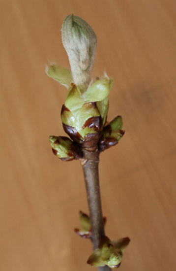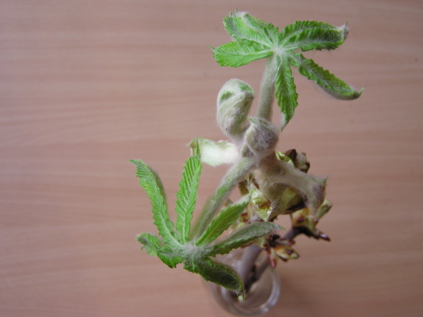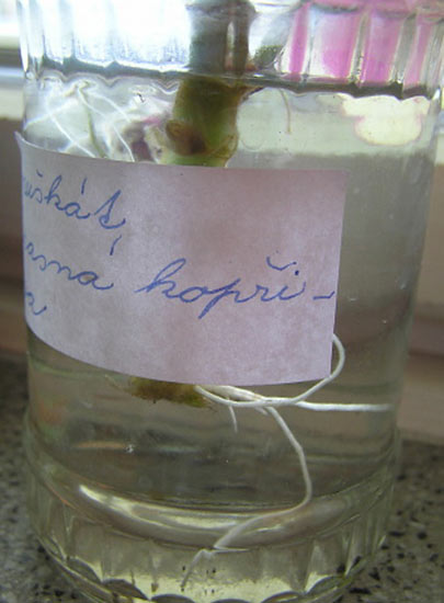 Jitka donesla do kroužku větvičky keřů a stromů a dala je do vody. Asi dva měsíce jsme je pozorovali, malovali a učili se je poznávat. Za týden rozkvetla zlatice a líska (ta má samčí a samičí květy), potom třešeň a jabloň. Poupata se objevily na bezu a šeříku, listy vyrašily na švestce, jírovci a hlohu. Žádná změna nebyla na větvičce vlašského ořechu, lípy a habru. Bylo to velmi zajímavé. (Klárka)