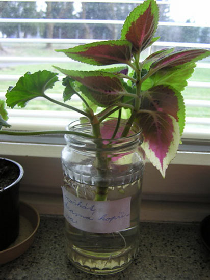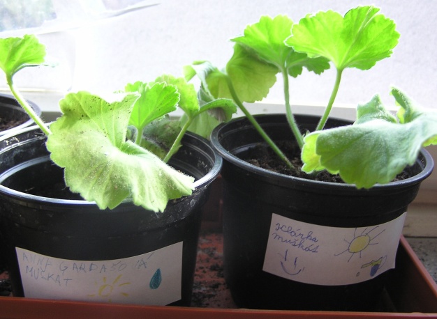 Nejdřív jsem vzala už vyrostlý muškát a ustřihla jsem část rostliny se stonkem a listama. Dala jsem to do vody, tam se vytvořily asi za dva týdny kořínky. Potom jsem zasadila muškát do květináče, dala k oknu a zalévám. (Anička G.)