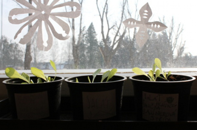 Semínko salátu (světlé, maličké) jsem dala do květináče s hlínou na výsev. Zalila jsem ho a dala na okno. Za týden se objevila malá rostlinka. Teď už má pořádné listy asi deset centimetrů dlouhé. Brzy ho ochutnáme. Ven salát nepřesadíme, protože v březnu by ještě mohl zmrznout. (Kája)