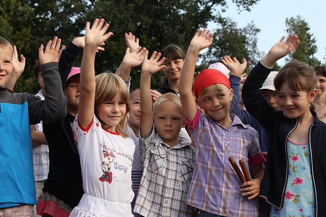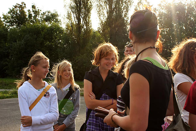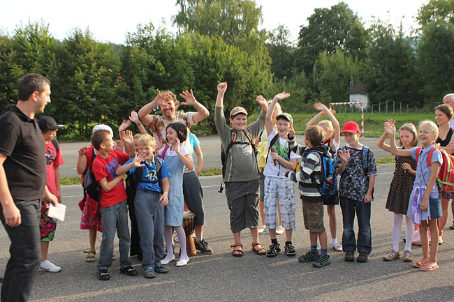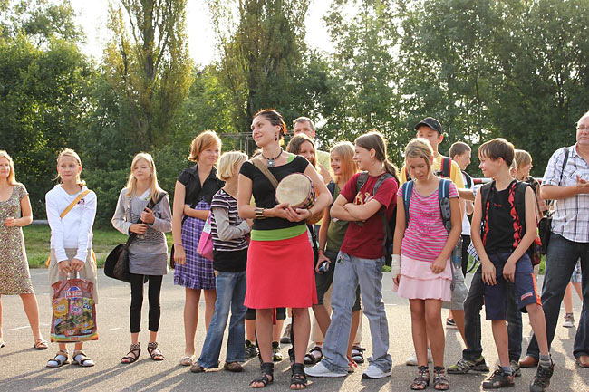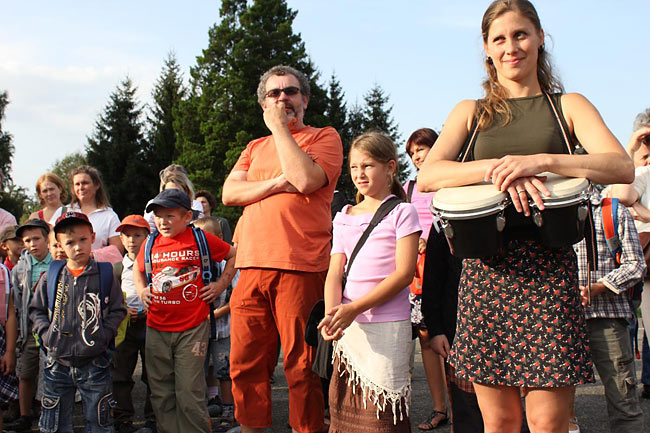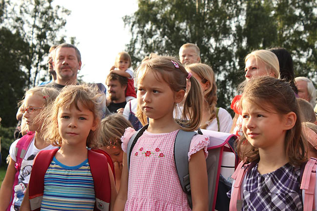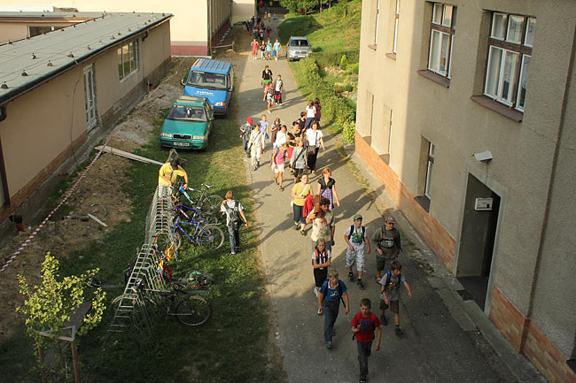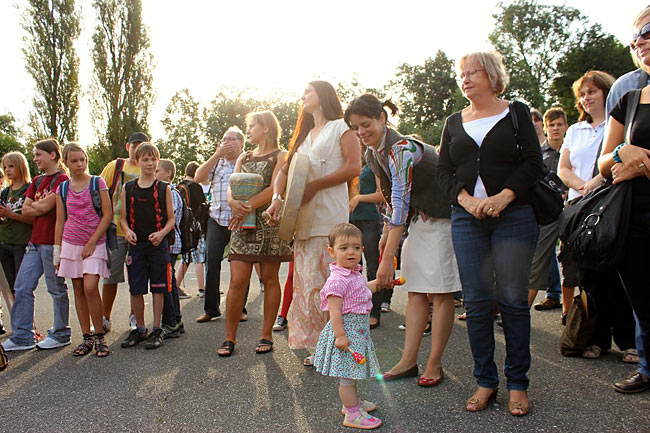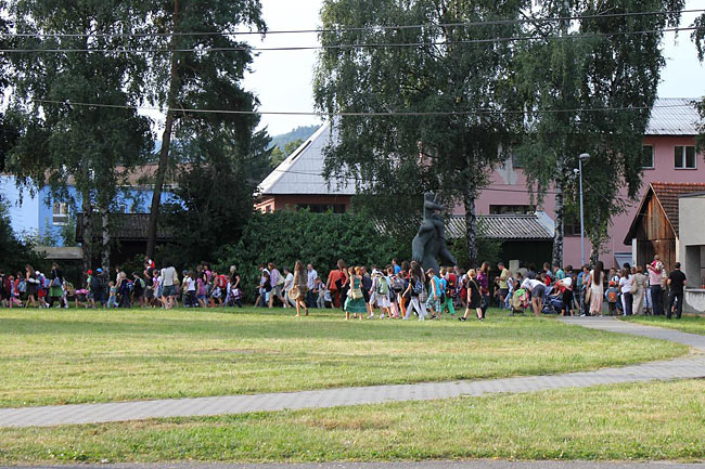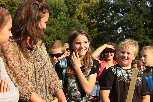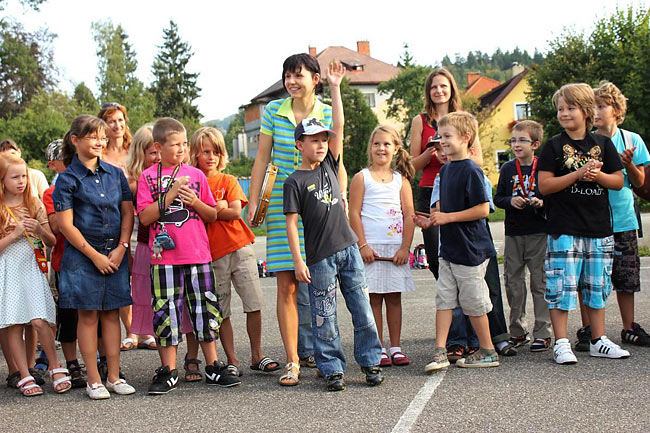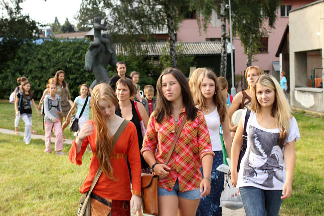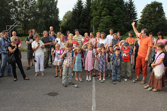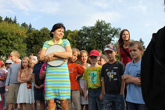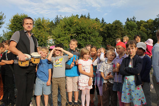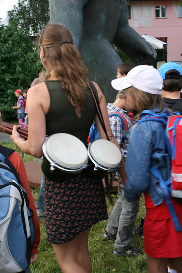 Kvůli stavebnímu ruchu ve školním komplexu jsme se sešli u sochy sv. Kryštofa a společně se odebrali na hřiště. Tentokrát jsme školní rok nastartovali v hudebním duchu, což trochu souviselo s čerstvě vydaným cédéčkem "Písničky ze Sedmikrásky".