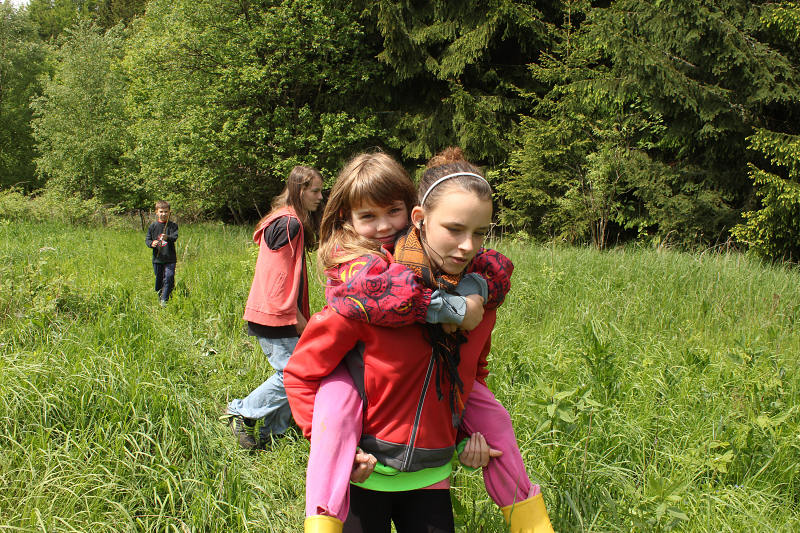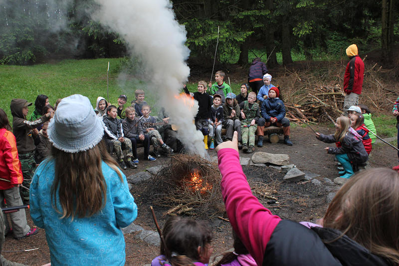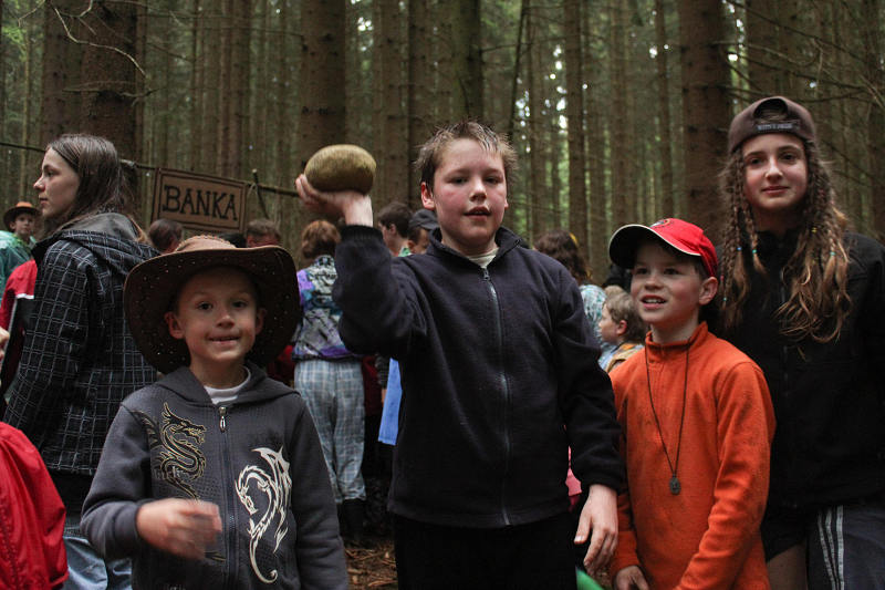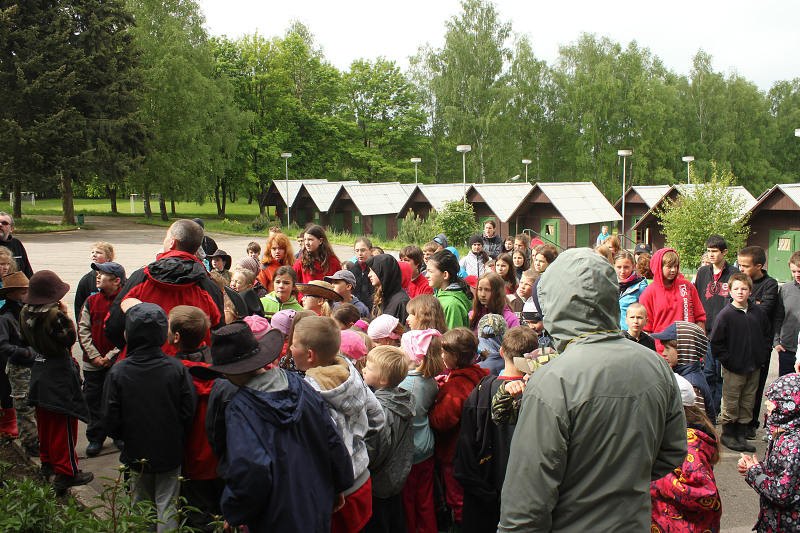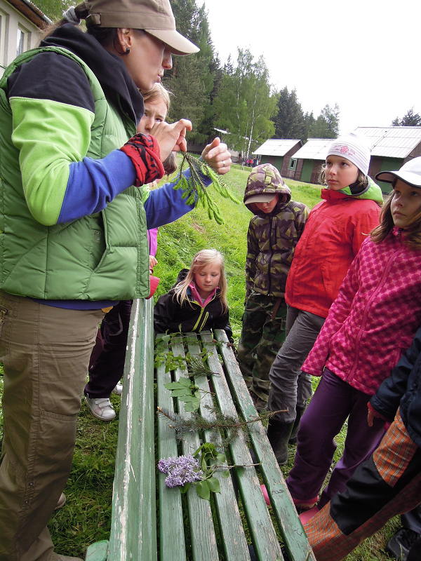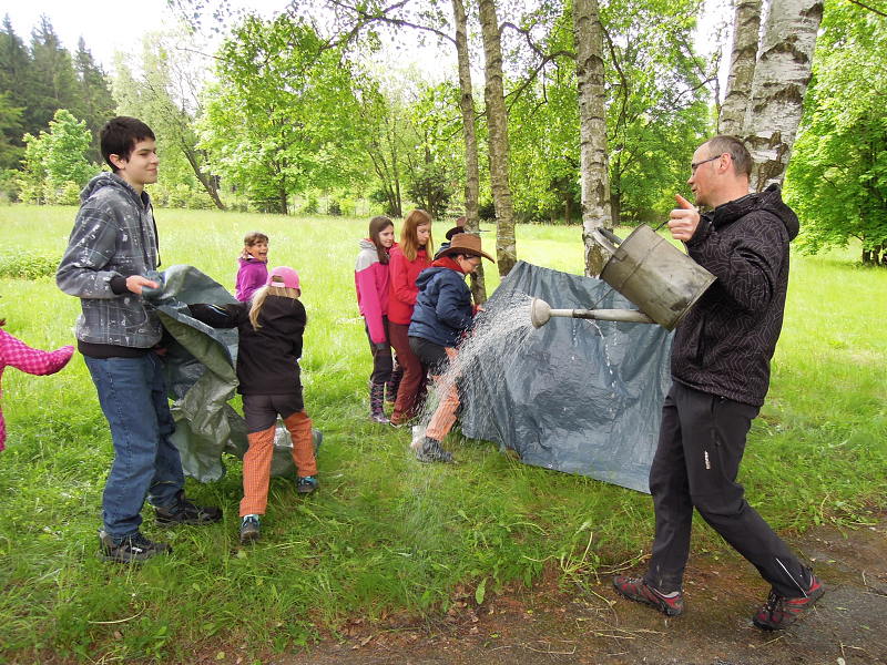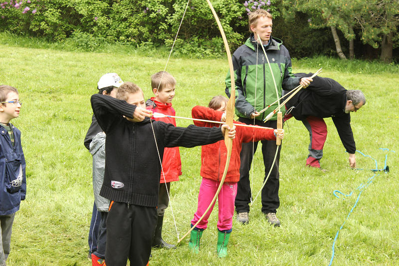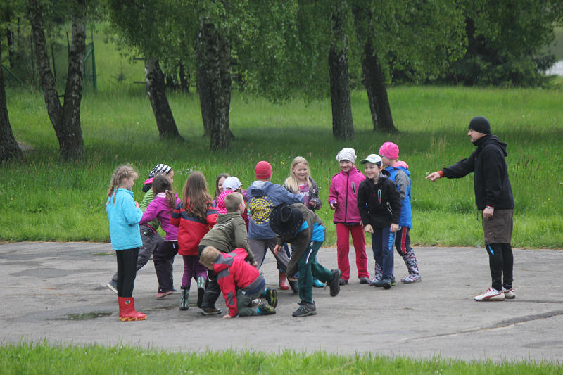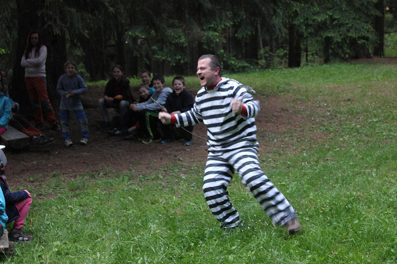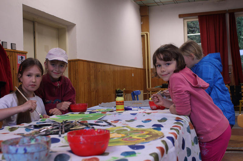 Po příjezdu se všichni ubytovali a seznámili se s prostředím tábora. Jeho okolí jsme propátrali v rámci prověřené obálkové hry – postavičky v barevných pláštěnkách putovaly lesy a loukami a plnily vylosované úkoly. K večeru bylo dost času na sport či výtvarnou činnost, pro ty větší byla připravena noční hra.