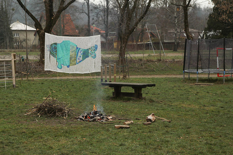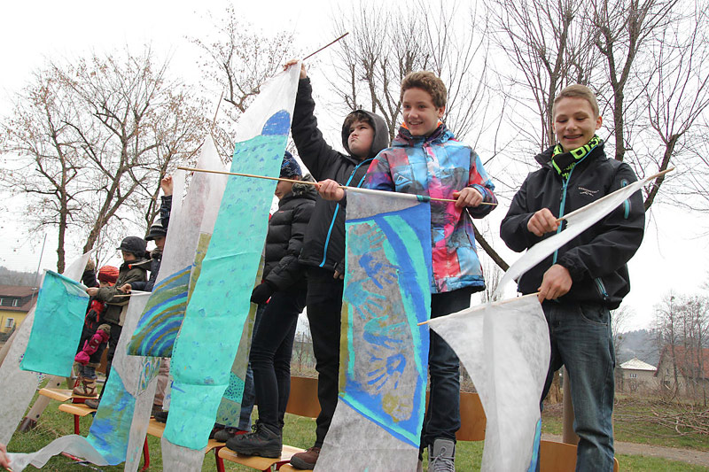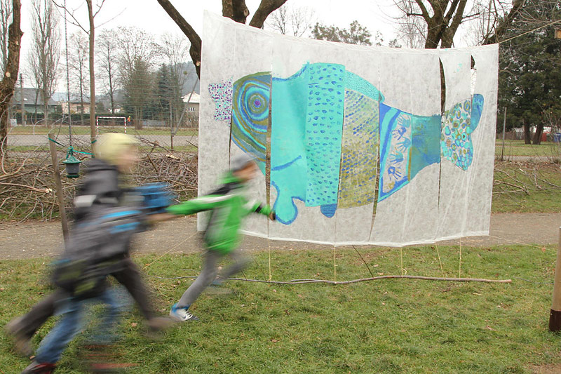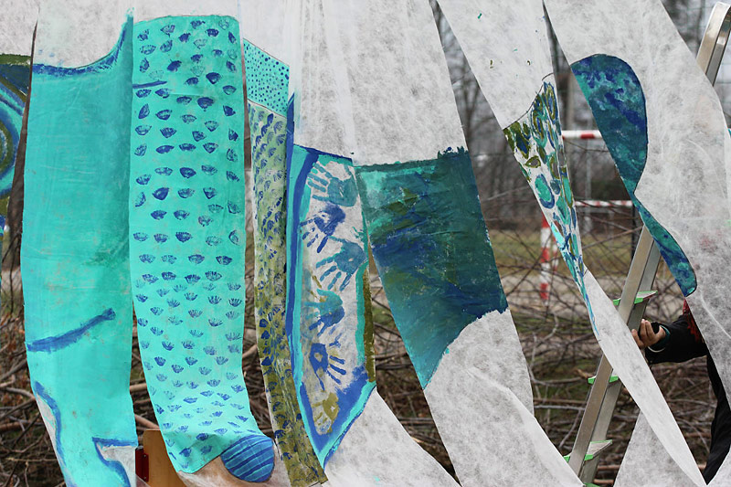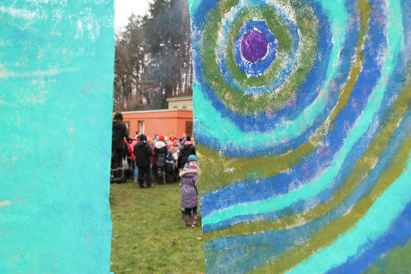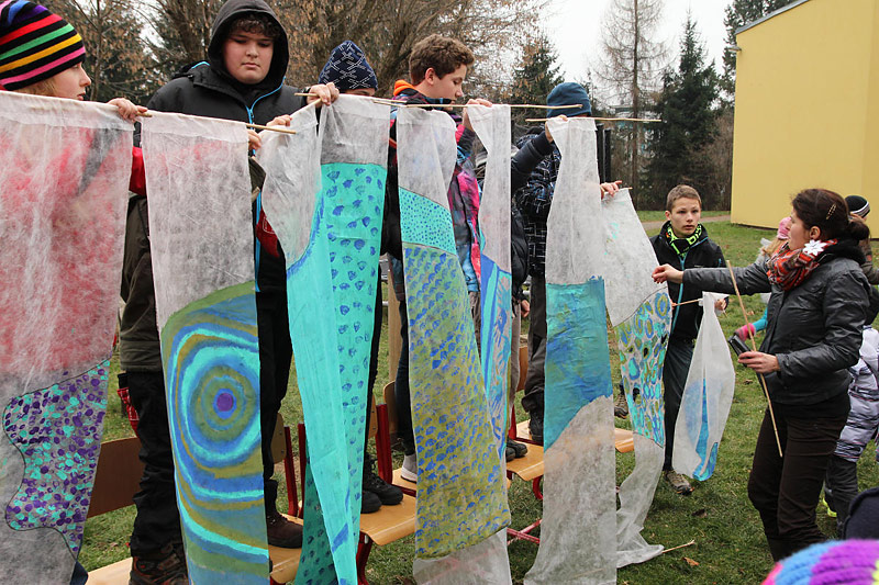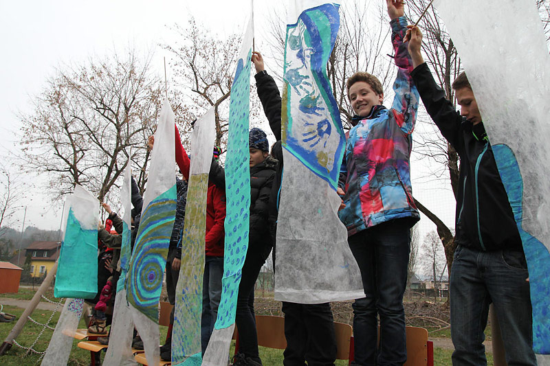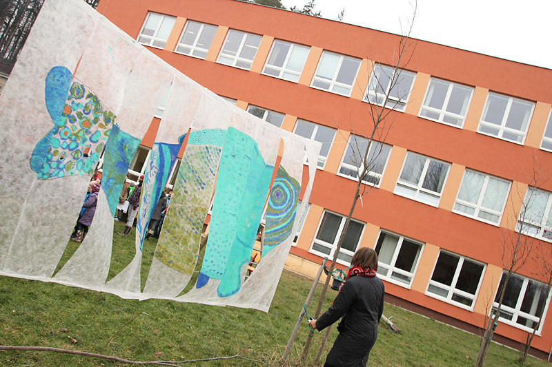 zasazené stromky. S jejich pomocí byl složen devítidílný obraz ryby - symbolu