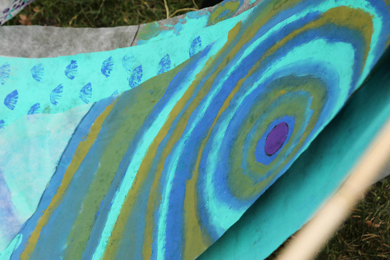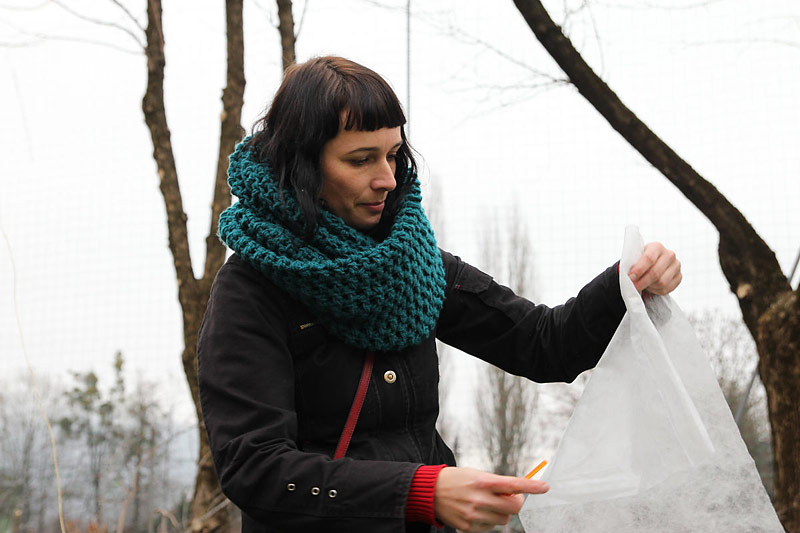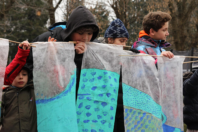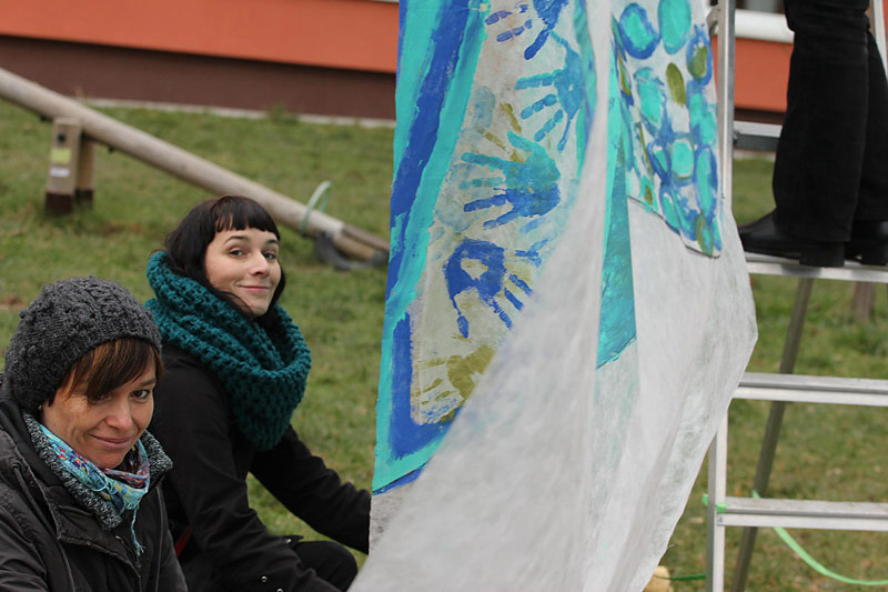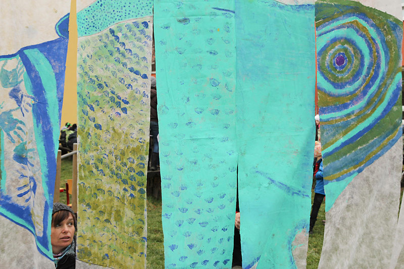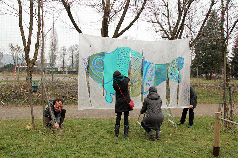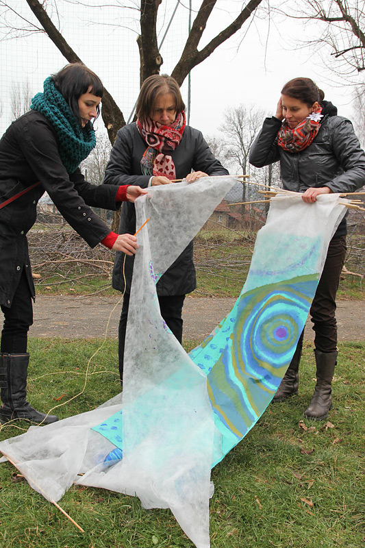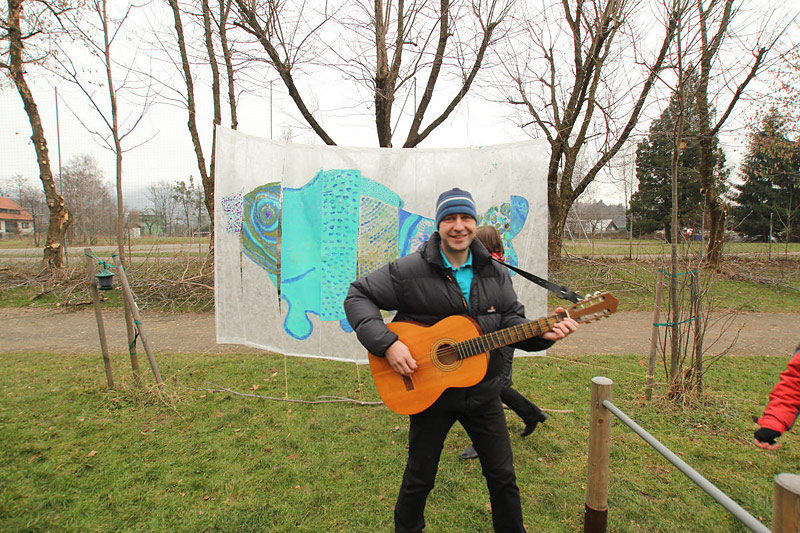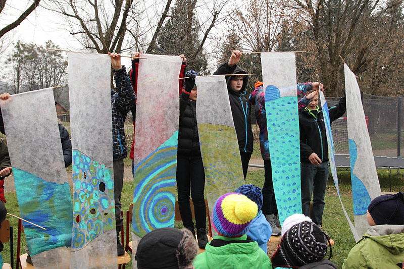 zasazené stromky. S jejich pomocí byl složen devítidílný obraz ryby - symbolu