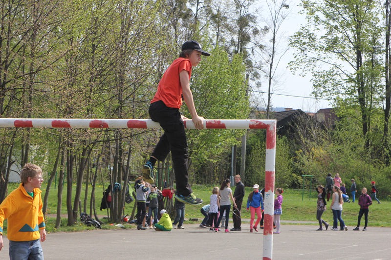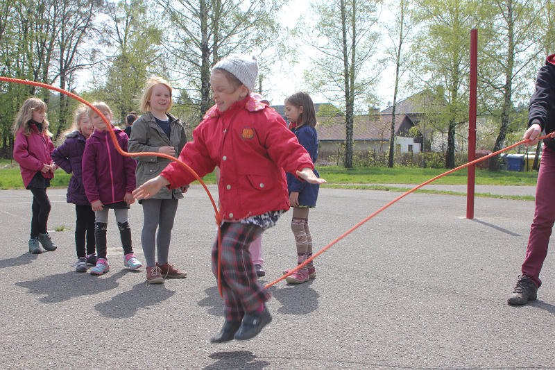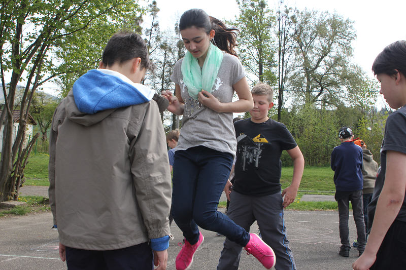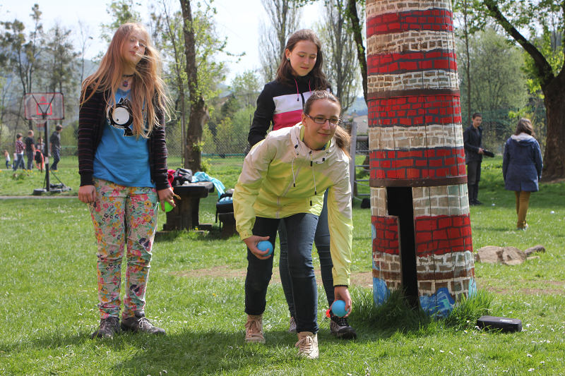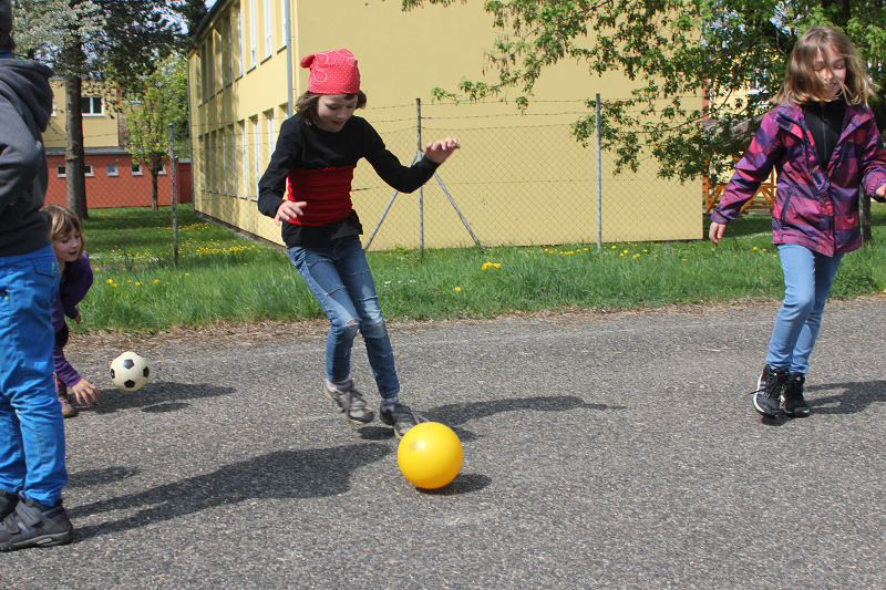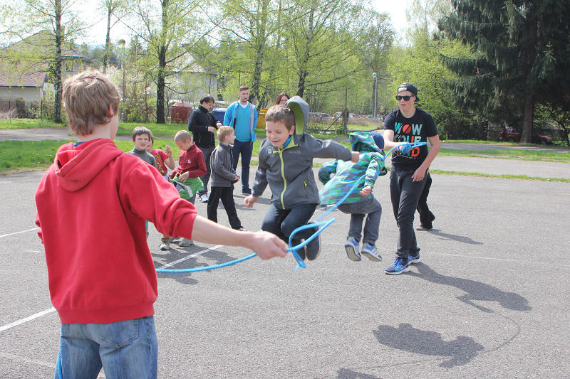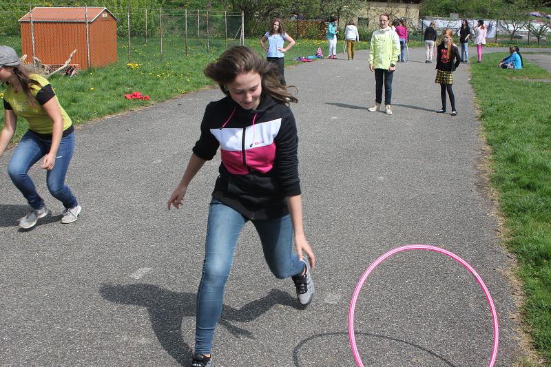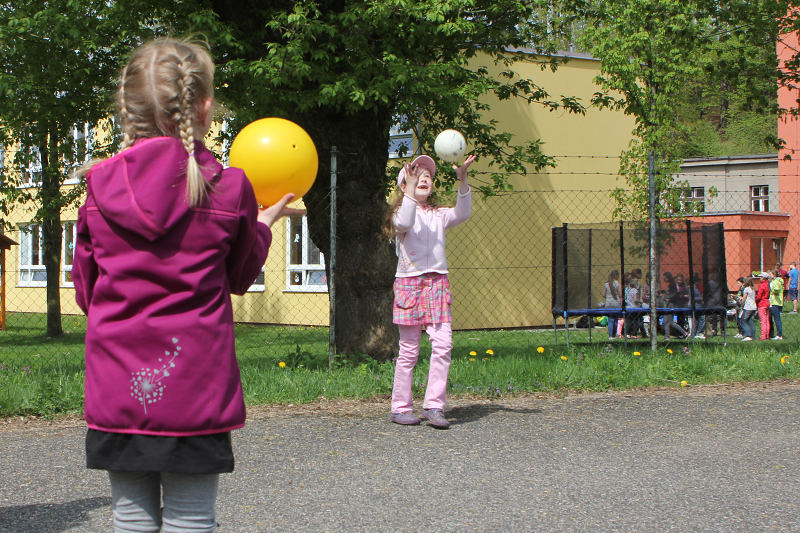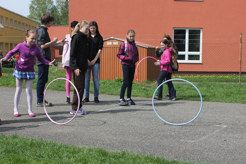 Po ukončení přehlídky jsme se přesunuli za školu. Starší žáci nachystali pro ty mladší řadu her a pohybových činností. Děti střídaly stanoviště, aby si vyzkoušely všechny připravené aktivity.