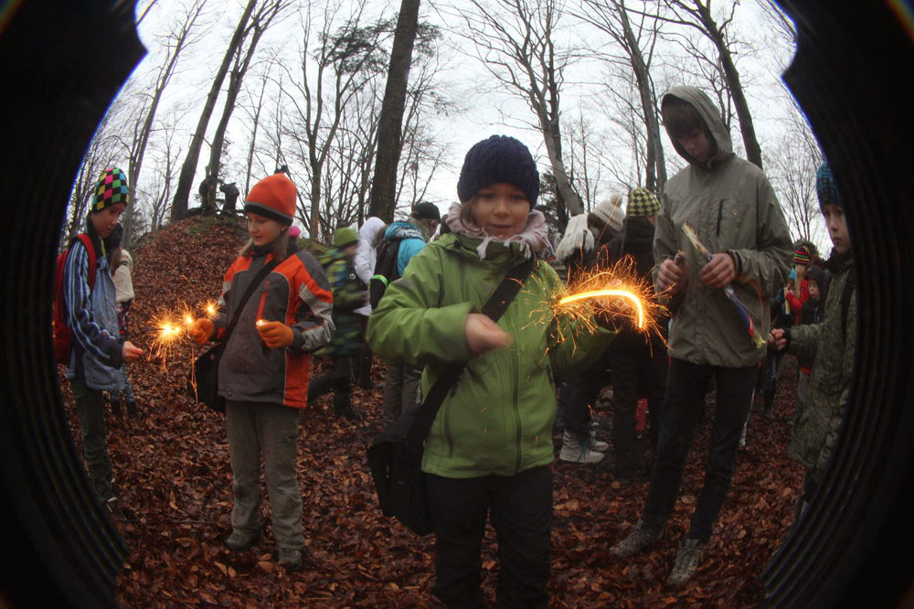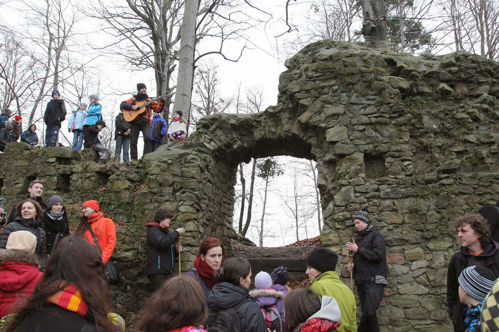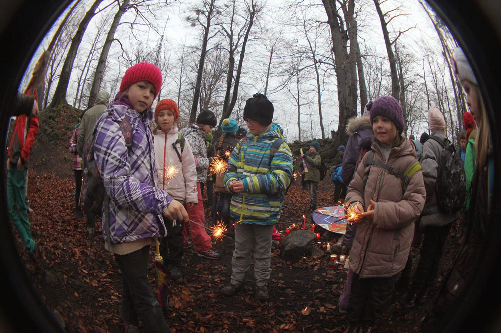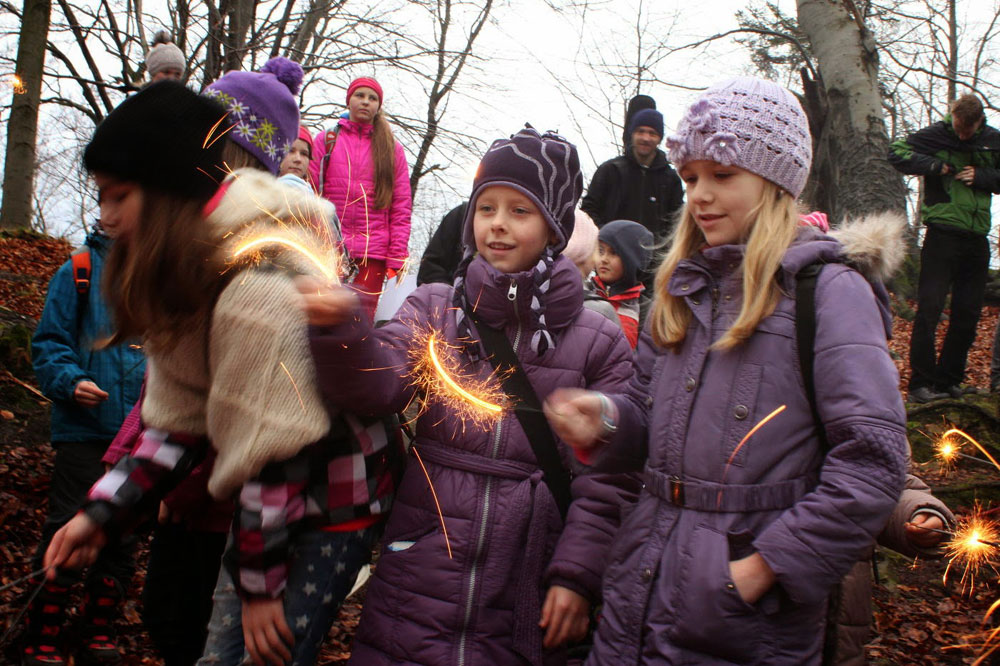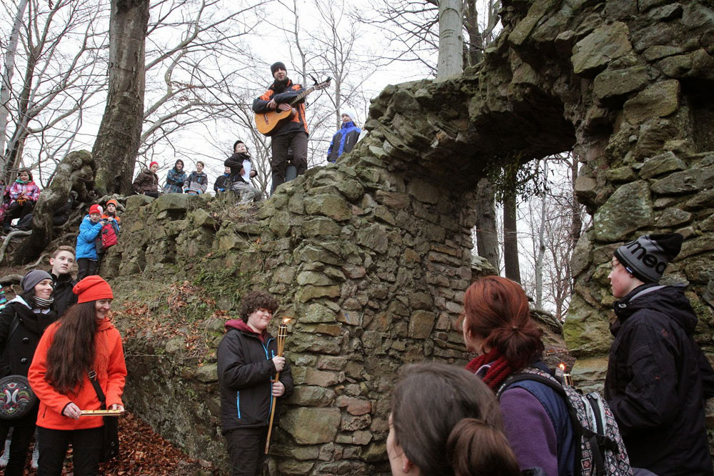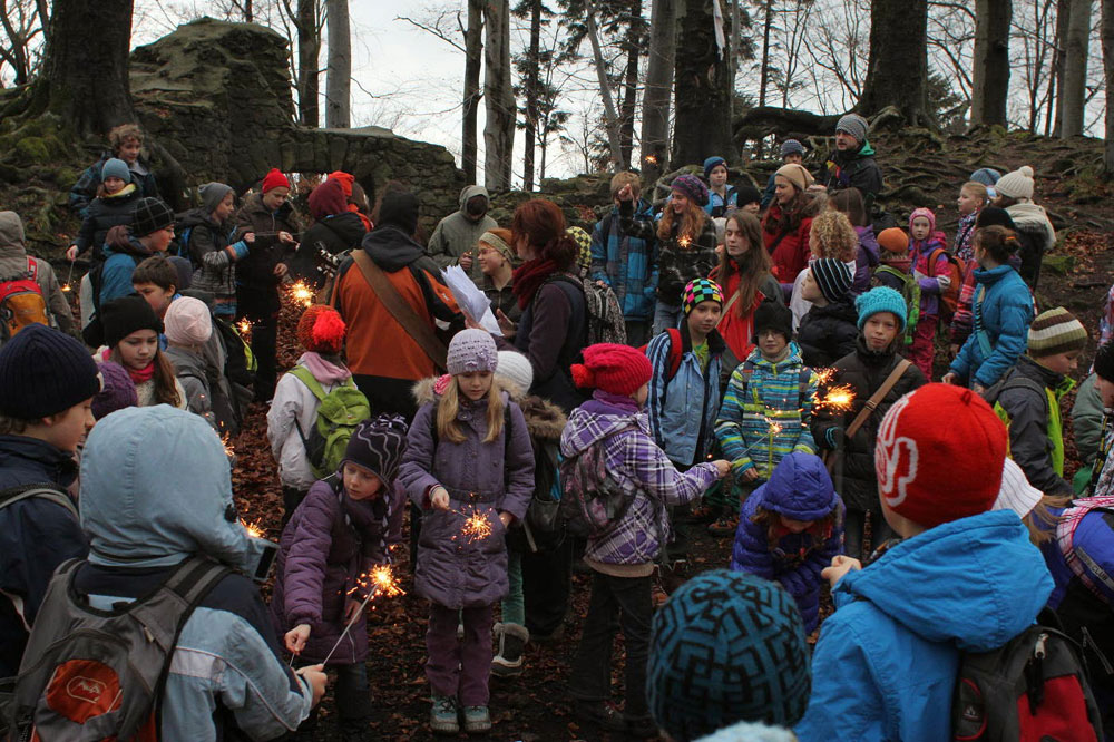 Na poslední vyučování v roce 2014 jsme opustili školní budovu a sešli se na panelové cestě pod Hradiskem. Cestou na rožnovský hrad jsme nakrmili divou zvěř (i kocoura ze statku) a shromáždili se před hradní bránou. Po odeznění písně v podání Anetky, Věrky a Jirky jsme vstoupili na území Vánoc. Zazpívali jsme si několik zimních a vánočních písniček, zapálili svíčky a prskavky a popřáli si do Nového roku. Nakonec jsme uhasili ohně, uklidili a vrátili se zpátky do města. Prázdniny začaly...
