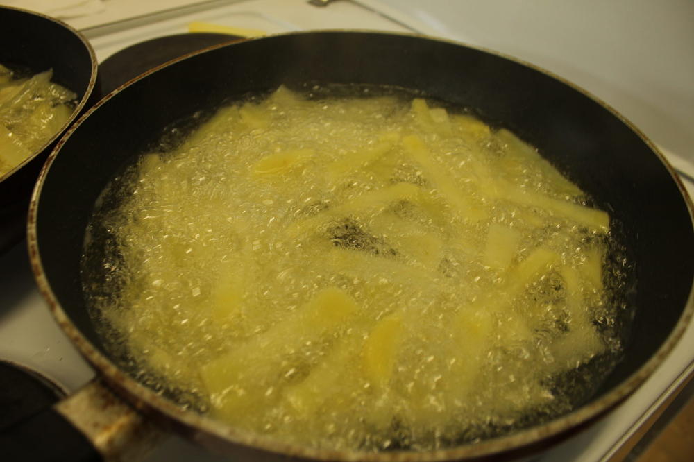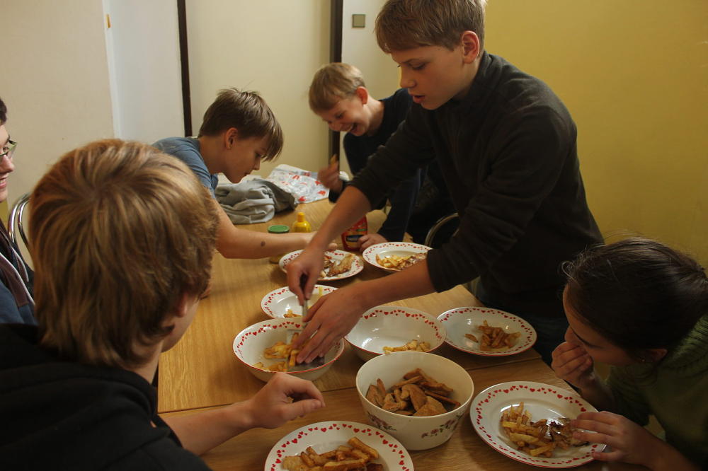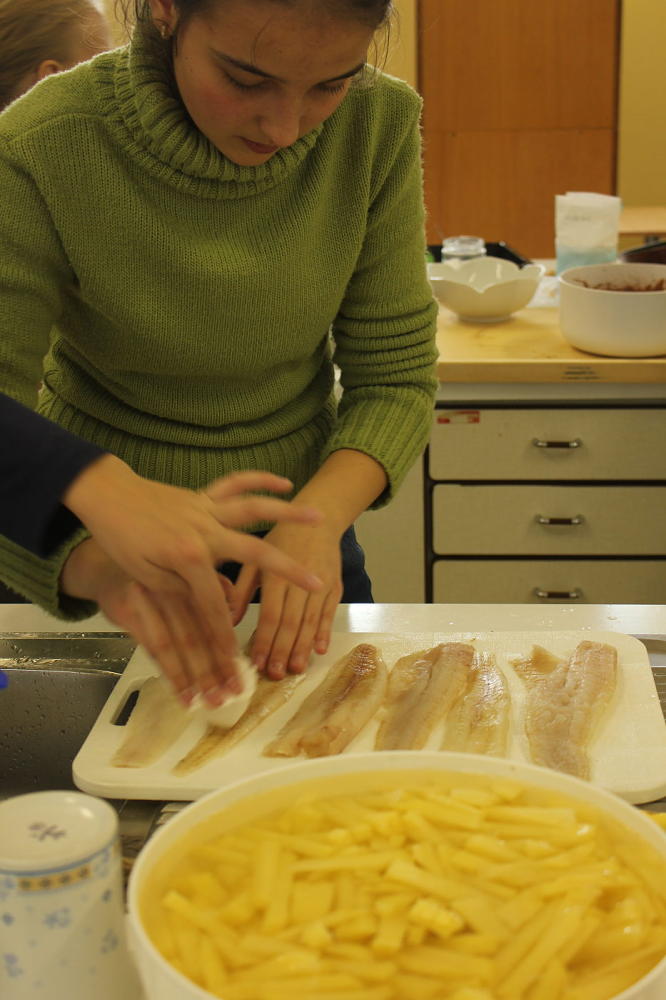 Poslední skupina se vrhla do vaření a smažení a všem dopřála ochutnávku typicky anglického jídla: Fish and chips.
