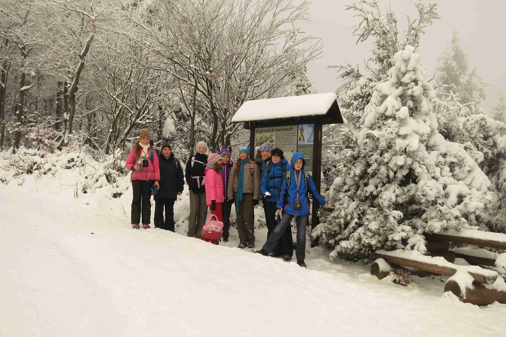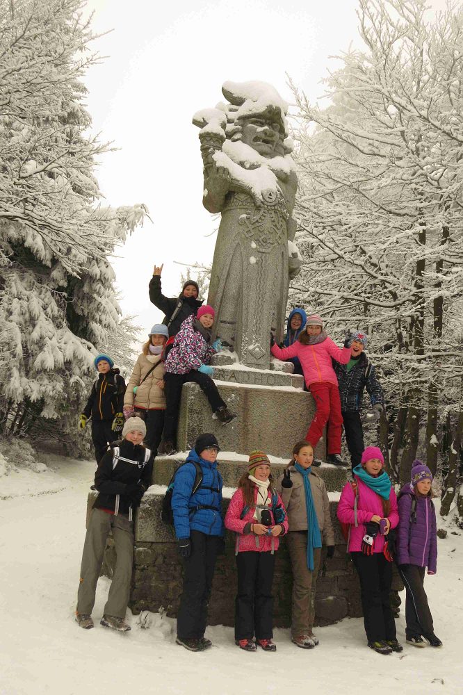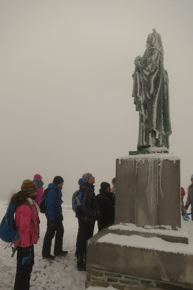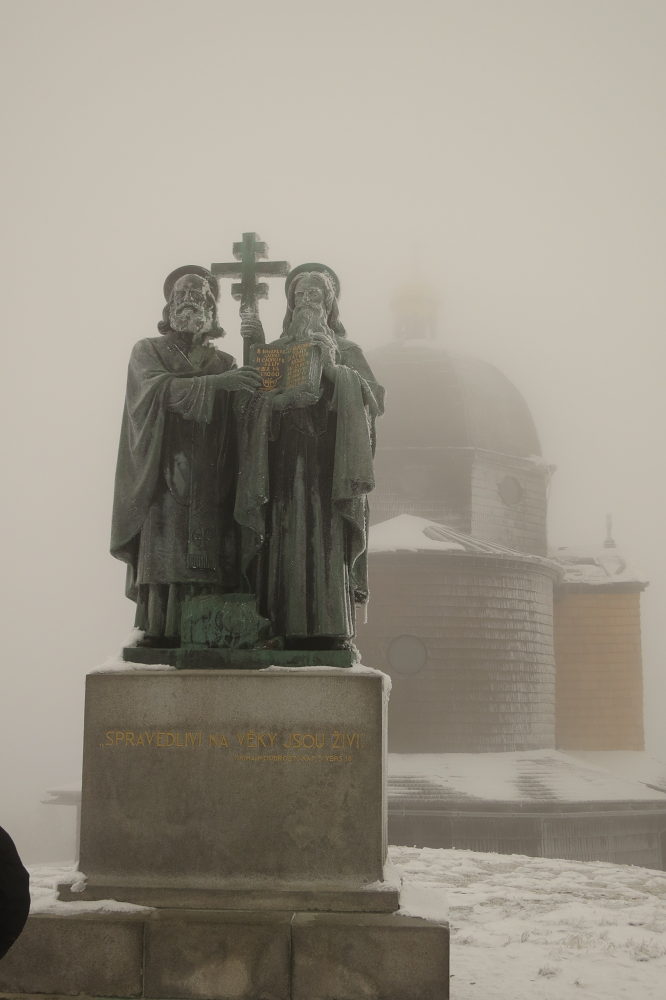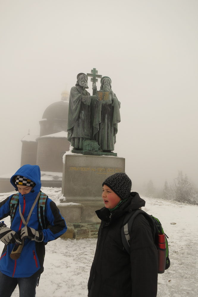 Malá viditelnost toho dne nám sice neumožnila splnit všechny plánované úkoly, ale zato jsme si užili prvního sněhu. A překvapivé zjištění - někteří poprvé stanuli u sochy Cyrila a Metoděje, slovanských to věrozvěstů :-O.