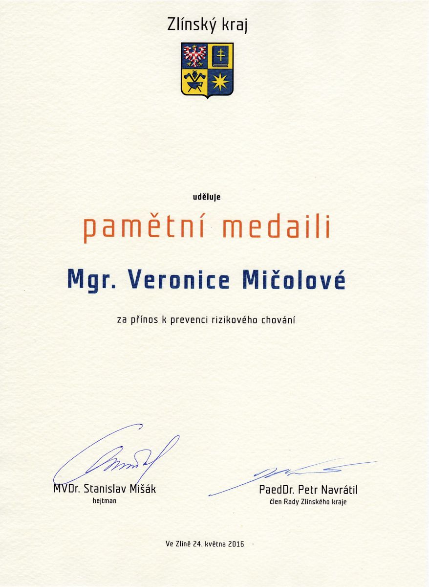 Pěkného úspěchu dosáhla paní učitelka Veronika Mičolová, jež byla oceněna medailí a věcnou cenou za přístup k problematice prevence rizikového chování na Sedmikrásce. Je pozitivní, že v oblasti rozvoje dobrého klimatu ve škole, prevence záškoláctví, drogové prevence, prevence selhání a školních neúspěchů žáků jsou aktivity, které na naší škole realizujeme, smysluplné. Vyhlášení proběhlo za účasti vedení Zlínského kraje v krásném prostředí Baťovy vily ve Zlíně.
