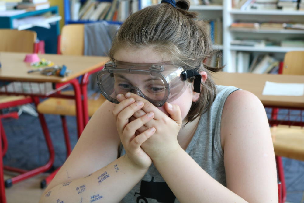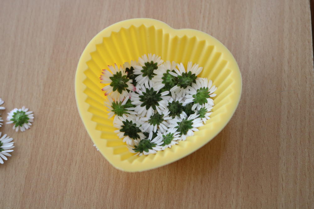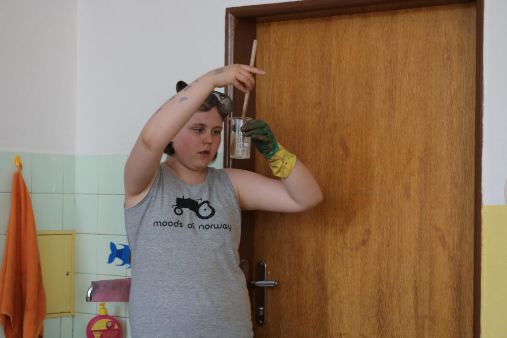 a mixovali a mixovali. Dále jsme formičky naplnili směsí, "ozdobili" a nechali několik dní odležet, dokud směs neztuhla. Nepovedlo se. Doma to radši nezkoušejte, hydroxid je jedovatý.