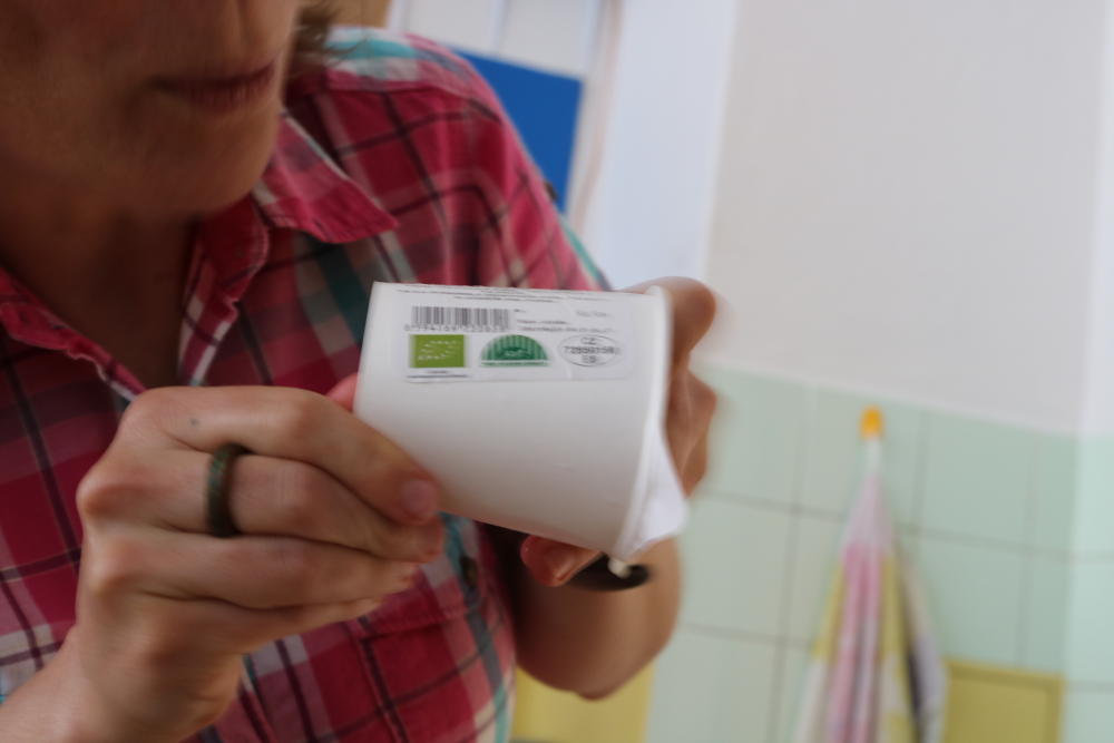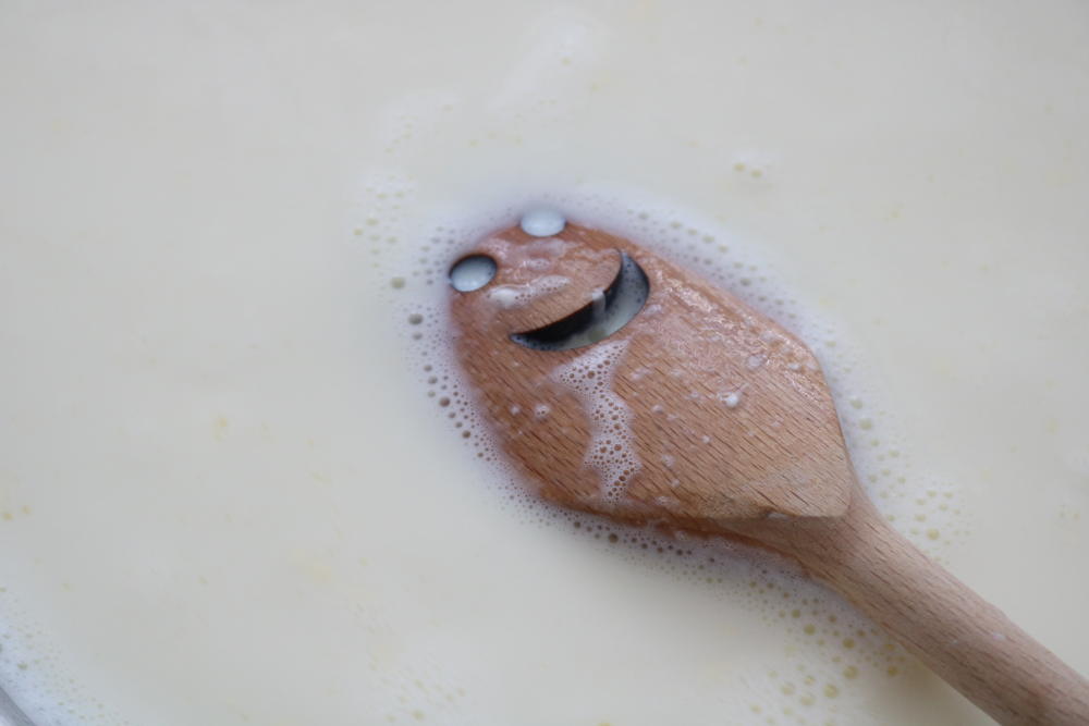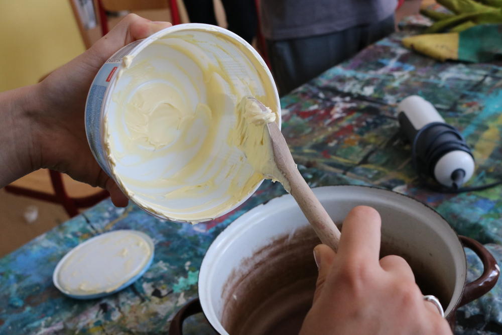 Nejdříve jsme zahřívali margarín do tekuté formy, poté jsme jej vychladili (kolem 40° Celsia), připravili jsme si roztok hydroxidu sodného (hydroxid + destilovaná voda) a ten jsme opatrně nalili do margarínu...