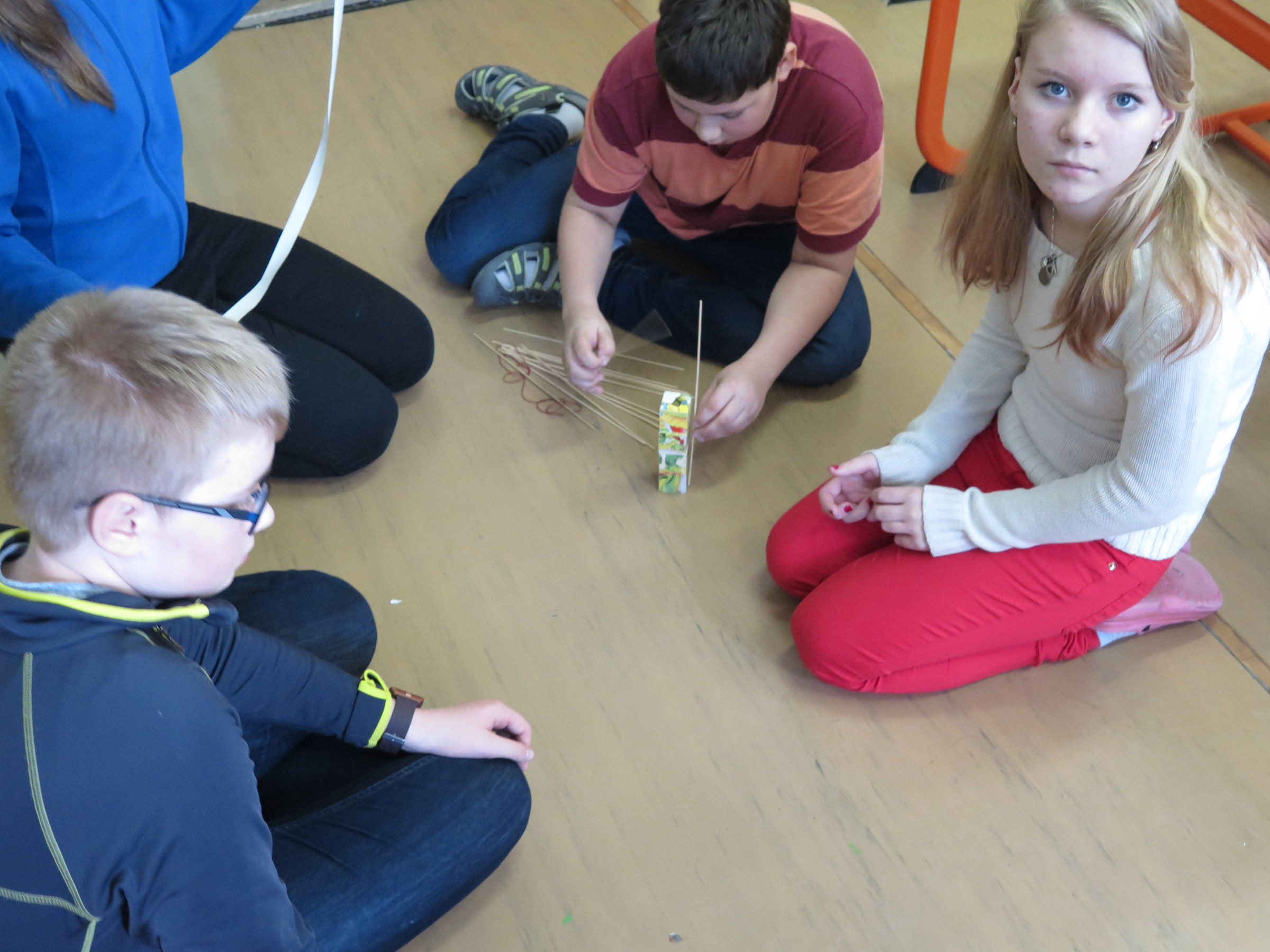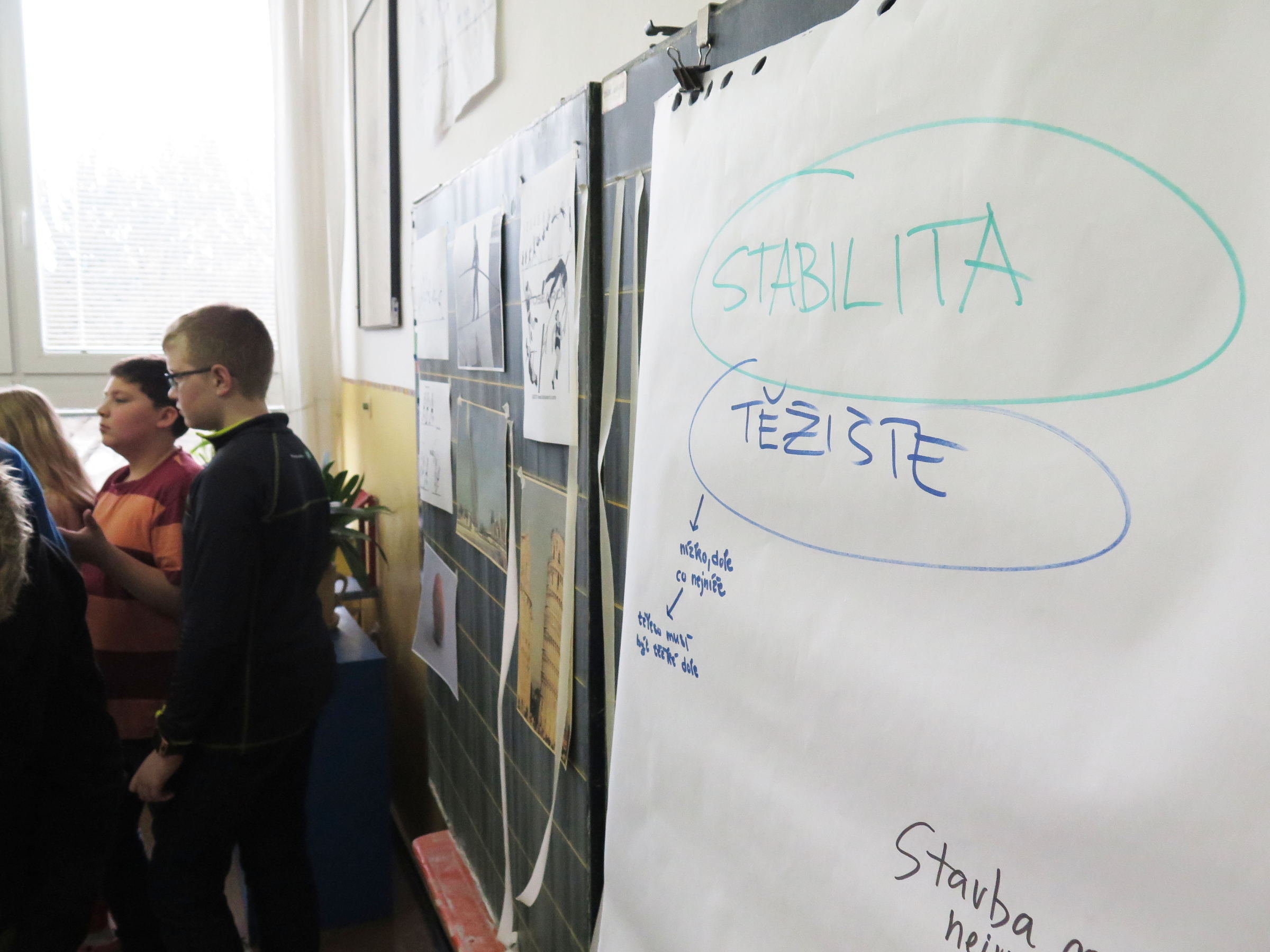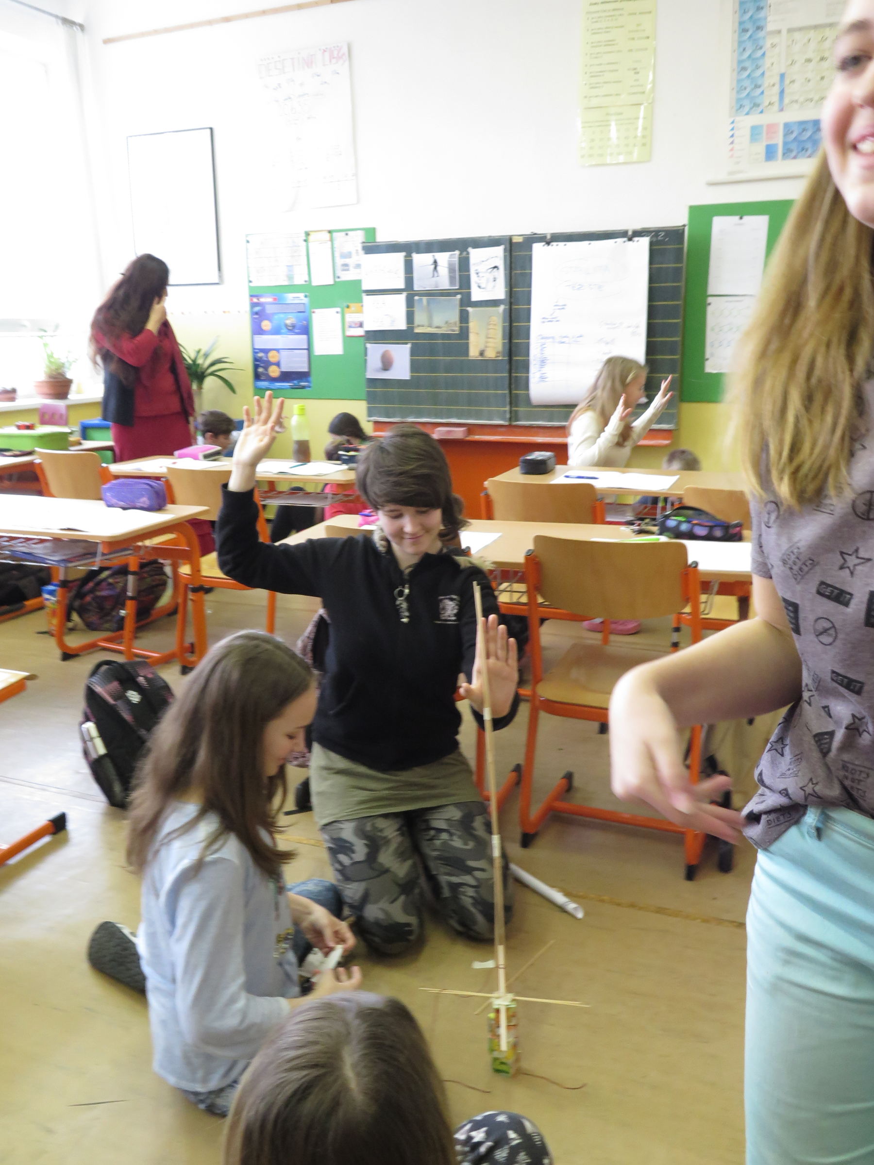 7. ročník. Uzavření tématu stabilita a těžiště před závěrečným testem proběhlo "projektem" pro skupinky žáků. Cílem bylo teoreticky navrhnout, prodiskutovat a následně postavit co nevyšší stavbu za určených podmínek. Použitý materiál: 15 špejlí, 4 dřevěné kostky, 1 list A4, 1 metr provázku a 1 metr malířské pásky. Stavba musela stát bez další opory minimálně 2 minuty. Po přeměření a předání zkušeností proběhlo i další "opravné" kolo v kratším časovém limitu.