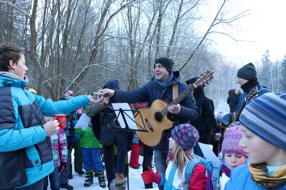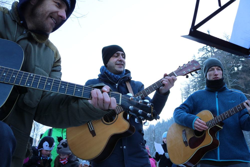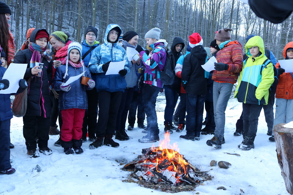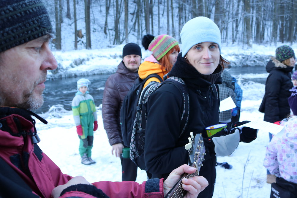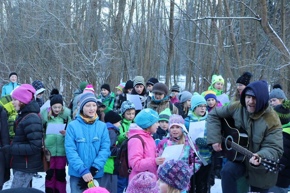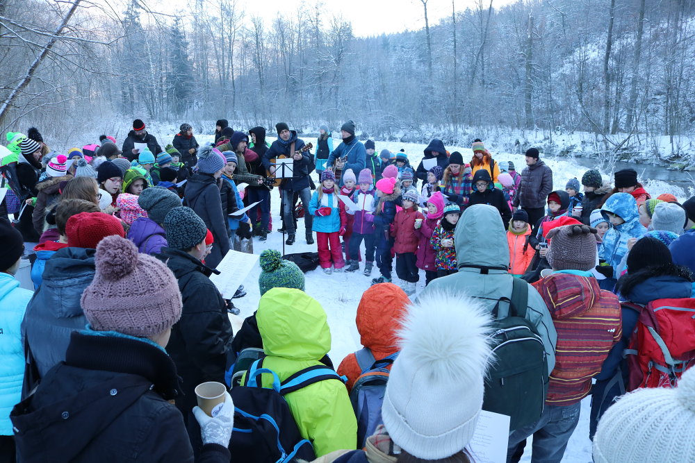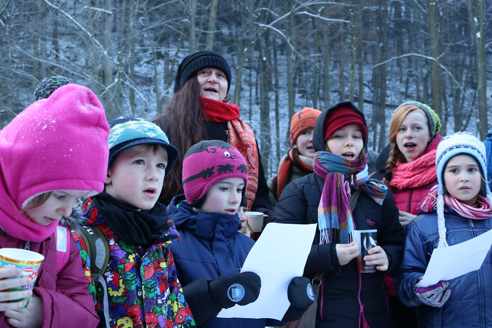 Rádi se před Vánoci potkáváme mimo školu, a proto jsme vymysleli místo na kraji Rožnova a krátkou skoro půlhodinovou procházkou jsme se vydali proti proudu Rožnovské Bečvy. Za stromy u vody na nás svítil ohníček, což bylo při teplotě -8 stupňů Celsia opravdu potřeba. Společně jsme si všichni připili novoročním punčem, který pro nás učitelé připravili a zazpívali 6 písní se závěrečnou "Když padá sníh". Doprovodili nás i někteří rodiče a bylo to příjemné. V jídelně jsme viděli děti s růžovými tvářemi. Jenom nevím, jakou barvu měly prsty našich 3 kytaristů, zima u vody byla pořádná. Hudební set byl následující: Vánoce držíme, Pásli ovce Valaši, Mary had a baby, Z jedné strany chvojka, Feliz Navidad, Když padá sníh.