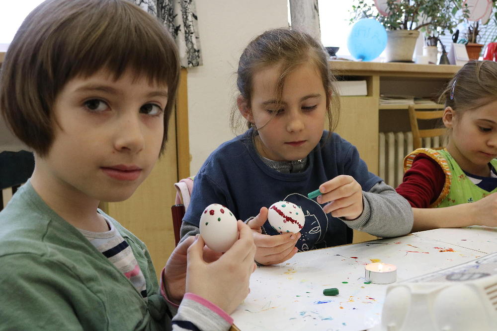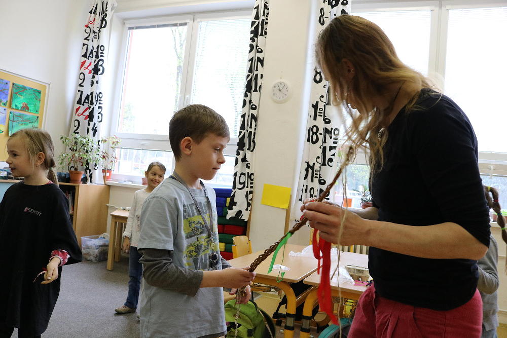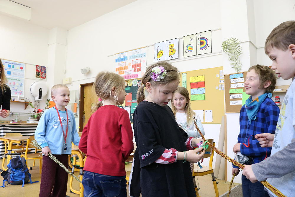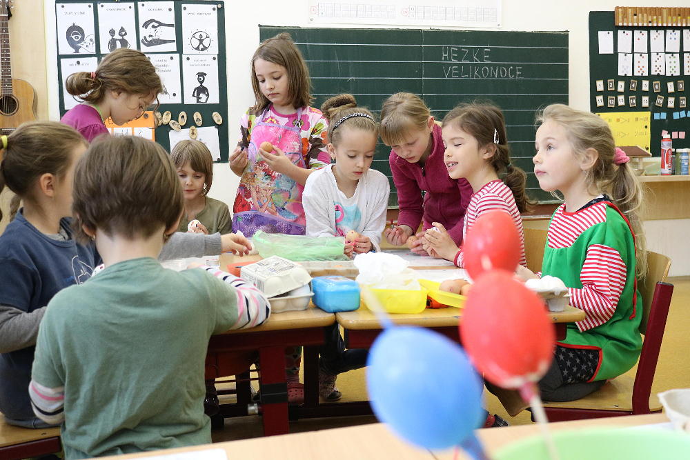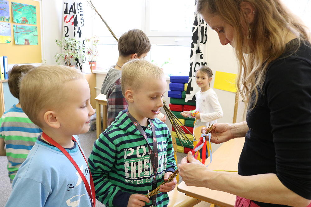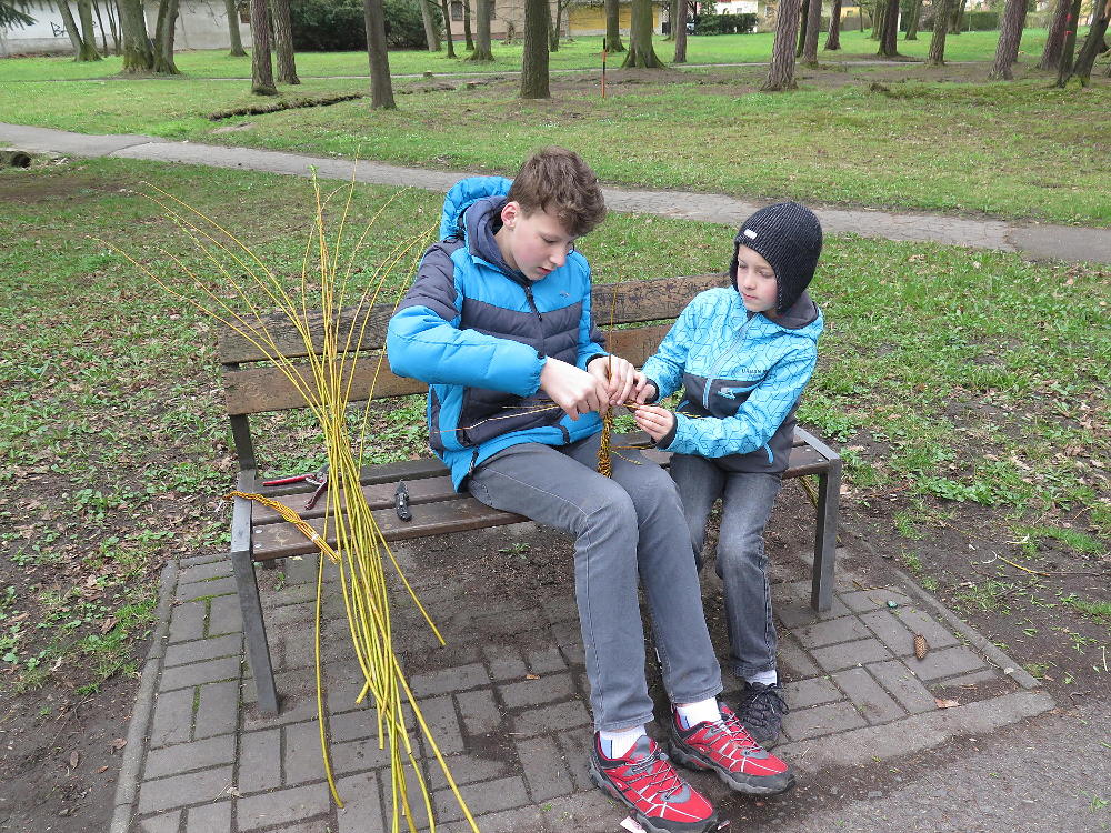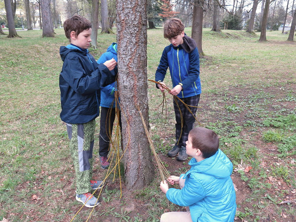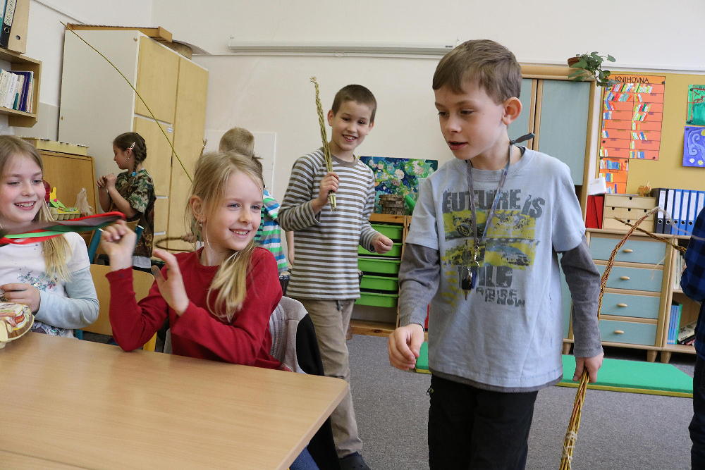 Pro první stupeň byla středa před velikonočními svátky velmi akční a tvořivá. Kluci se vydali do parku a s pomocí učitelů a několika spolužáků ze VII. a VIII. třídy si upletli tatary, zahráli fotbal a trošku vymrzli. Holky zůstaly ve škole a vytvořily krásná vajíčka pro šmigrustníky. V nabídce bylo mnoho výtvarných technik od barvení v cibulových slupkách, přes malování barvami, lepení skořápek, až po nanášení vosku. Bylo to moc veselé dopoledne a kluci samozřejmě nezapomněli vyplatit děvčata, aby si vajíčko a stuhu na pomlázku zasloužili. Co myslíte, dostaly tatarem i paní učitelky?