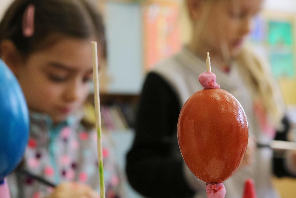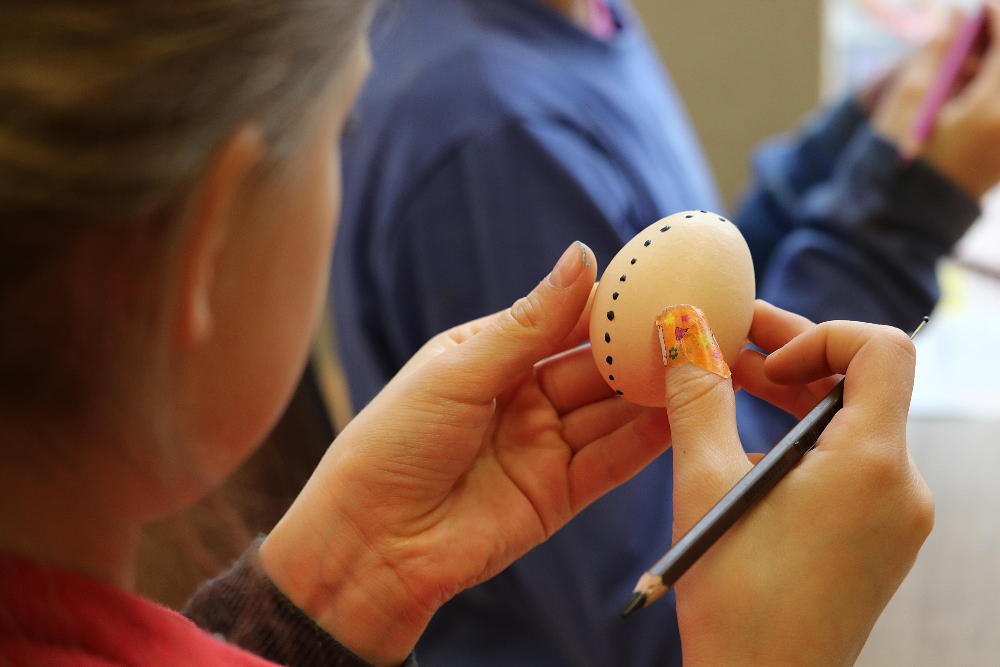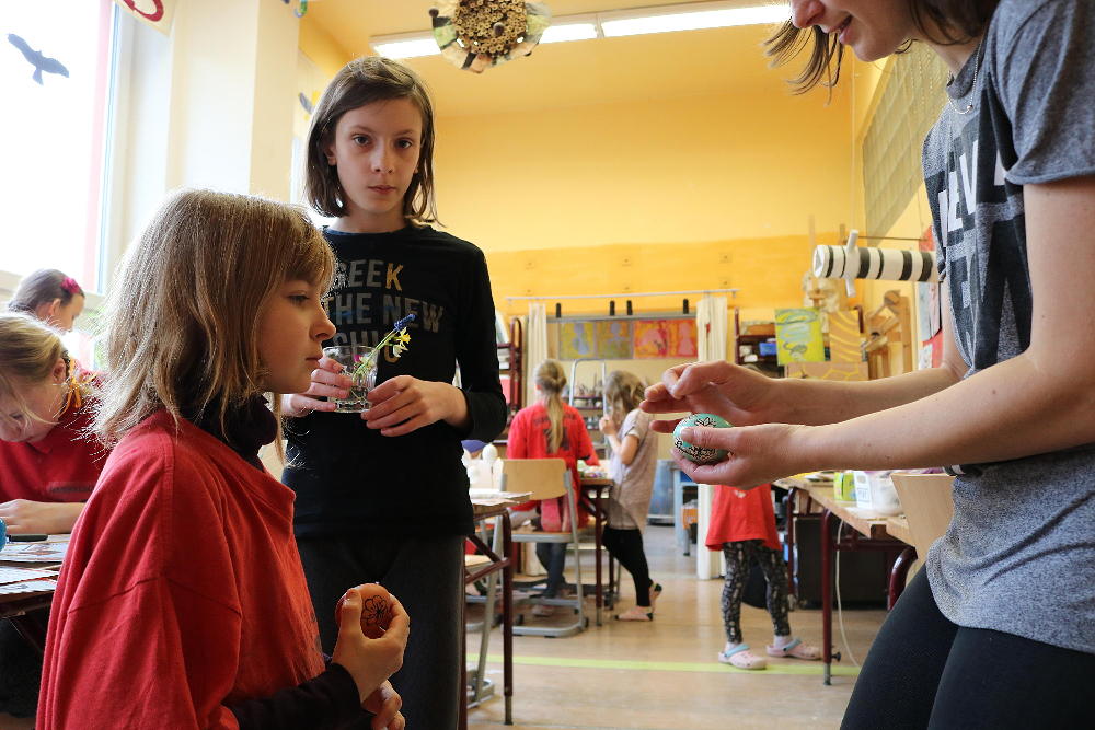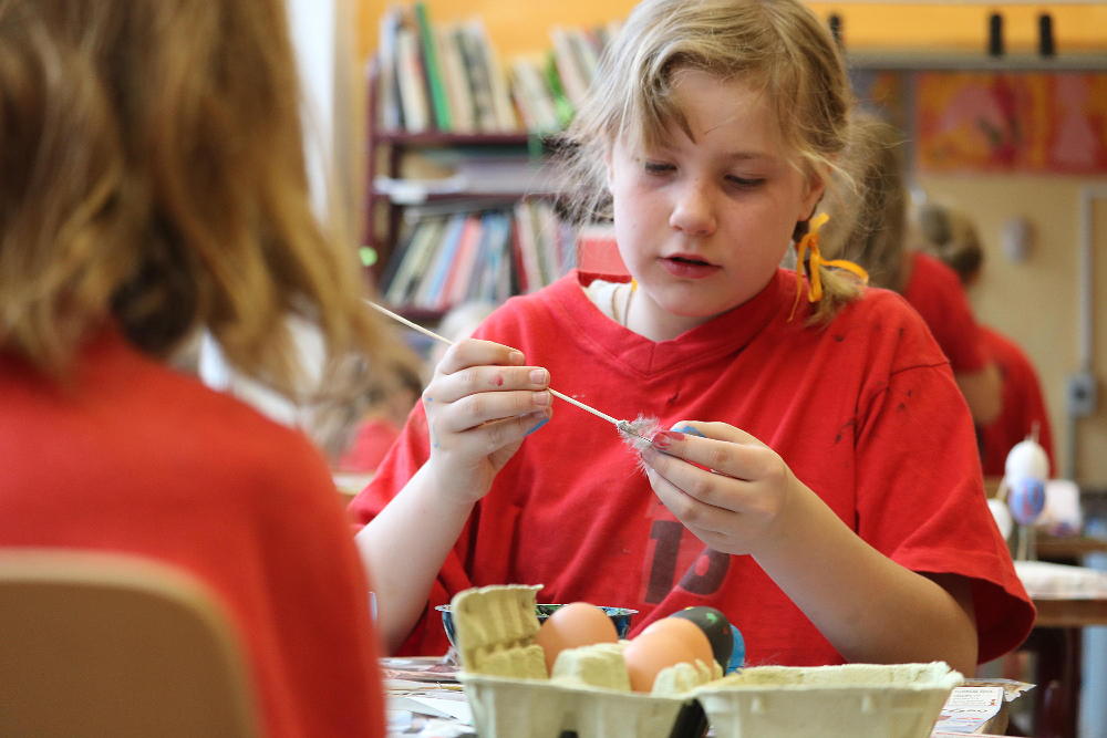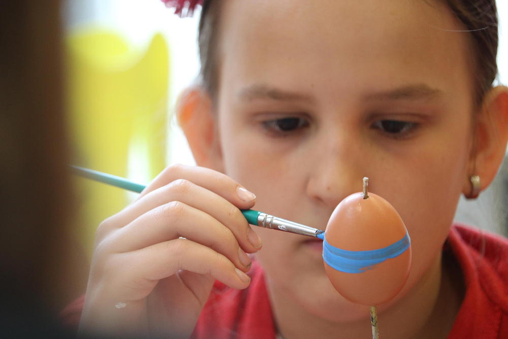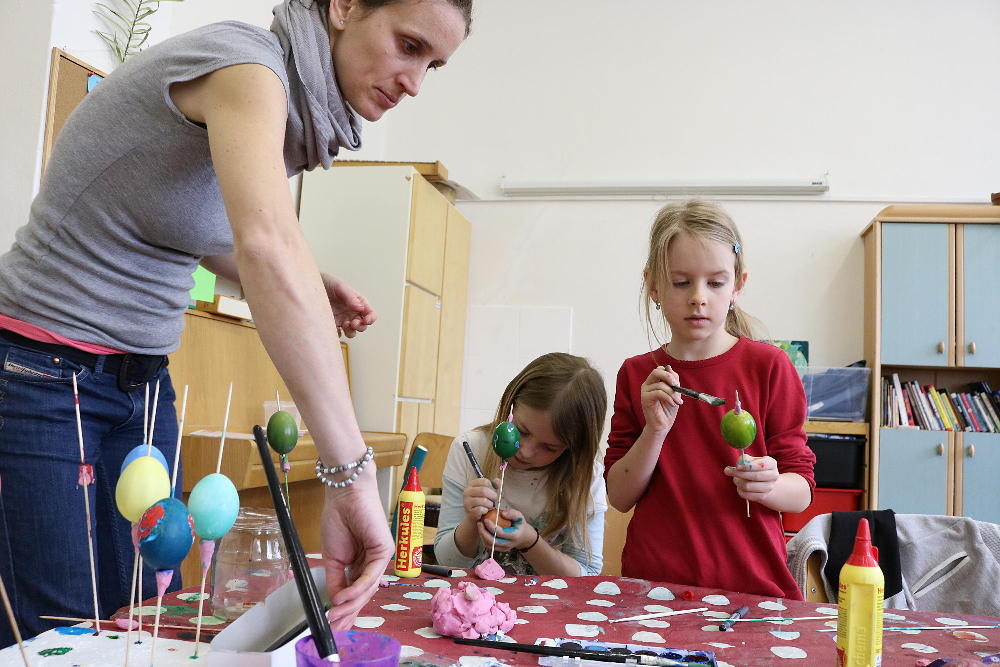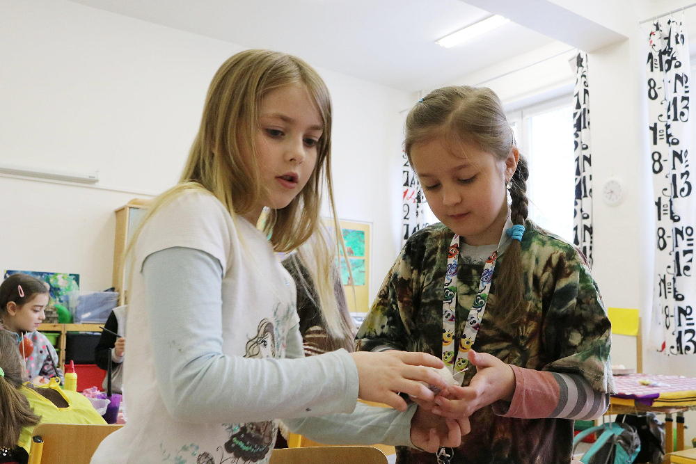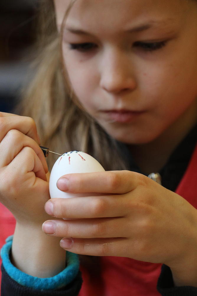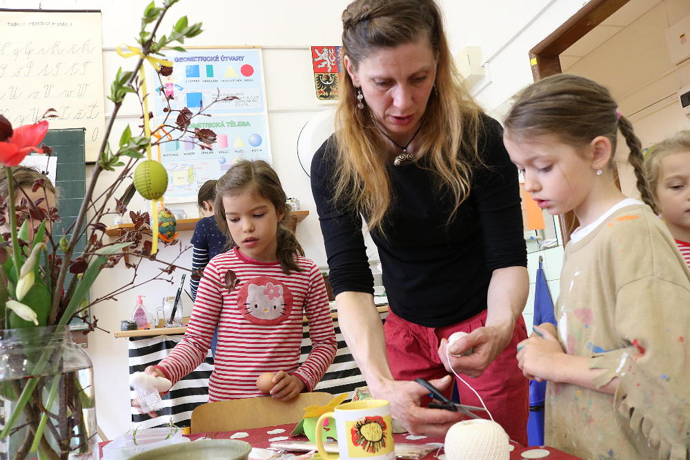 Pro první stupeň byla středa před velikonočními svátky velmi akční a tvořivá. Kluci se vydali do parku a s pomocí učitelů a několika spolužáků ze VII. a VIII. třídy si upletli tatary, zahráli fotbal a trošku vymrzli. Holky zůstaly ve škole a vytvořily krásná vajíčka pro šmigrustníky. V nabídce bylo mnoho výtvarných technik od barvení v cibulových slupkách, přes malování barvami, lepení skořápek, až po nanášení vosku. Bylo to moc veselé dopoledne a kluci samozřejmě nezapomněli vyplatit děvčata, aby si vajíčko a stuhu na pomlázku zasloužili. Co myslíte, dostaly tatarem i paní učitelky?