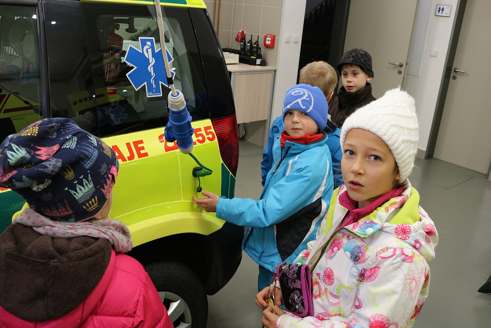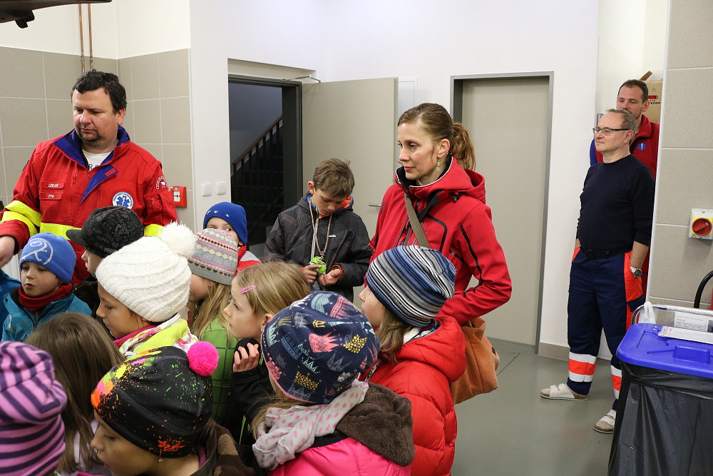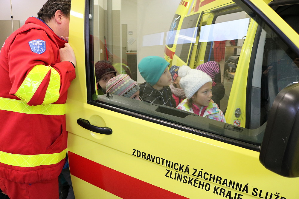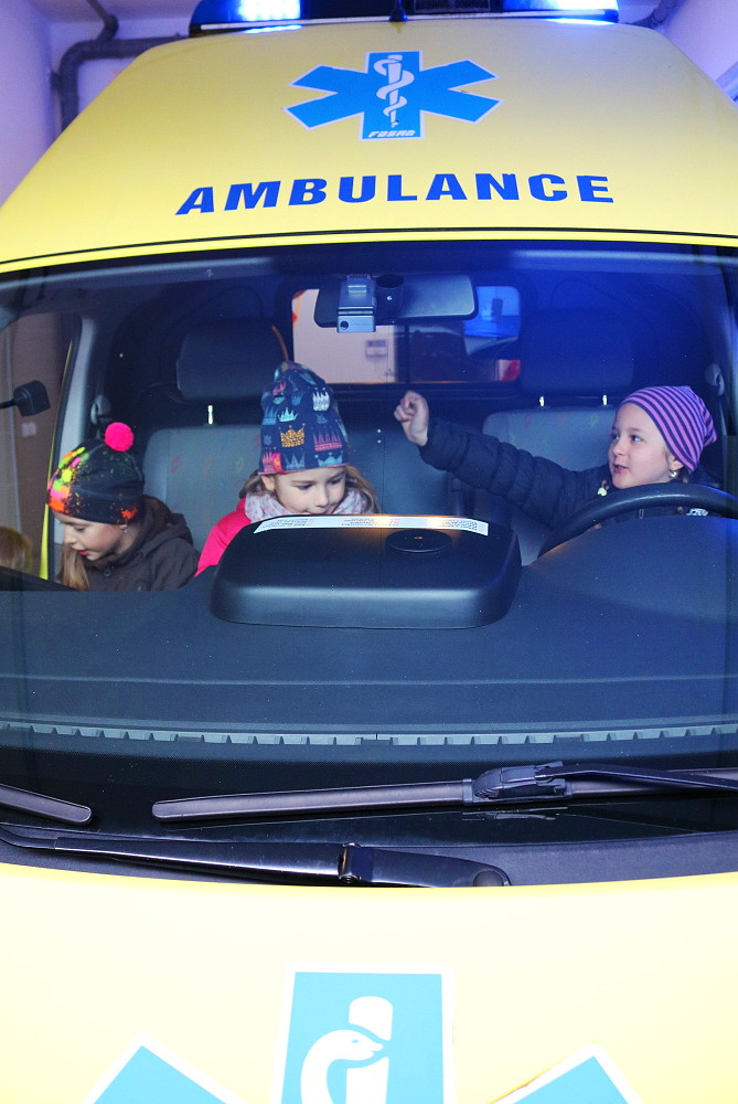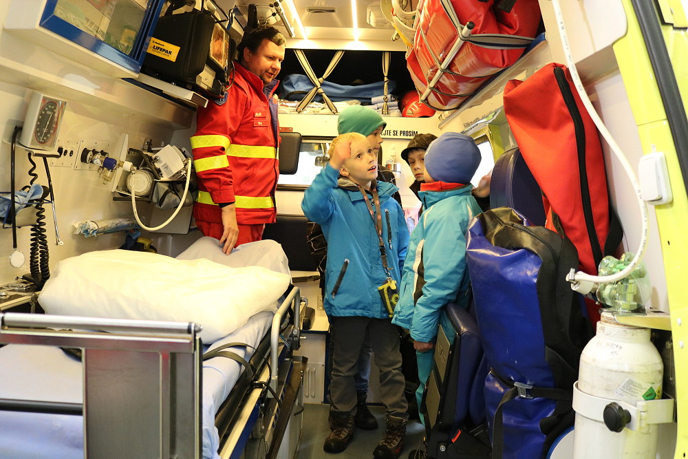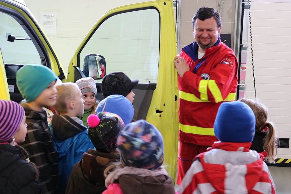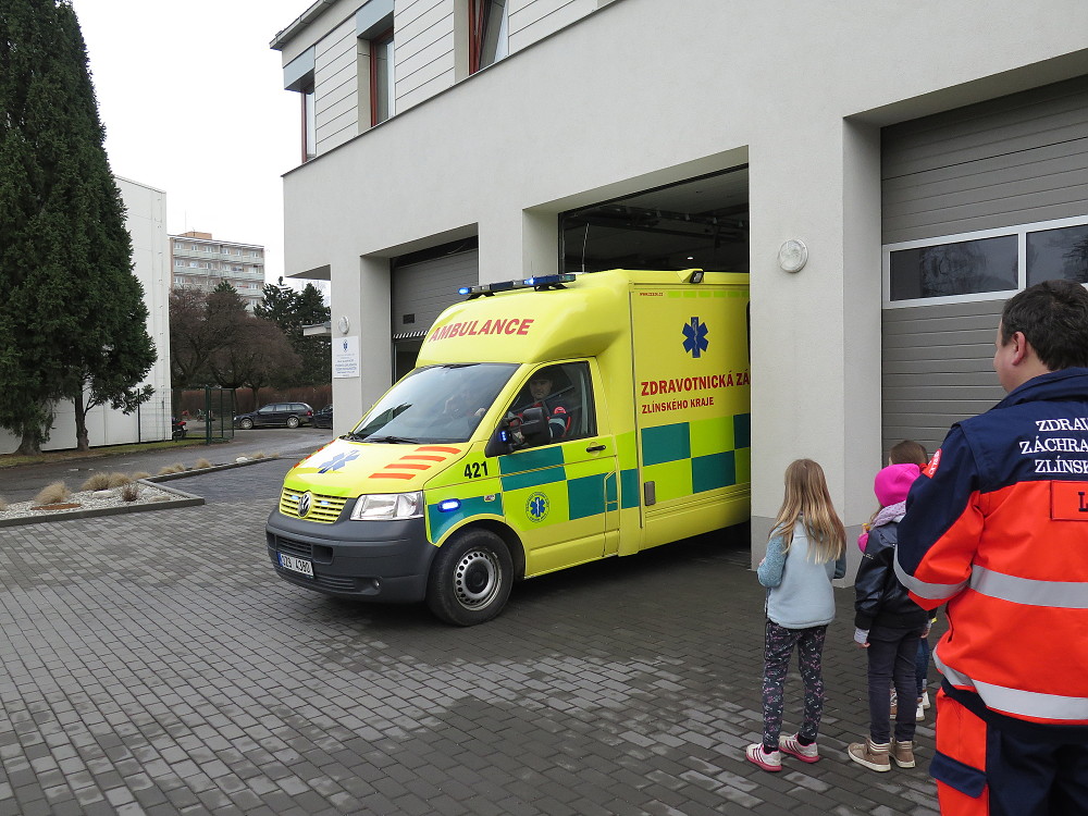 18. dubna jsme šli už podruhé navštívit taťku od Cyrilka, který je pan doktor na záchranné službě. Poprvé nám to nevyšlo, protože odjely všechny sanitky k pacientům. Teď to konečně klaplo a my jsme měli možnost se dovědět, jak to chodí, když se zavolá 155. Pan Janík nám všechno vysvětlil, ukázal nám sanitku, jak je dokonale vybavená a k čemu všechno slouží. Mohli jsme si sednout i na místo řidiče, kde jsme si pustili modrá výstražná světla, chtěli jsme i zahoukat, ale to by byl velký rachot Viděli jsme vysílačky, mohli jsme si sednout i na speciální vozík, který umí jezdit po schodech. Jedna sanitka zrovna vyjížděla někomu na pomoc. Bylo to opravdu zajímavé. (2. třída)