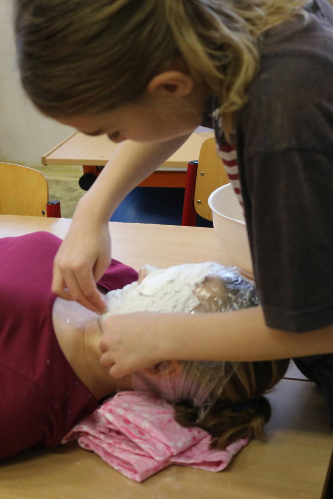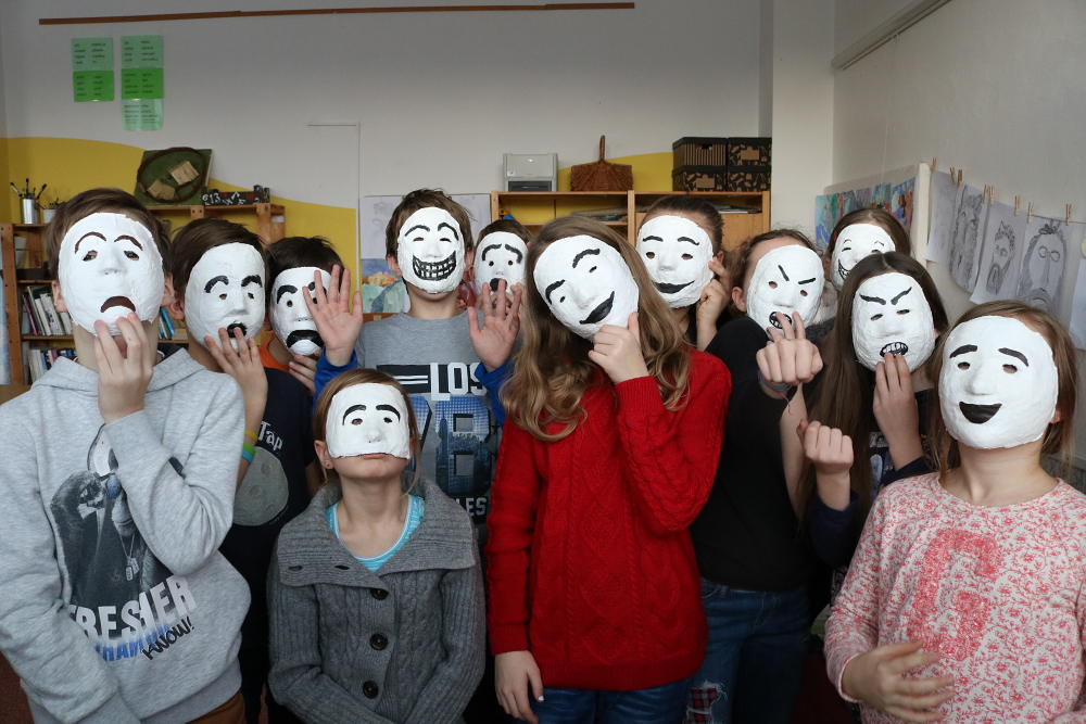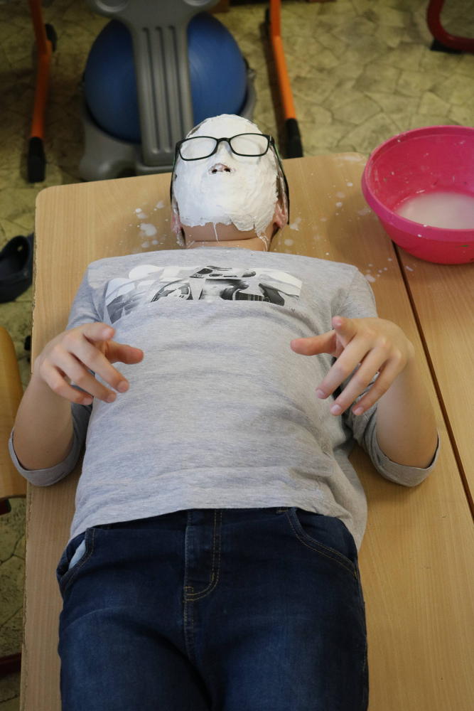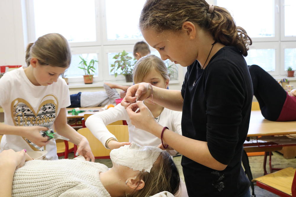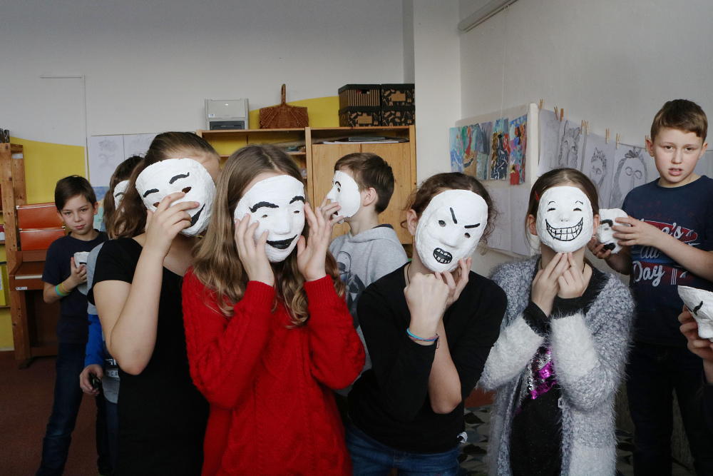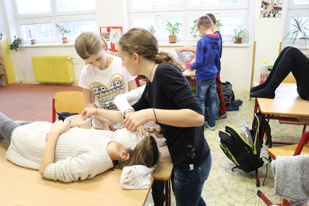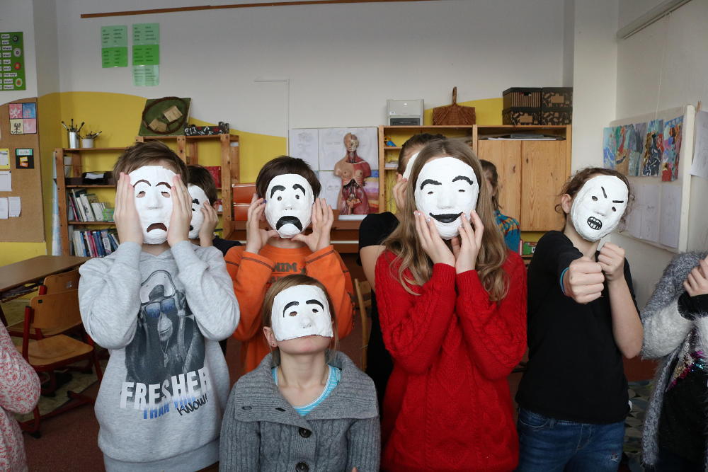 Hodinu pracovních činností v páté třídě jsme si zpestřili tím, že jsme vytvářeli sádrové masky na obličej, doplněny výrazem, emocí. Pro inspiraci jsme se dívali na výrazy dvou známých komiků Jiřího Voskovce a Jana Wericha. Zkoušeli jsme na vlastních obličejích různé emoce a nakonec vybrali tyto: smutek, radost, naštvanost, vztek, melancholie. Masky můžeme dále využít i v hodinách dramatické výchovy. Pokud byste si chtěli vyrobit svou vlastní masku, tak vám vysvětlíme, jak na to. Budete potřebovat: vazelínu nebo mastný krém na obličej, odličovací tamponky, 1 sádrový obvaz, vlažnou vodu, misku na vodu, nůžky. Návod na výrobu masky: Na tvář si naneste vazelínu, na obočí větší vrstvu! Odličovací tamponky položte na oči. Pak vám kamarád nanáší nastřižené sádrové obvazy (namočeny ve vlažné vodě) na obličej. Při kladení obvazů dávejte pozor a vynechávejte nosní dírky. Celý povrch obličeje pokryjete dostatečnou tloušťkou obvazů. Asi po 10 minutách je maska ztuhlá natolik, že ji můžete pomocí mimických svalů dostat z obličeje dolů. Pomocí obvazu zakryjte díru na nose a nechte sušit do dalšího dne. Celý postup vyžaduje velkou dávku vzájemné důvěry. Pro někoho to nemusí být příjemný zážitek, i v naší třídě se dva žáci této aktivity nezúčastnili. Po zaschnutí vystřihnete dírky pro oči a prorazíte dírky v nose na dýchání. My jsme si v této chvíli namalovali na masky obočí a ústa, kterými jsme vyjádřili emoce. A zbývá už jen celou masku natřít lepidlem, aby se zpevnila a mohli jste ji dále používat. Pro všechny, kteří si tento postup vyzkoušeli, to byl velmi zajímavý a netradiční zážitek. Jak už jsme zmínili v postupu práce, vyžaduje to velkou porci důvěry ve svého spolužáka, který vás má v tu chvíli na starosti. Z masek máme velkou radost a těšíme se na to, až si s nimi zahrajeme divadlo v hodině dramatické výchovy.