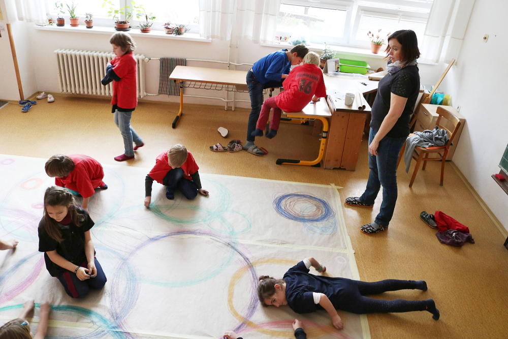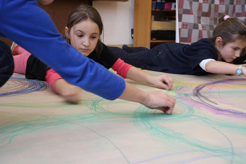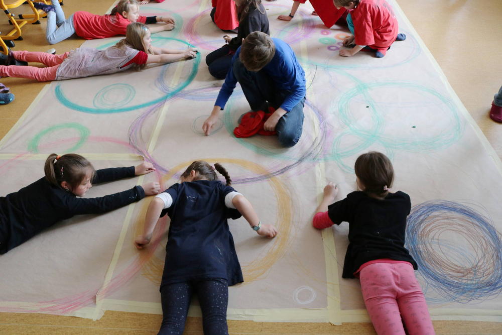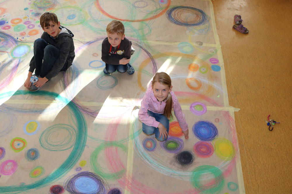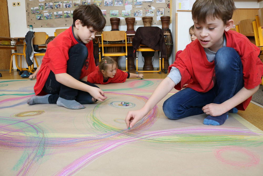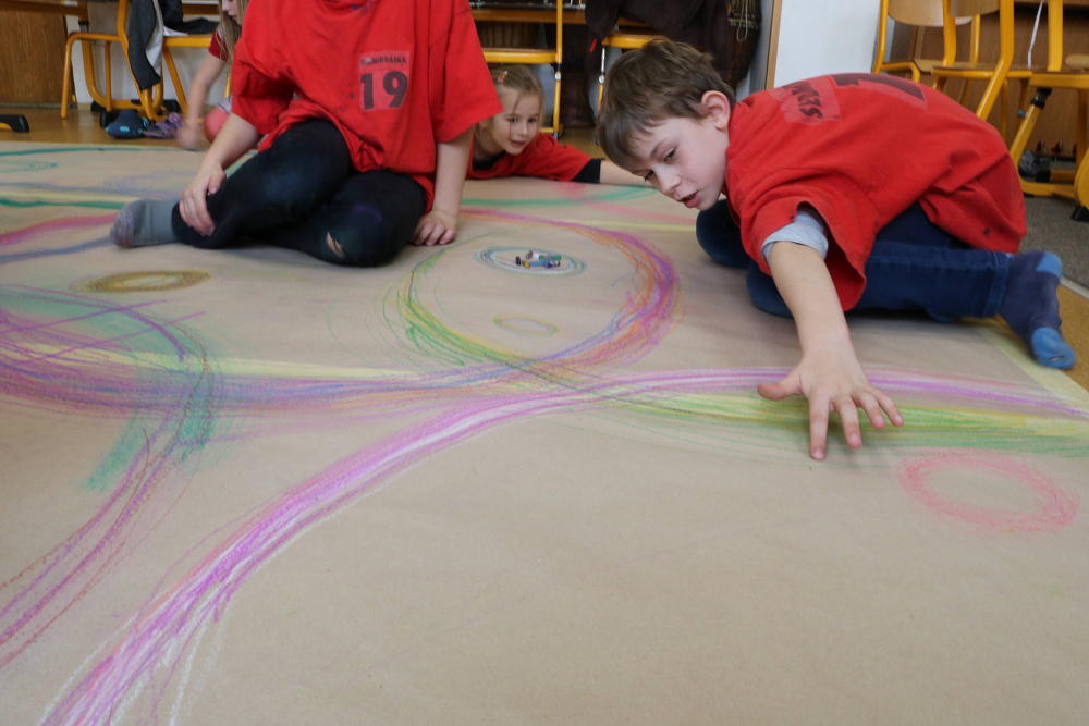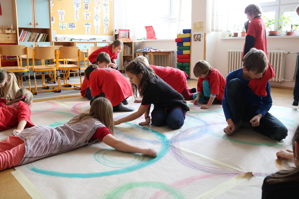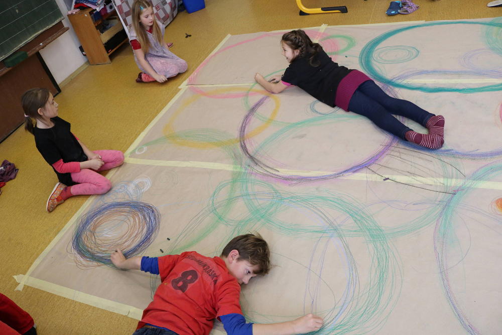 Ve výtvarce jsme nacvičovali na období kružnic v geometrii. Pravda, pojali jsme to dost svobodně, velkoryse a nepřesně, zato s velkou chutí a tvůrčím zápalem. Přišli jsme na mnoho způsobů, jak využít naše těla, coby kružítka a užili si míchání barev. Společná práce nás bavila a výsledek mile překvapil.