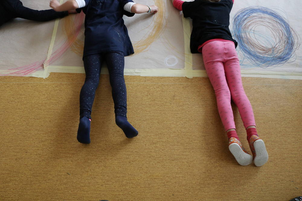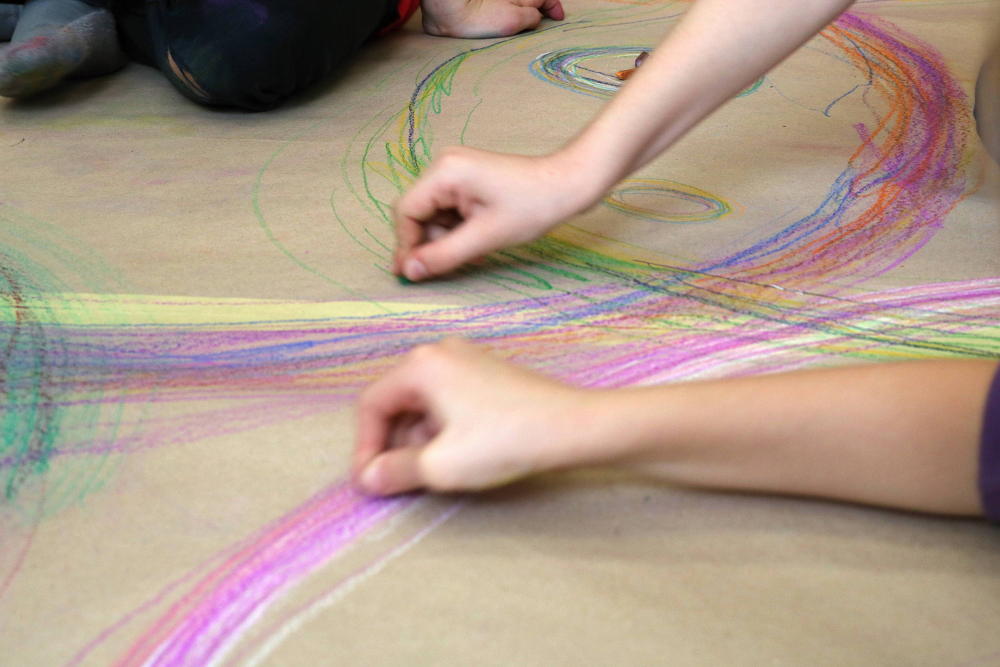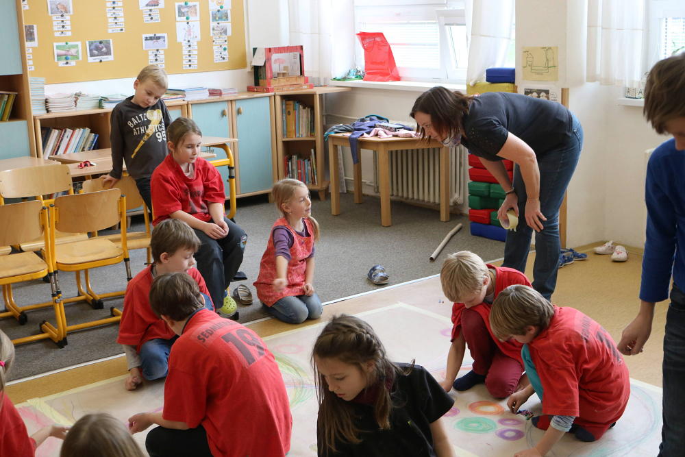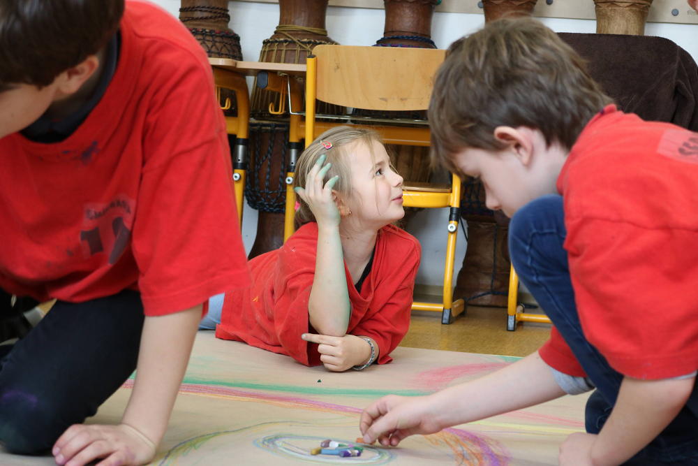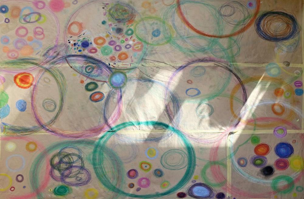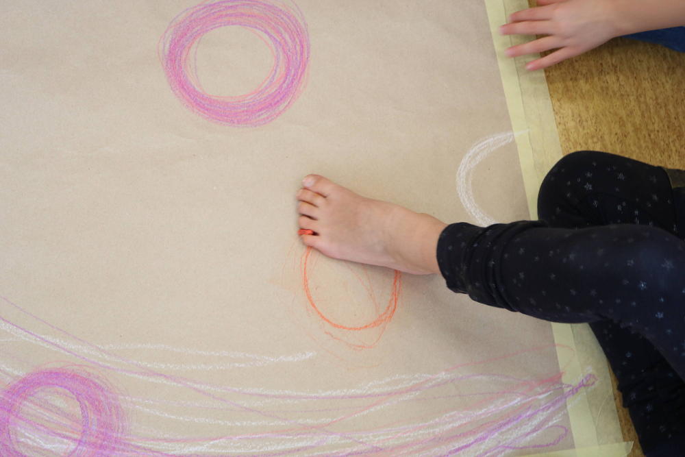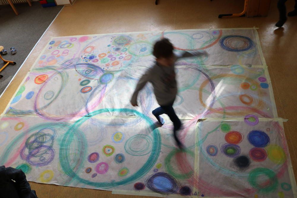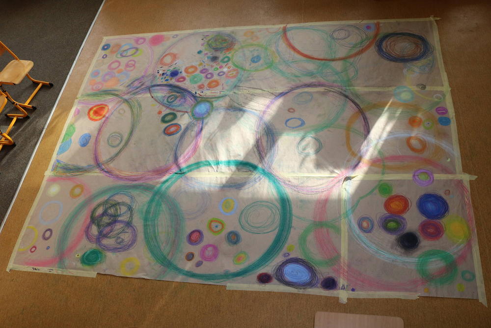 Ve výtvarce jsme nacvičovali na období kružnic v geometrii. Pravda, pojali jsme to dost svobodně, velkoryse a nepřesně, zato s velkou chutí a tvůrčím zápalem. Přišli jsme na mnoho způsobů, jak využít naše těla, coby kružítka a užili si míchání barev. Společná práce nás bavila a výsledek mile překvapil.