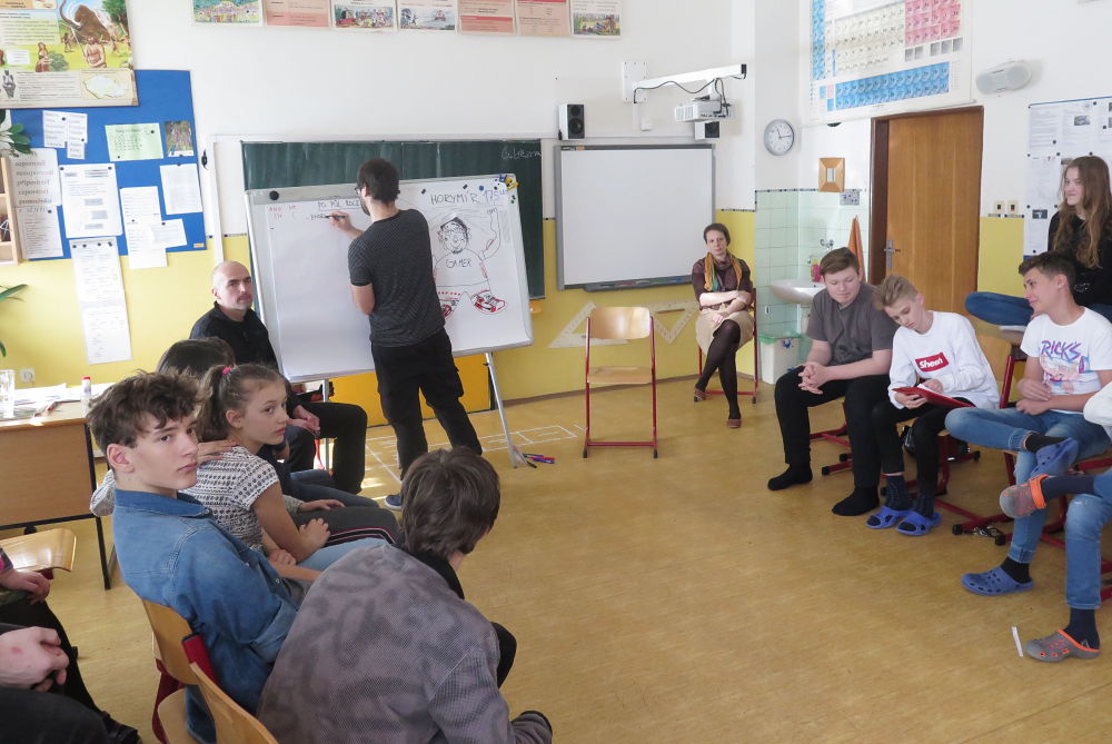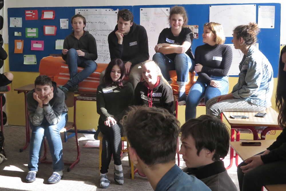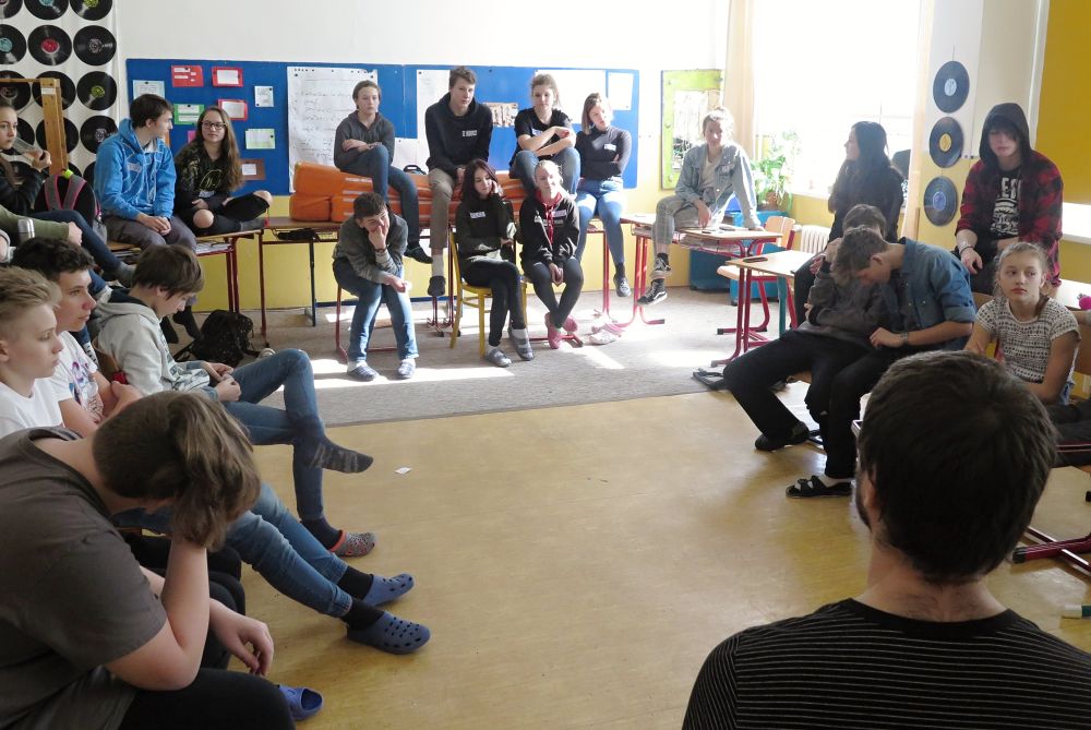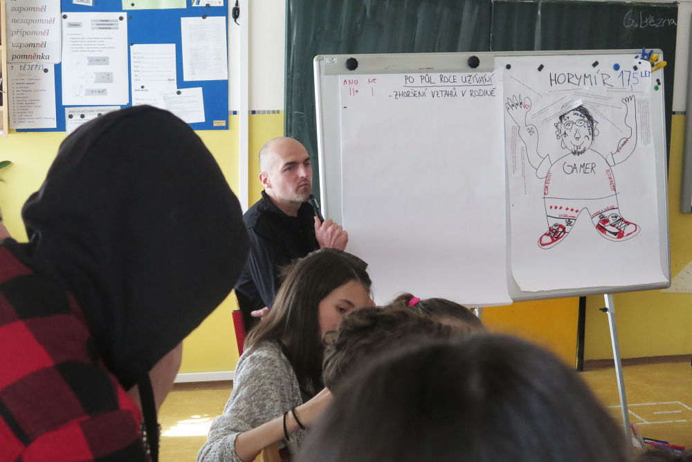 Navštívili nás zaměstnanci z neziskové organizace Agarta ze Vsetína, pracující v terénu s uživateli drog. Žáci 8. a 9. třídy se stali spolutvůrci příběhu o obyčejném chlapci, který se stává závislým. Vžili se do role jeho kamarádů, rodičů, spolužáků, sourozenců, učitelů a přítelkyně. Na začátku příběhu byla zvědavost, ale na konci na nás dopadla tíživá atmosféra. Měli jsme prostor své pocity navzájem sdílet. I když máme informací o drogách dostatek, uvědomili jsme si, že závislost proměňuje a komplikuje vztahy v celém okolí závislého člověka.
