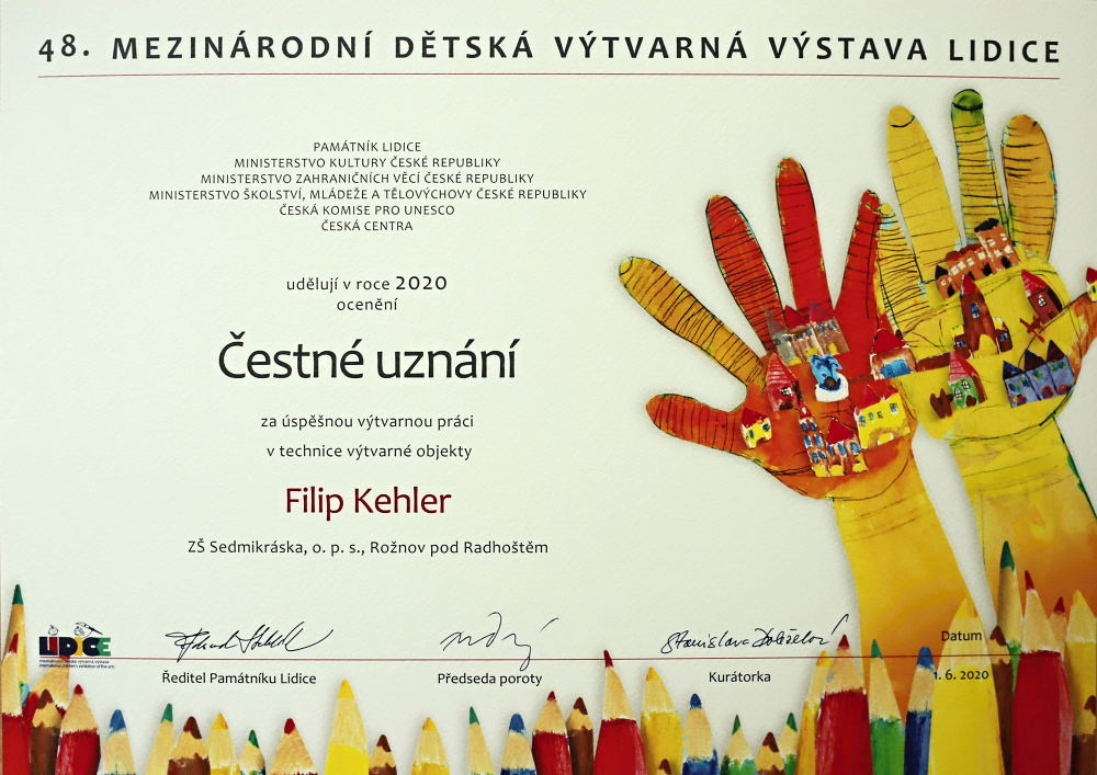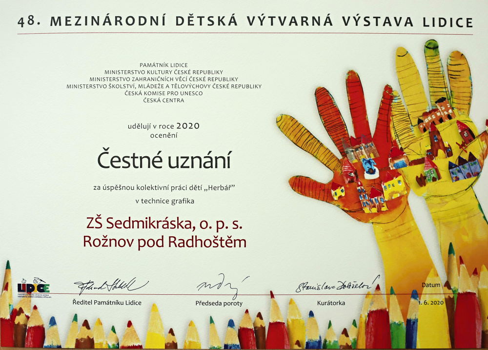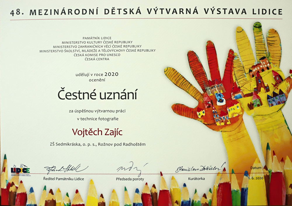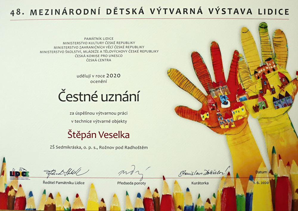 Po zahájení školního roku proběhlo slavnostní předání cen dětem, které na Mezinárodní dětské výstavě v Lidicích zaujaly svými samostatnými i skupinovými díly, malbami, grafikami i fotografiemi. Sedmikráska byla jednou z oceněných základních škol, což svědčí o výborné práci dětí i jejich vedoucích pedagogů. Vzhledem k složité epidemiologické situaci si ceny v Památníku Lidice převzali osobně pouze nositelé individuálních medailí. Rádi se s vámi podělíme o radost krátkou reportáží z akce. Protože část výpravy byla fotografická, ráno jsme si přivstali a prošli si část pietního místa - bývalé osady Lidice. Ranní světlo bylo poetické, ale společně s klidem okolo umocňovalo to, proč jsme se v Lidicích sešli. Na upomínku masakru, který v červnu roku 1942 provedlo gestapo jako odplatu za atentát na zastupujícího říšského protektora R. Heydricha. Na památku zavražděných 82 lidických dětí a na připomenutí dětských obětí válečných konfliktů je pořádána právě Mezinárodní dětská výstava Lidice. Děti kromě účasti na slavnostním předání cen také navštívily řadu naučných a tvořivých aktivit a společně jsme si prošli i celou výstavu. Tímto gratulujeme dalším oceněným holkám a klukům ze Sedmikrásky, kterým jsme z Lidic přivezli ceny! A můžeme tvořit na další, již 49. ročník MDVV Lidice. Tématem tohoto ročníku bude Robot a umělá inteligence.