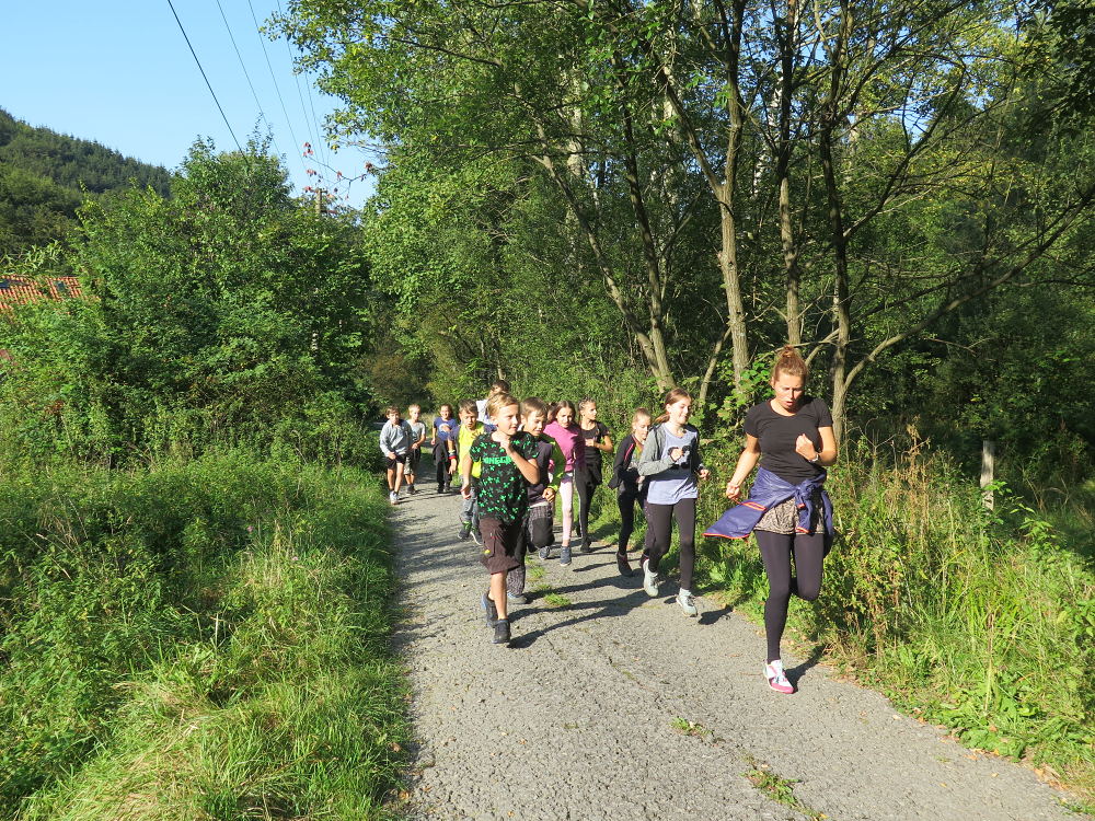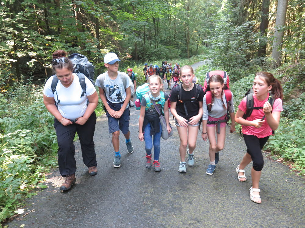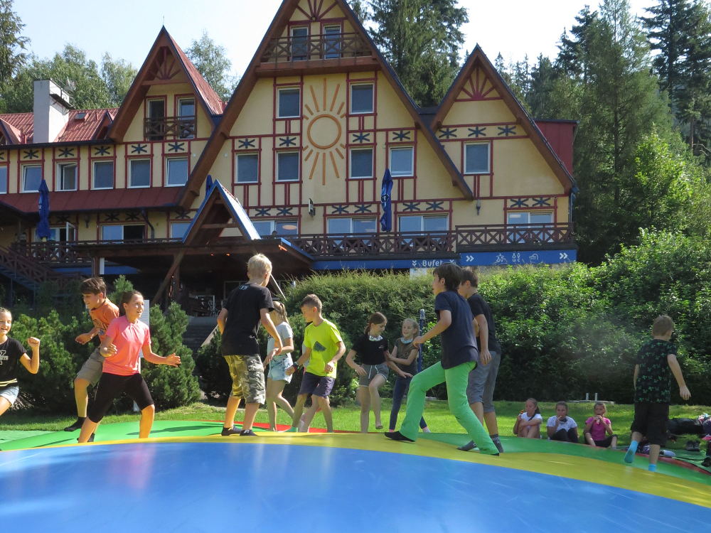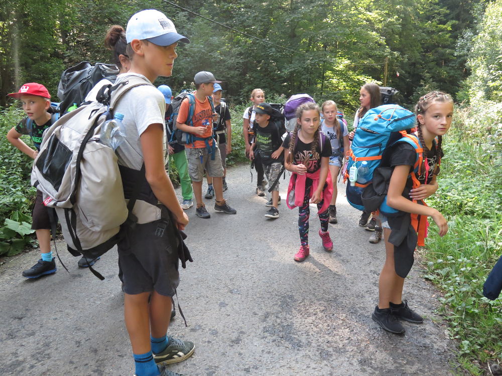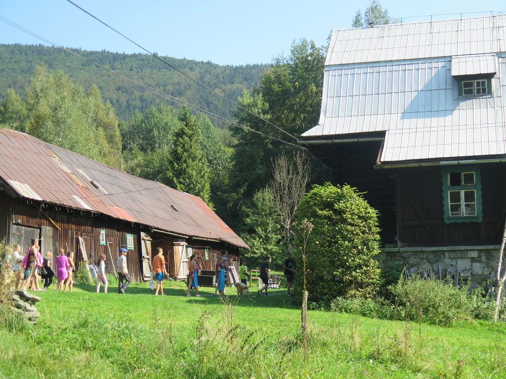 Cestou do Muchovic jsme přestupovali čtyřikrát. Dojeli jsme do Ostravice a pokračovali pěšky. Cestou jsme se zastavili u penzionu. Skákali jsme na obří trampolíně a občerstvili se. Cesta nám připadala náročná a s batohy a ve