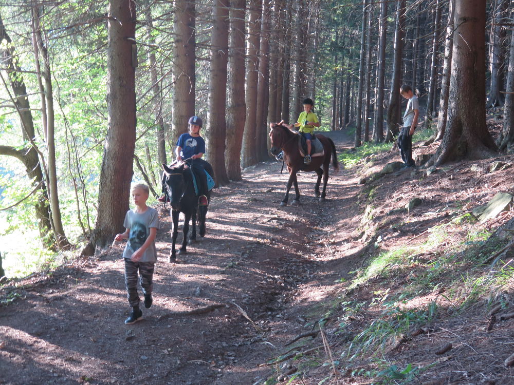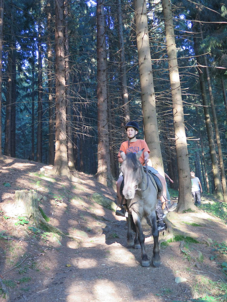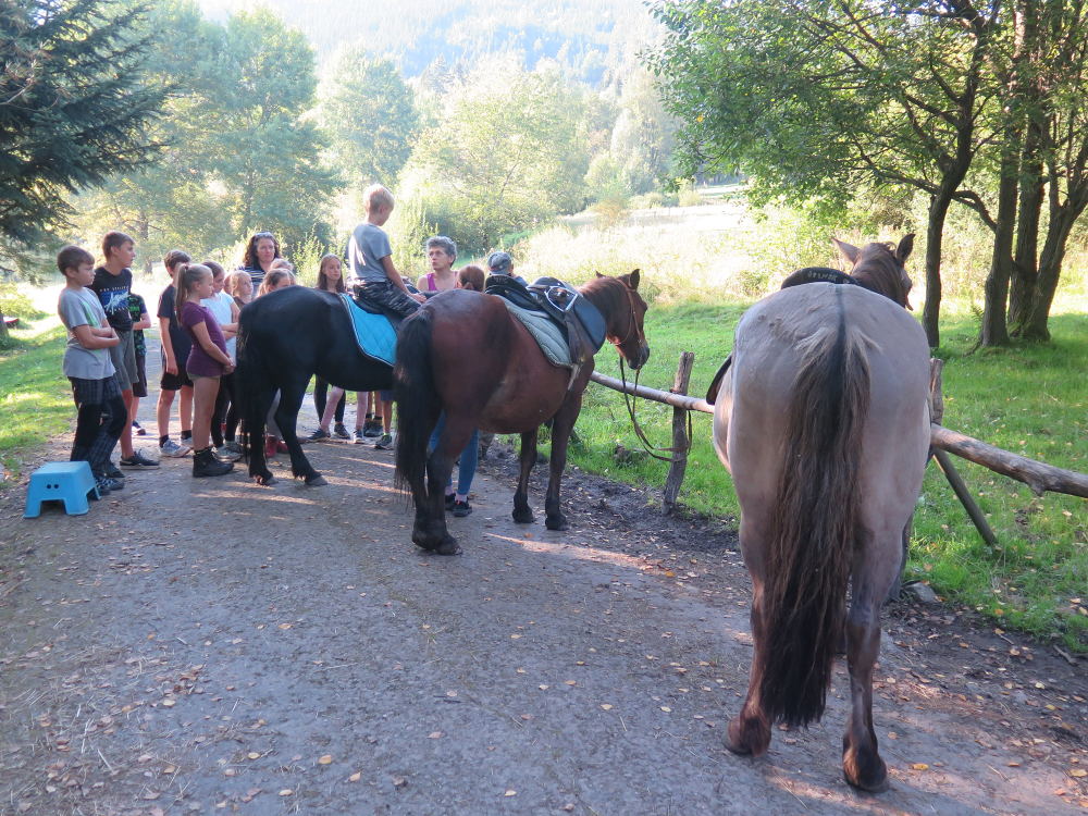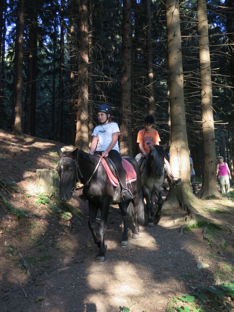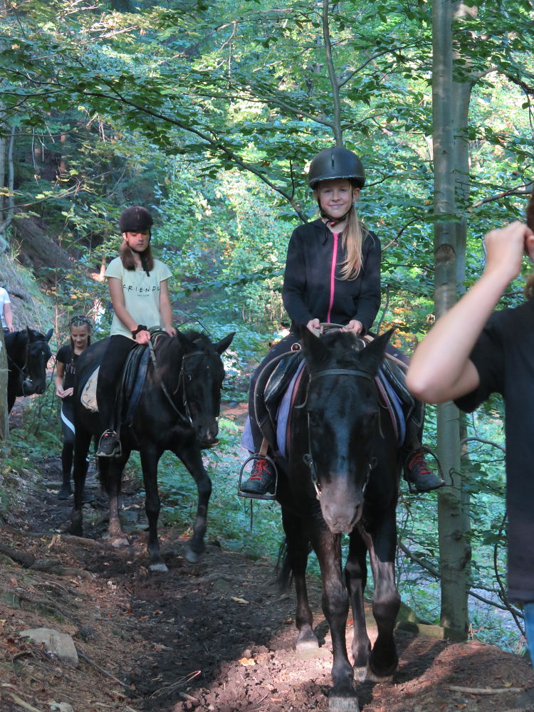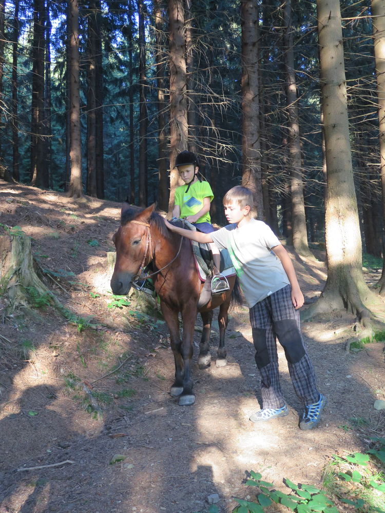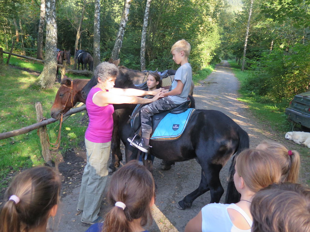 o spolupráci. Paní Šárka nás provedla po pralese. V potoce jsme se mohli koupat, cákat, skákat do tůňky, i když voda byla hodně ledová. Všichni jsme si užili jízdu na koni. Vařili jsme si špagety, guláš, myli nádobí, hráli naše oblíbené