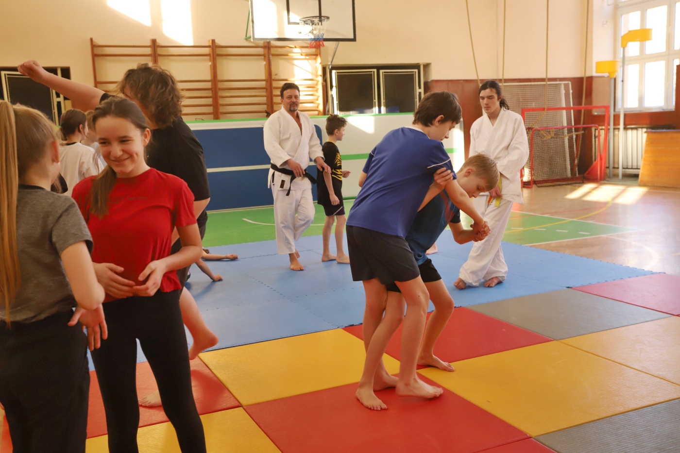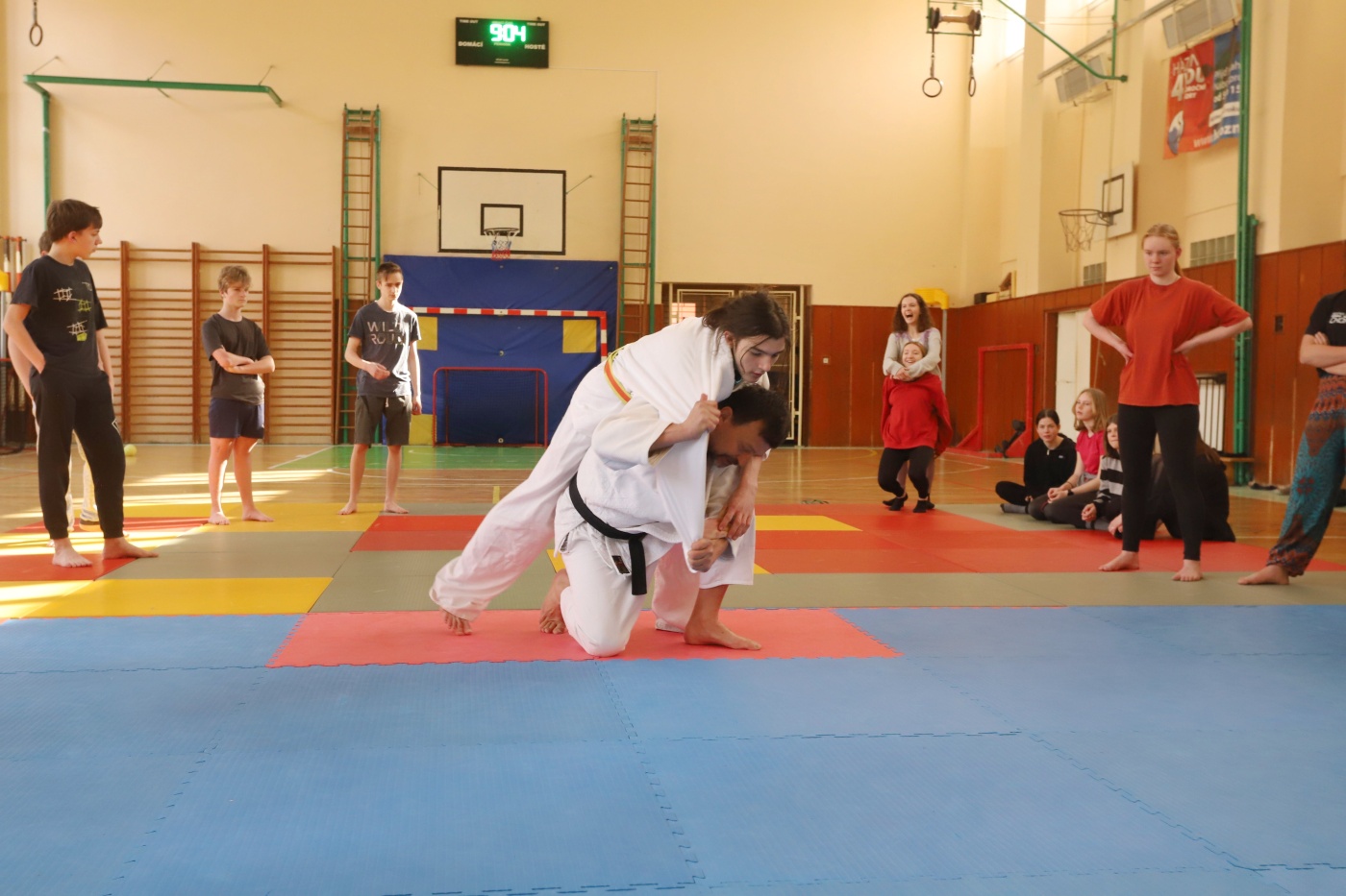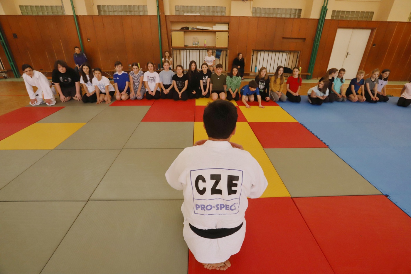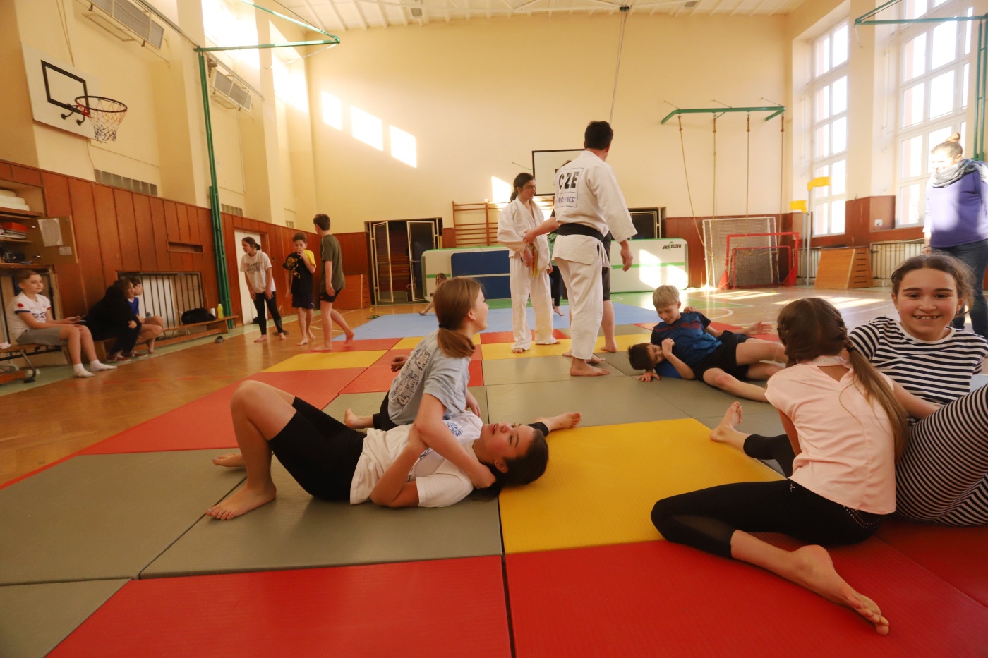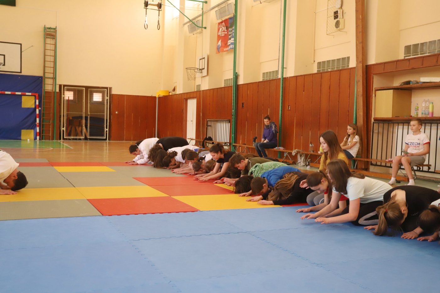 Zazněl pokyn a začal cvičný boj. Snažíme se uplatnit chvaty, které jsme se před chvíli naučili. Třeba ogoši, to znamená přehodit soupeře přes svůj bok. Nebo jinou techniku, kdy je cílem udržet protivníka na podložce. A vydržet, dokud se neozve: "Mate!" A je konec zápasu. Díky setkání s panem Kořínkem jsme si vyzkoušeli základy juda. Protáhli jsme si tělo gymnastickými cviky, naučili se, jak bezpečně padat, posilovat s váhou partnera. Zápasení bylo zcela dobrovolné a zaměřené na obranu. Vše se odehrávalo v rámci filosofie juda o vzájemném respektu. Rozloučili jsme se v judistickém pokleku seisa a uklonili se navzájem. O týden později se k 6. a 7. třídě přidali i osmáci a deváťáci.Děkujeme!