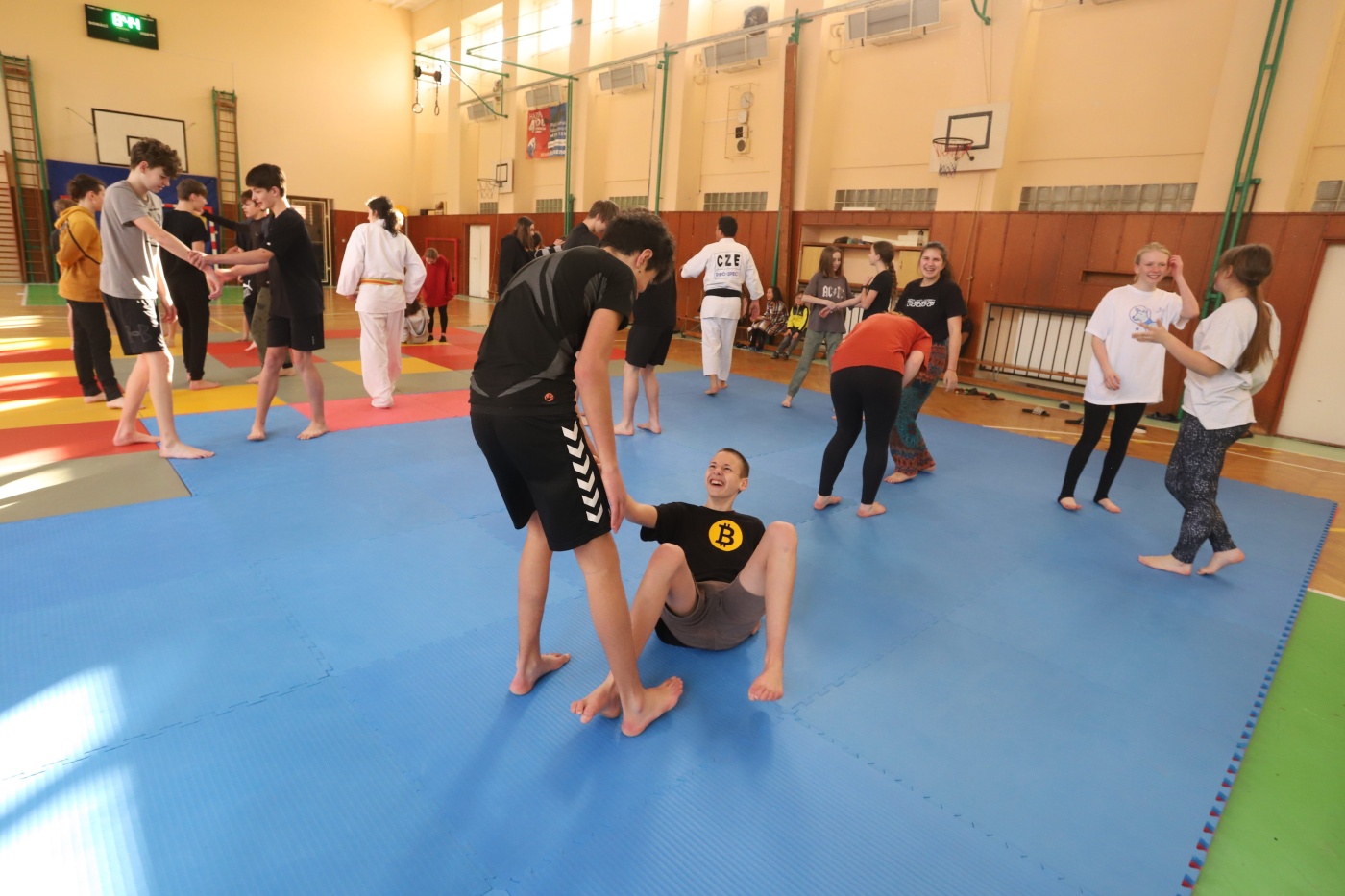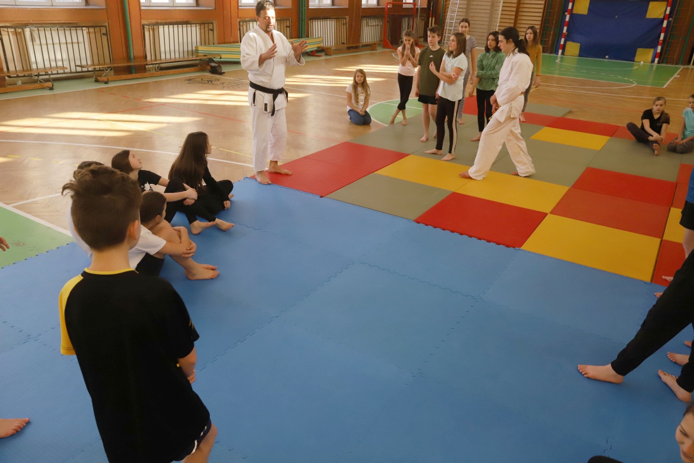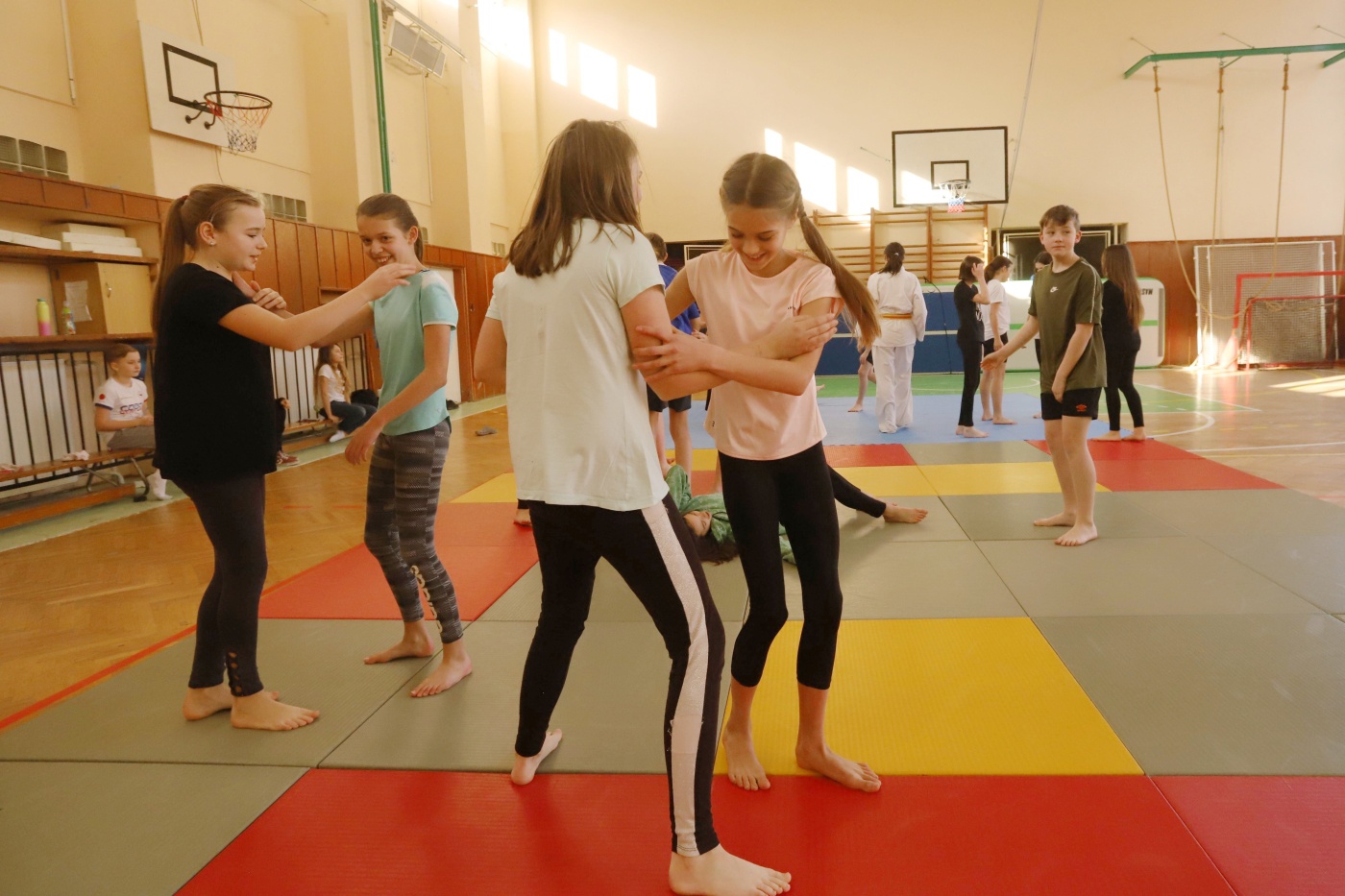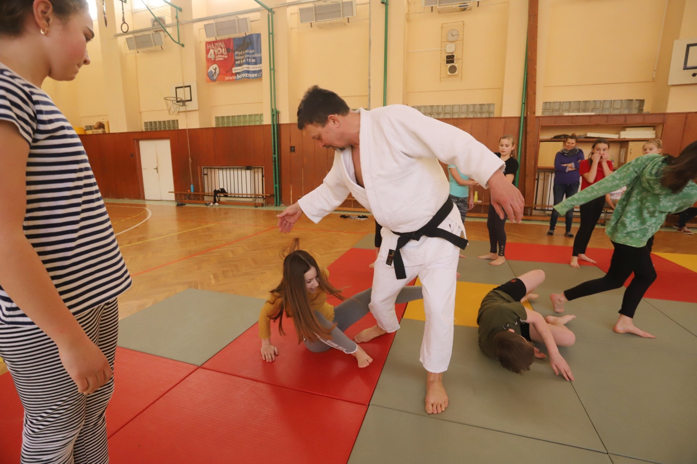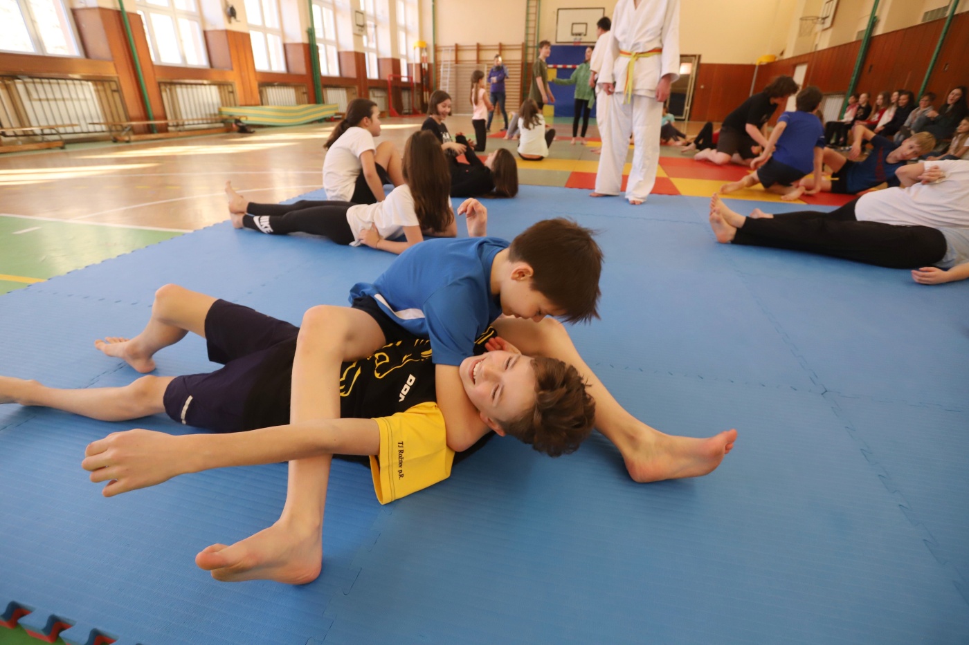 Zazněl pokyn a začal cvičný boj. Snažíme se uplatnit chvaty, které jsme se před chvíli naučili. Třeba ogoši, to znamená přehodit soupeře přes svůj bok. Nebo jinou techniku, kdy je cílem udržet protivníka na podložce. A vydržet, dokud se neozve: "Mate!" A je konec zápasu. Díky setkání s panem Kořínkem jsme si vyzkoušeli základy juda. Protáhli jsme si tělo gymnastickými cviky, naučili se, jak bezpečně padat, posilovat s váhou partnera. Zápasení bylo zcela dobrovolné a zaměřené na obranu. Vše se odehrávalo v rámci filosofie juda o vzájemném respektu. Rozloučili jsme se v judistickém pokleku seisa a uklonili se navzájem. O týden později se k 6. a 7. třídě přidali i osmáci a deváťáci.Děkujeme!