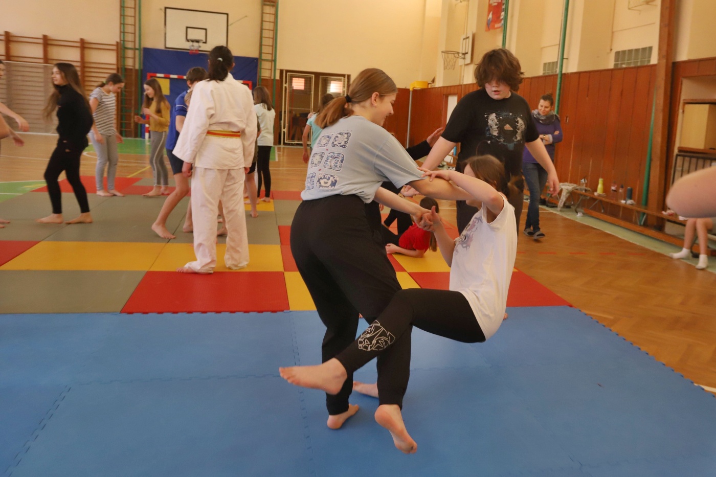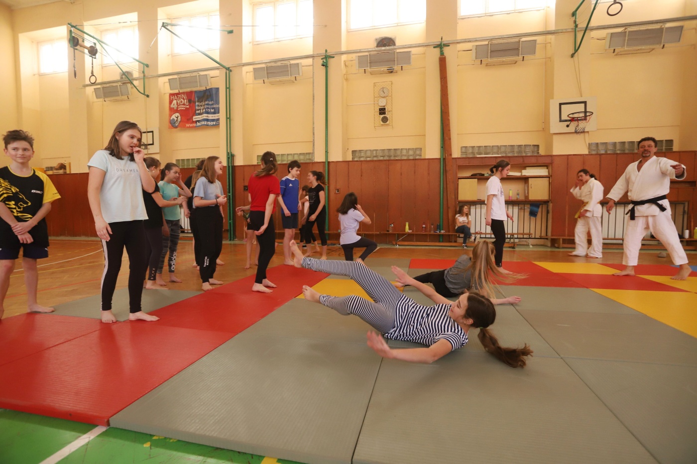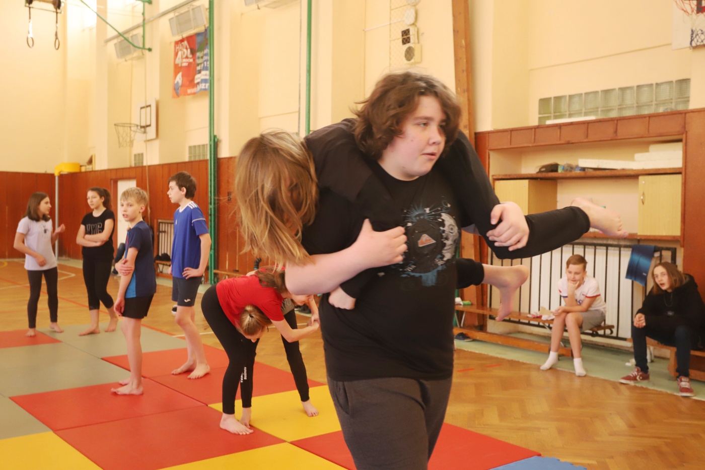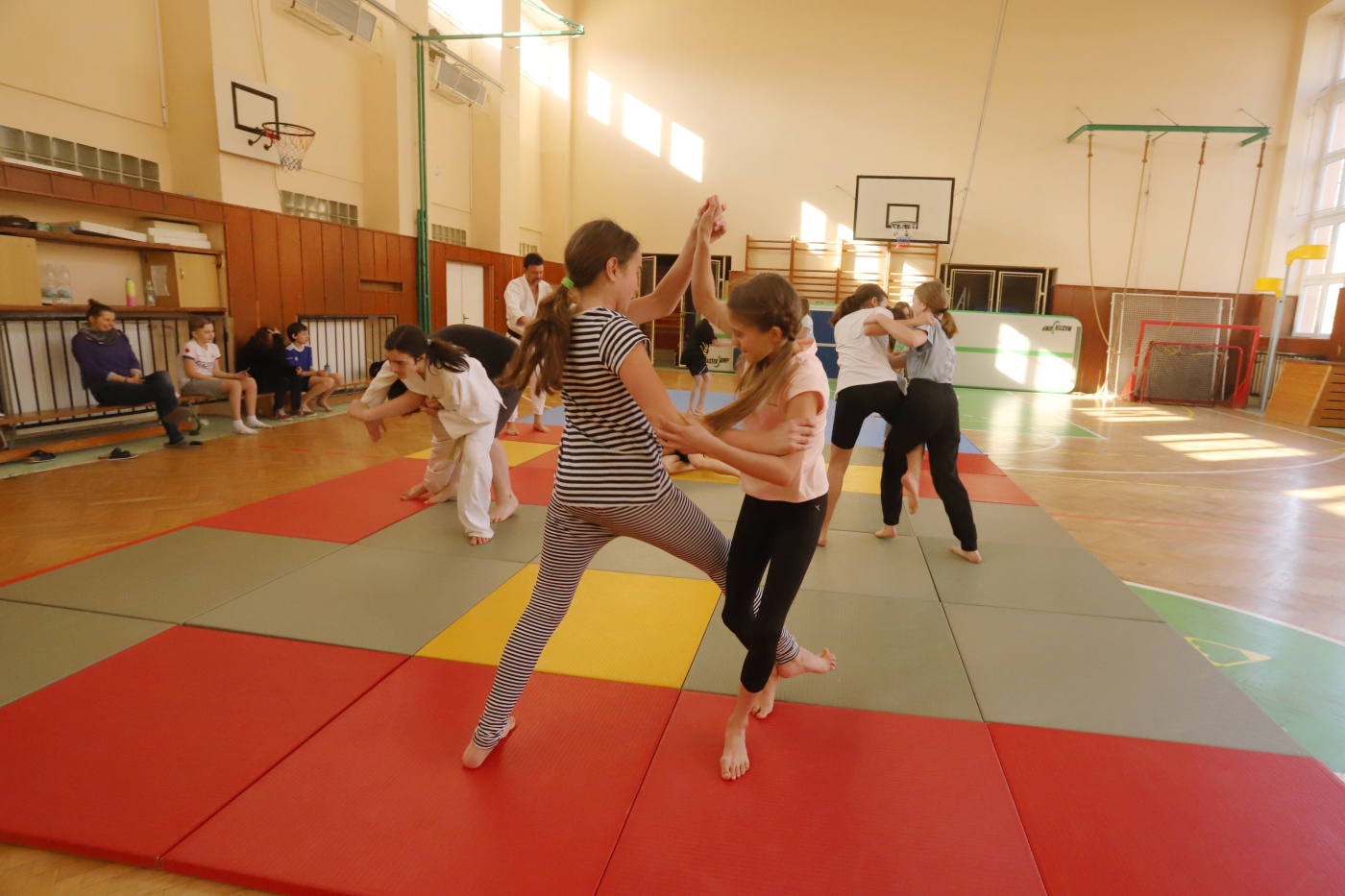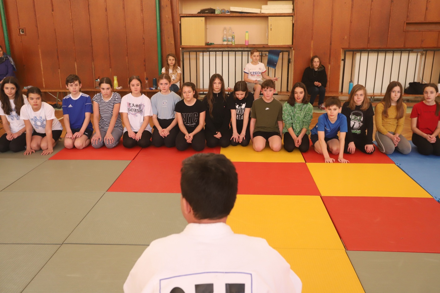 Zazněl pokyn a začal cvičný boj. Snažíme se uplatnit chvaty, které jsme se před chvíli naučili. Třeba ogoši, to znamená přehodit soupeře přes svůj bok. Nebo jinou techniku, kdy je cílem udržet protivníka na podložce. A vydržet, dokud se neozve: "Mate!" A je konec zápasu. Díky setkání s panem Kořínkem jsme si vyzkoušeli základy juda. Protáhli jsme si tělo gymnastickými cviky, naučili se, jak bezpečně padat, posilovat s váhou partnera. Zápasení bylo zcela dobrovolné a zaměřené na obranu. Vše se odehrávalo v rámci filosofie juda o vzájemném respektu. Rozloučili jsme se v judistickém pokleku seisa a uklonili se navzájem. O týden později se k 6. a 7. třídě přidali i osmáci a deváťáci.Děkujeme!