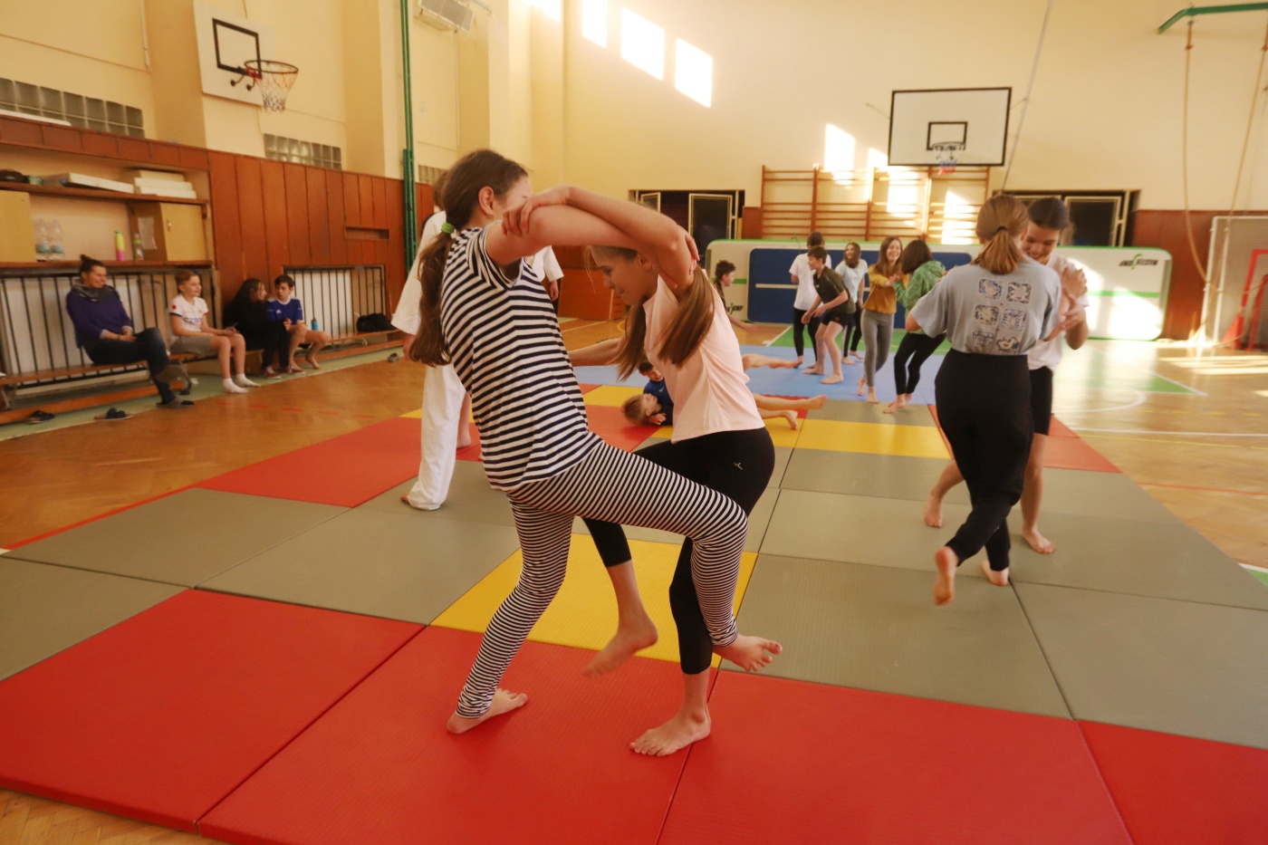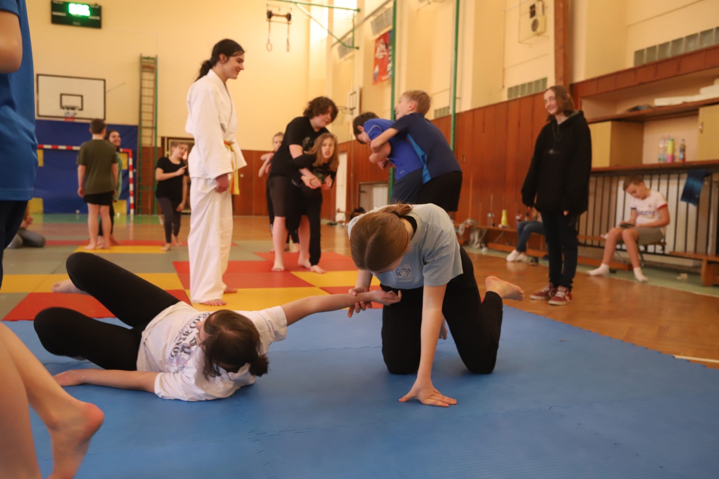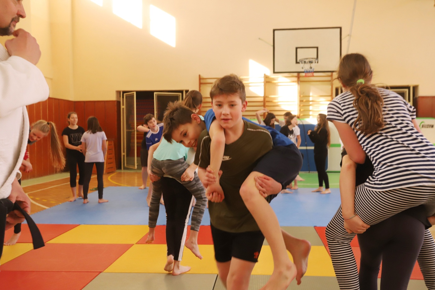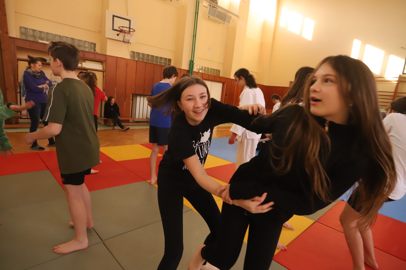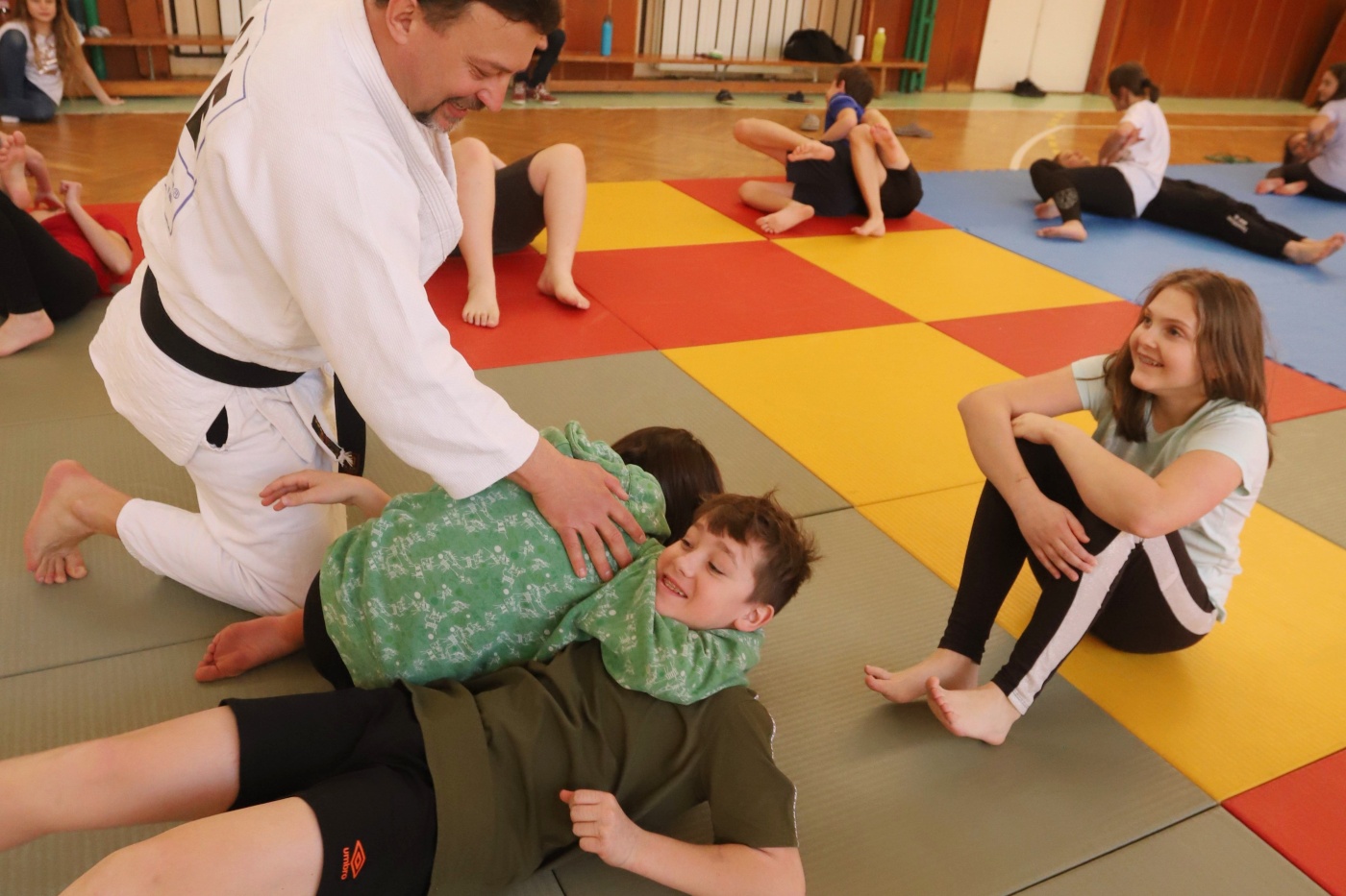 Zazněl pokyn a začal cvičný boj. Snažíme se uplatnit chvaty, které jsme se před chvíli naučili. Třeba ogoši, to znamená přehodit soupeře přes svůj bok. Nebo jinou techniku, kdy je cílem udržet protivníka na podložce. A vydržet, dokud se neozve: "Mate!" A je konec zápasu. Díky setkání s panem Kořínkem jsme si vyzkoušeli základy juda. Protáhli jsme si tělo gymnastickými cviky, naučili se, jak bezpečně padat, posilovat s váhou partnera. Zápasení bylo zcela dobrovolné a zaměřené na obranu. Vše se odehrávalo v rámci filosofie juda o vzájemném respektu. Rozloučili jsme se v judistickém pokleku seisa a uklonili se navzájem. O týden později se k 6. a 7. třídě přidali i osmáci a deváťáci.Děkujeme!