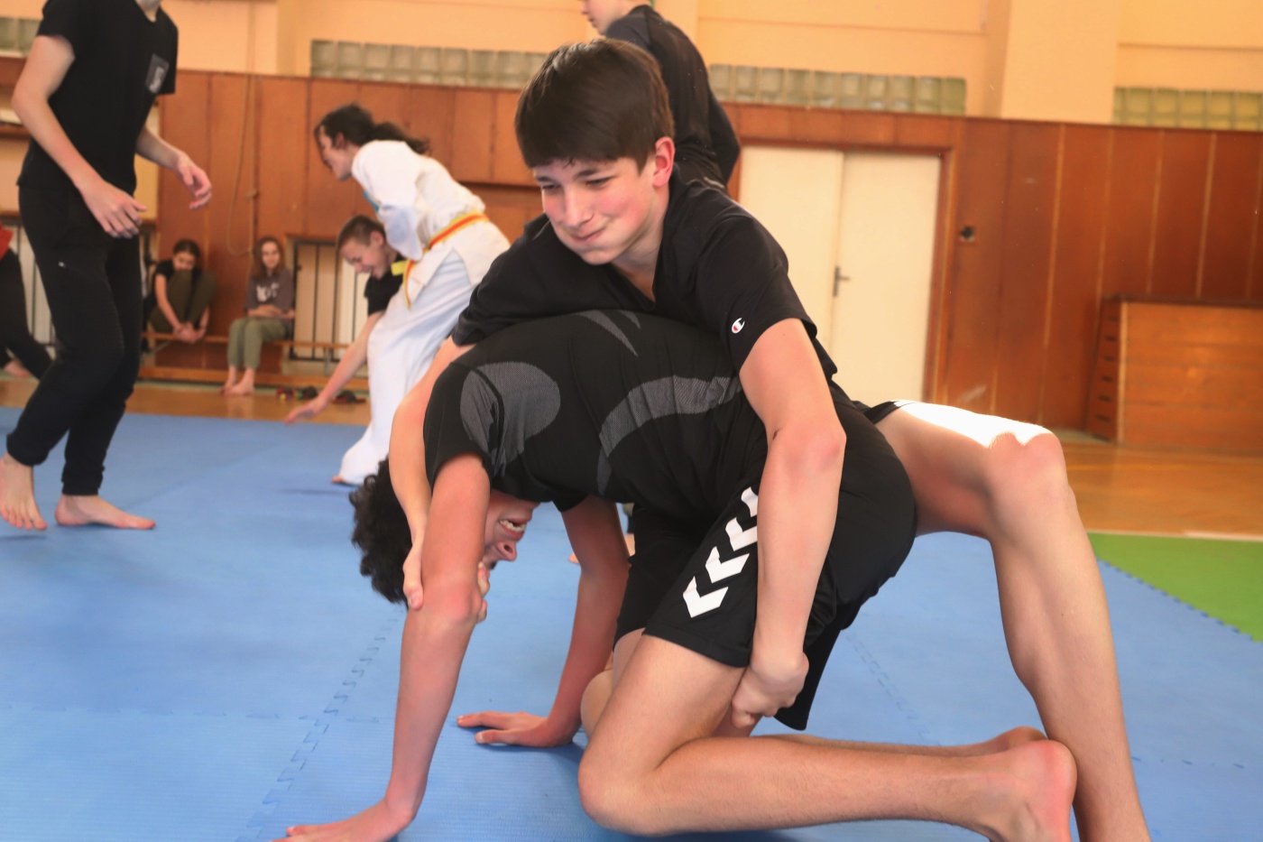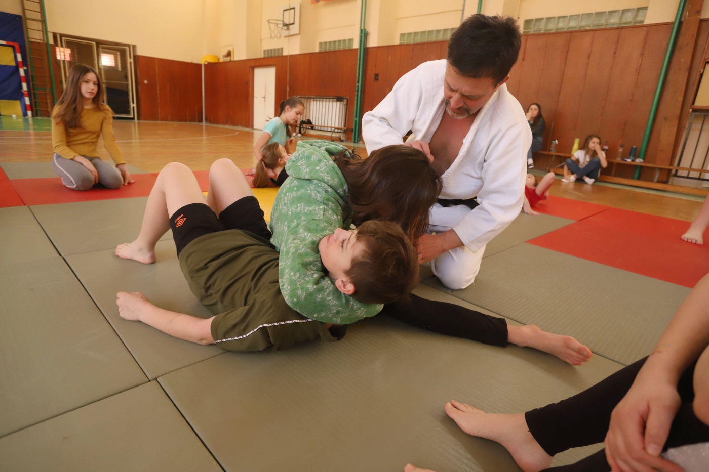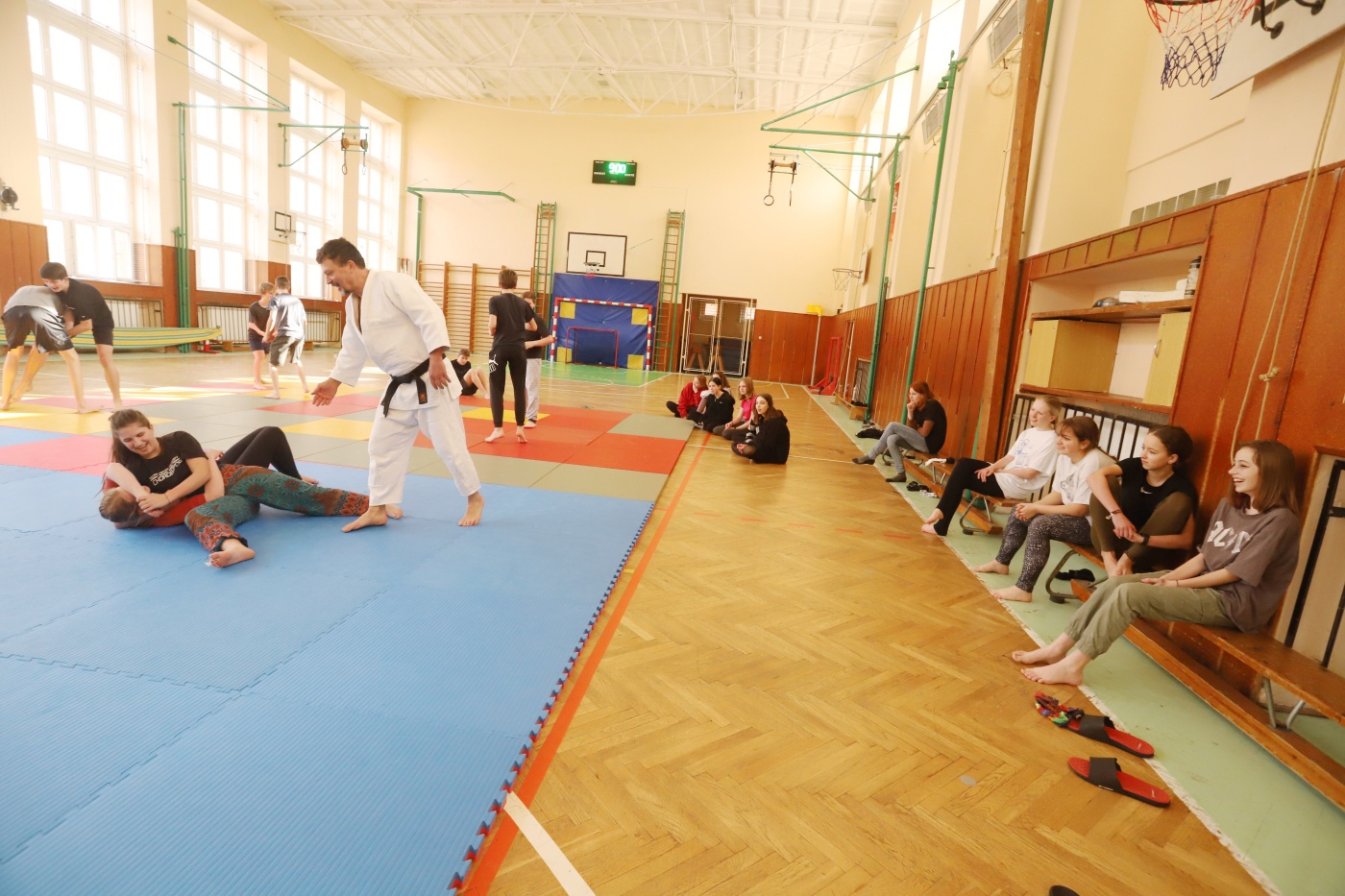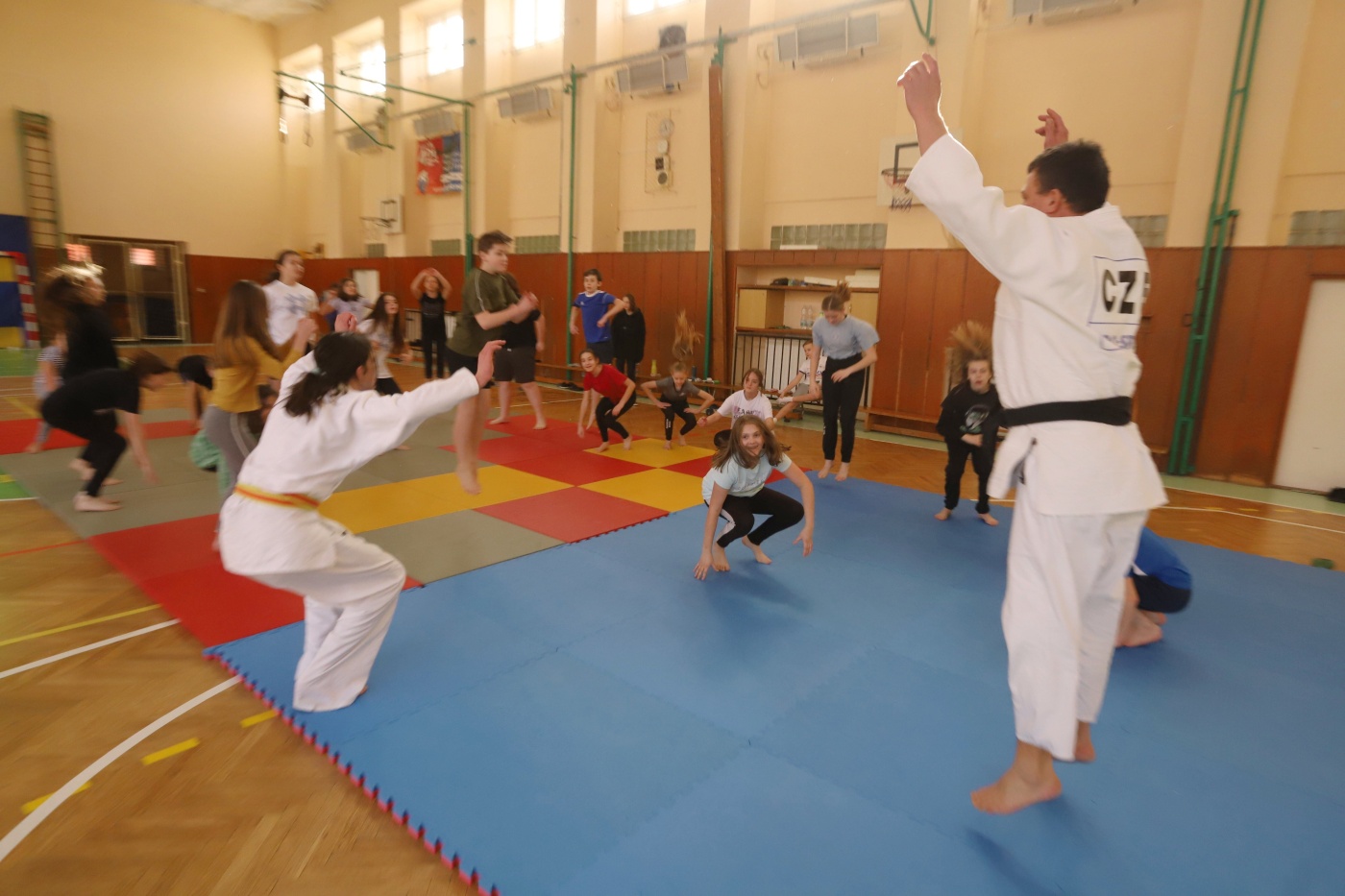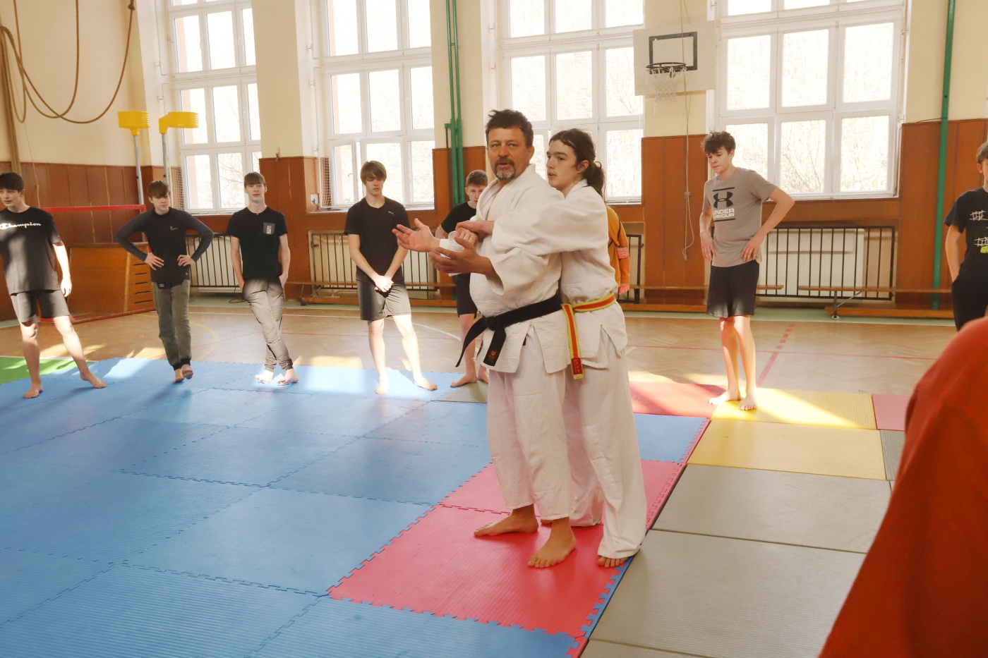 Zazněl pokyn a začal cvičný boj. Snažíme se uplatnit chvaty, které jsme se před chvíli naučili. Třeba ogoši, to znamená přehodit soupeře přes svůj bok. Nebo jinou techniku, kdy je cílem udržet protivníka na podložce. A vydržet, dokud se neozve: "Mate!" A je konec zápasu. Díky setkání s panem Kořínkem jsme si vyzkoušeli základy juda. Protáhli jsme si tělo gymnastickými cviky, naučili se, jak bezpečně padat, posilovat s váhou partnera. Zápasení bylo zcela dobrovolné a zaměřené na obranu. Vše se odehrávalo v rámci filosofie juda o vzájemném respektu. Rozloučili jsme se v judistickém pokleku seisa a uklonili se navzájem. O týden později se k 6. a 7. třídě přidali i osmáci a deváťáci.Děkujeme!