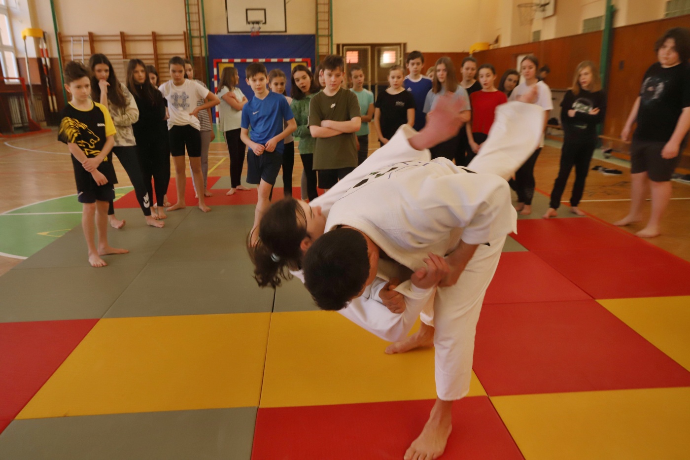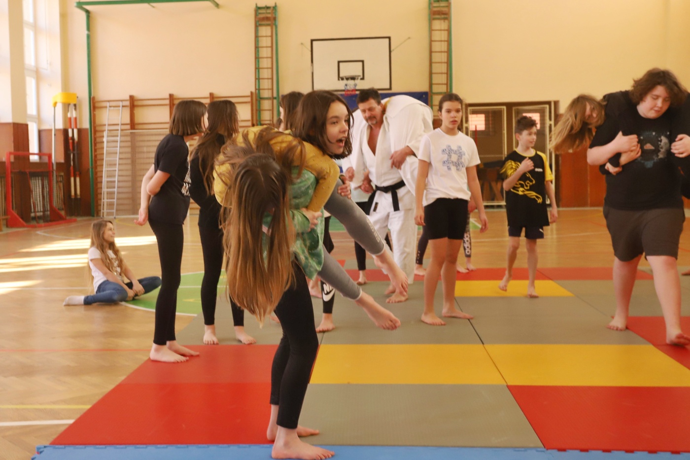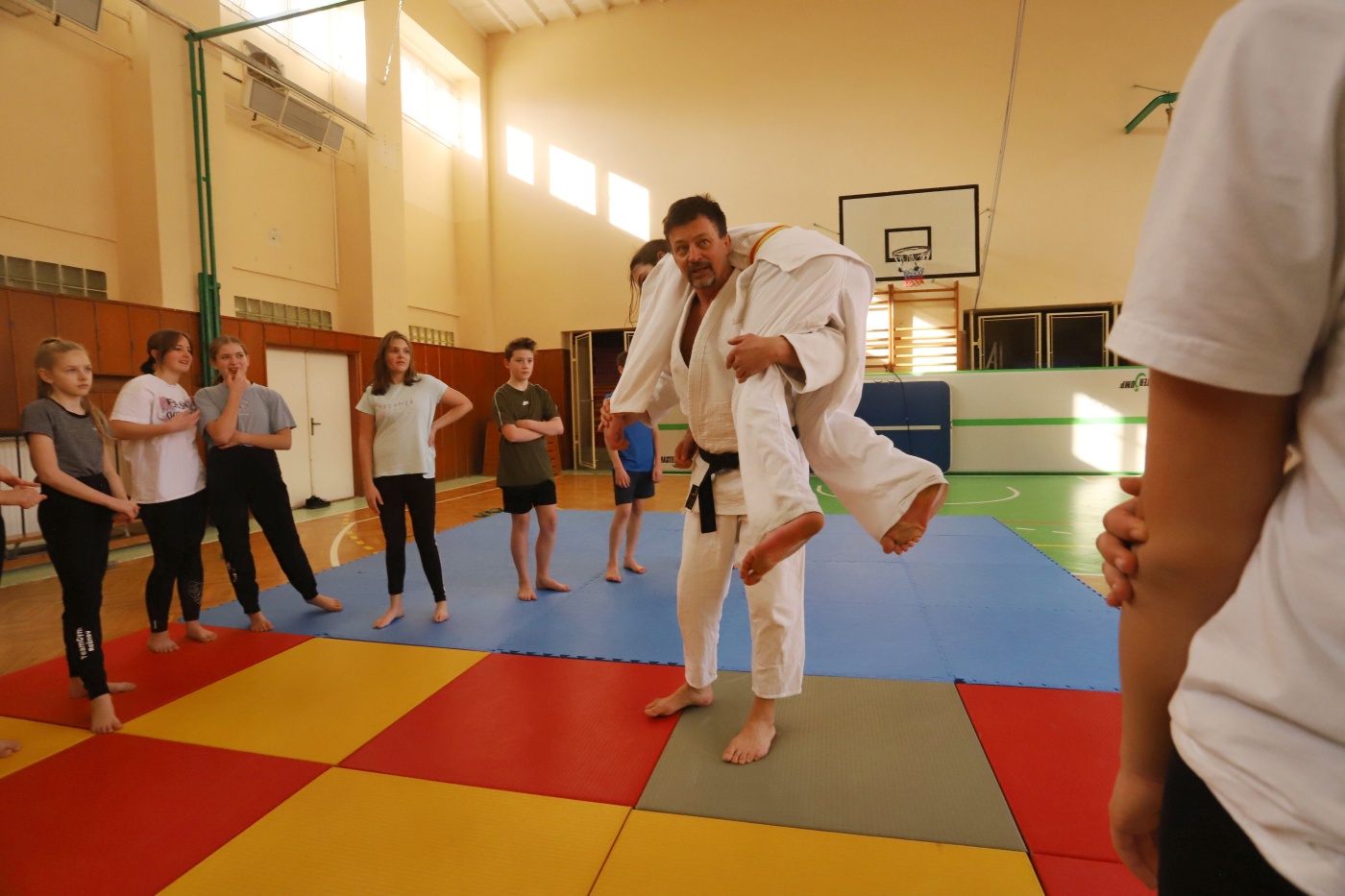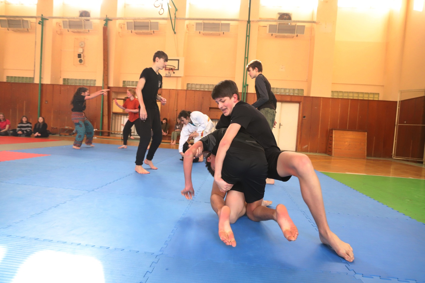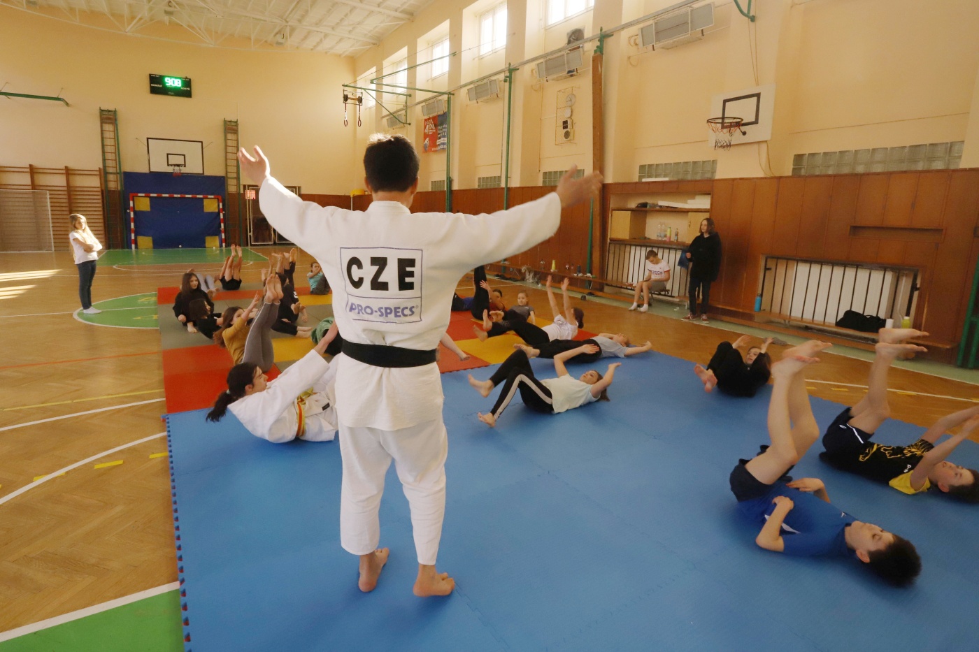 Zazněl pokyn a začal cvičný boj. Snažíme se uplatnit chvaty, které jsme se před chvíli naučili. Třeba ogoši, to znamená přehodit soupeře přes svůj bok. Nebo jinou techniku, kdy je cílem udržet protivníka na podložce. A vydržet, dokud se neozve: "Mate!" A je konec zápasu. Díky setkání s panem Kořínkem jsme si vyzkoušeli základy juda. Protáhli jsme si tělo gymnastickými cviky, naučili se, jak bezpečně padat, posilovat s váhou partnera. Zápasení bylo zcela dobrovolné a zaměřené na obranu. Vše se odehrávalo v rámci filosofie juda o vzájemném respektu. Rozloučili jsme se v judistickém pokleku seisa a uklonili se navzájem. O týden později se k 6. a 7. třídě přidali i osmáci a deváťáci.Děkujeme!