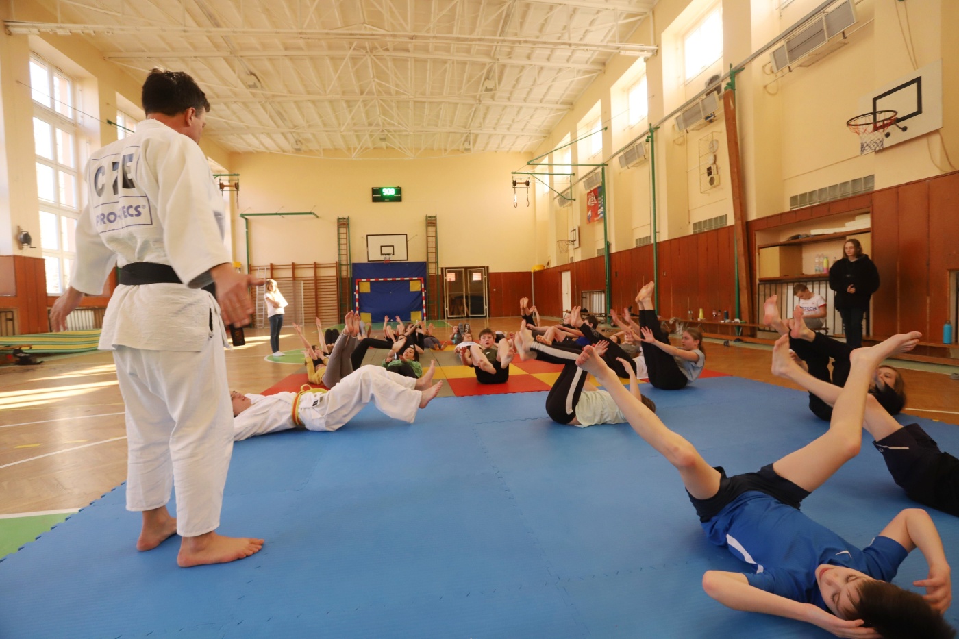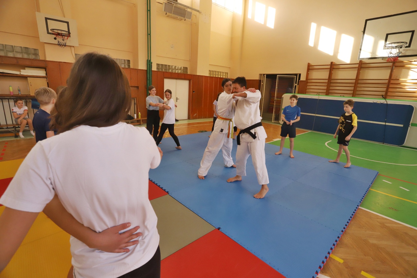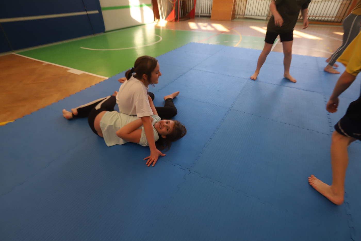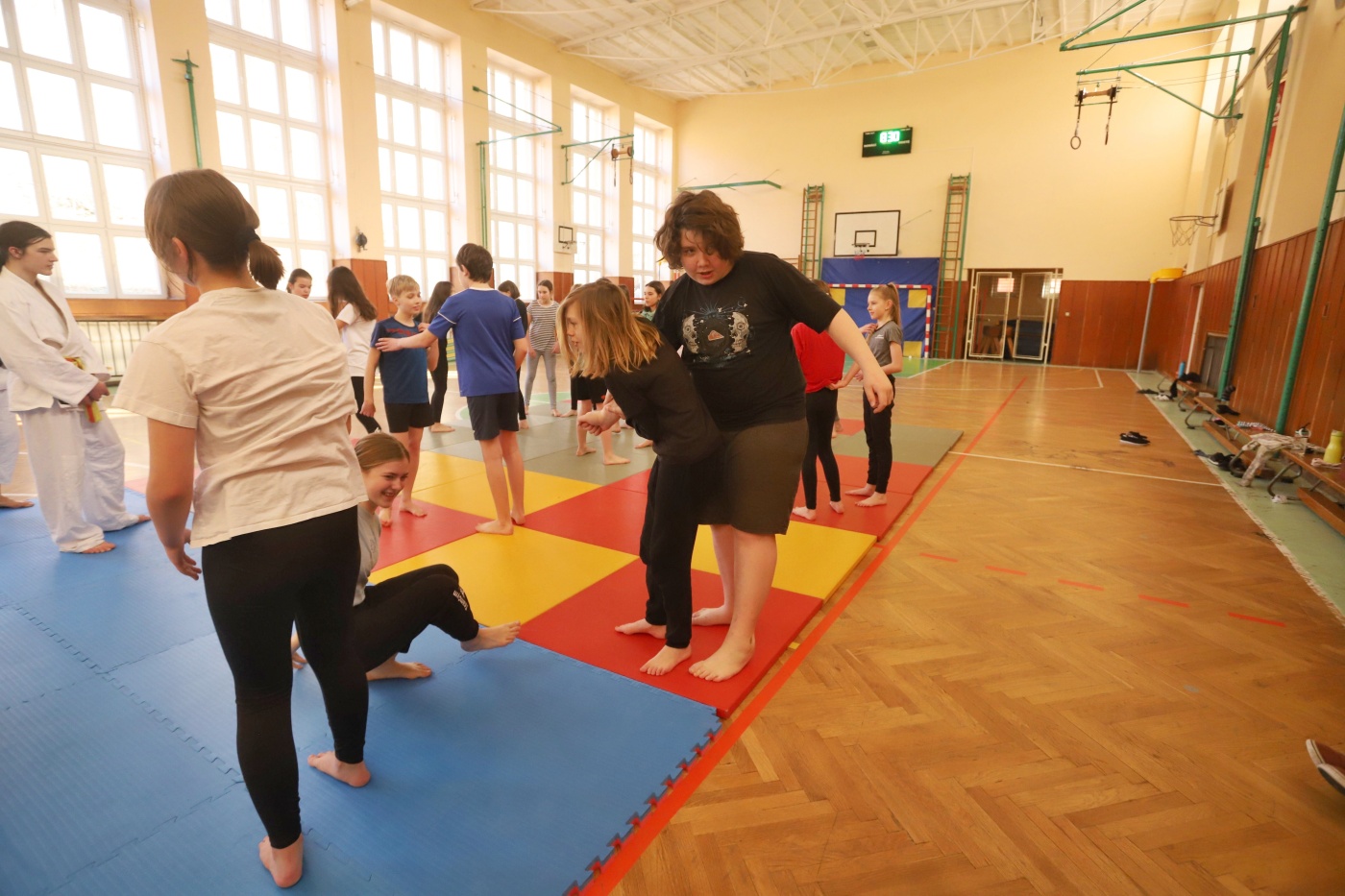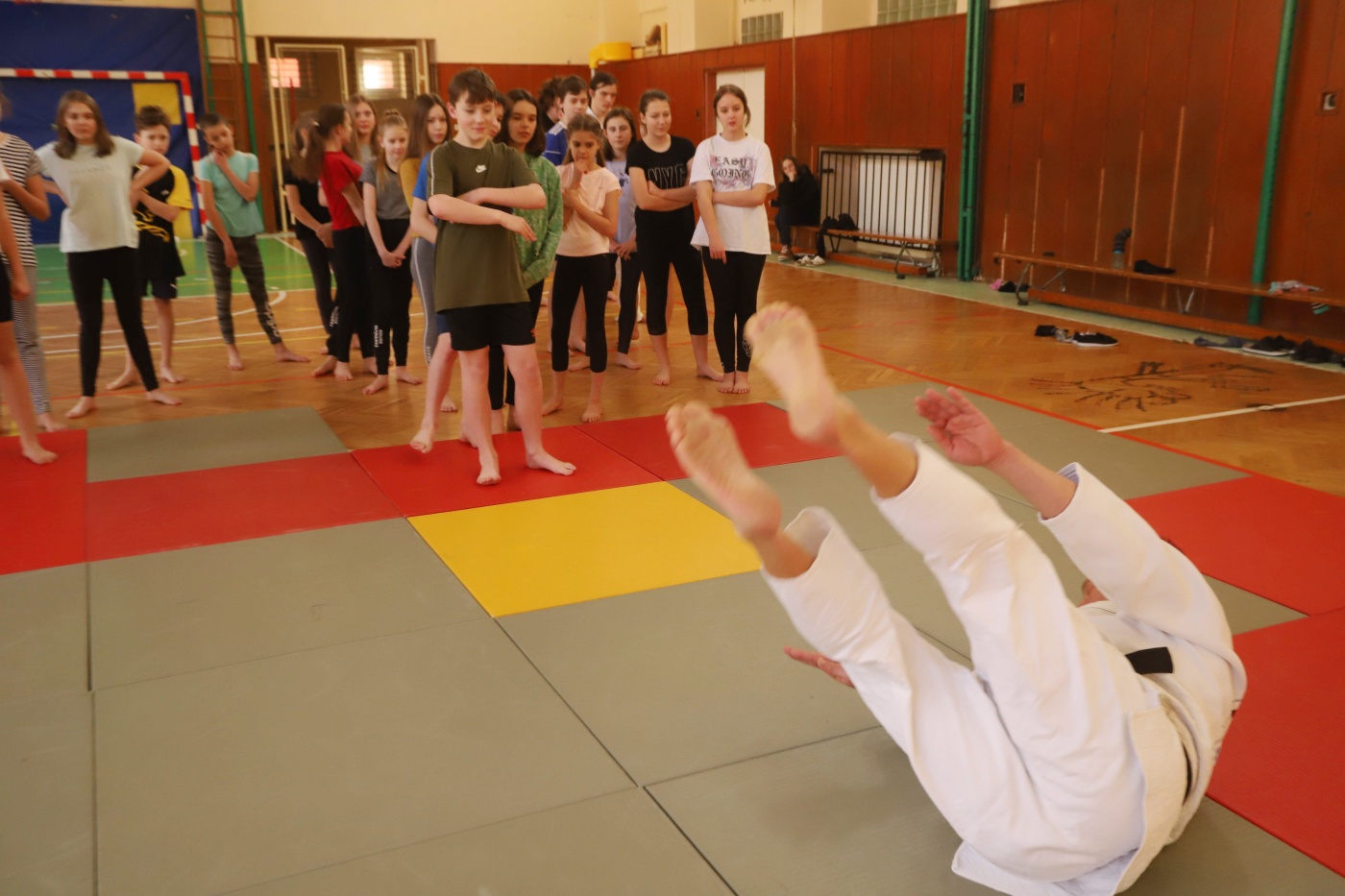 Zazněl pokyn a začal cvičný boj. Snažíme se uplatnit chvaty, které jsme se před chvíli naučili. Třeba ogoši, to znamená přehodit soupeře přes svůj bok. Nebo jinou techniku, kdy je cílem udržet protivníka na podložce. A vydržet, dokud se neozve: "Mate!" A je konec zápasu. Díky setkání s panem Kořínkem jsme si vyzkoušeli základy juda. Protáhli jsme si tělo gymnastickými cviky, naučili se, jak bezpečně padat, posilovat s váhou partnera. Zápasení bylo zcela dobrovolné a zaměřené na obranu. Vše se odehrávalo v rámci filosofie juda o vzájemném respektu. Rozloučili jsme se v judistickém pokleku seisa a uklonili se navzájem. O týden později se k 6. a 7. třídě přidali i osmáci a deváťáci.Děkujeme!