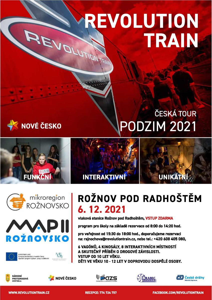 Po dobrých zkušenostech z minulých let jsme uvítali možnost spolu s žáky 8. a 9. ročníku navštívit protidrogový program REVOLUTION TRAIN. Na rožnovském nádraží byl přistaven speciální vlak. V každém vagónu žáky čekal kousek zfilmovaného příběhu, který byl inspirován skutečnými událostmi a reálnými osudy lidí ovlivněných drogovou závislostí. Pořad byl interaktivní, po zhlédnutí každé části filmu se žáci zamýšleli, jak by se v daném okamžiku rozhodovali oni, a také se pokoušeli předvídat, jak bude příběh pokračovat. Druhé části vagónů, jimiž žáci procházeli po zhlédnutí filmových sekvencí, pak byly vybaveny realisticky působícími kulisami ztvárňujícími některé důležité místo, v němž se příběh filmu odehrával - bar, policejní vyšetřovnu, vězení, vybydlený byt. Hodina a půl vyhrazená programu rychle utekla a všichni se shodli, že by návštěvu akce doporučili i ostatním.